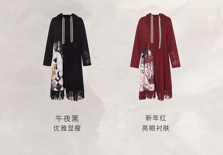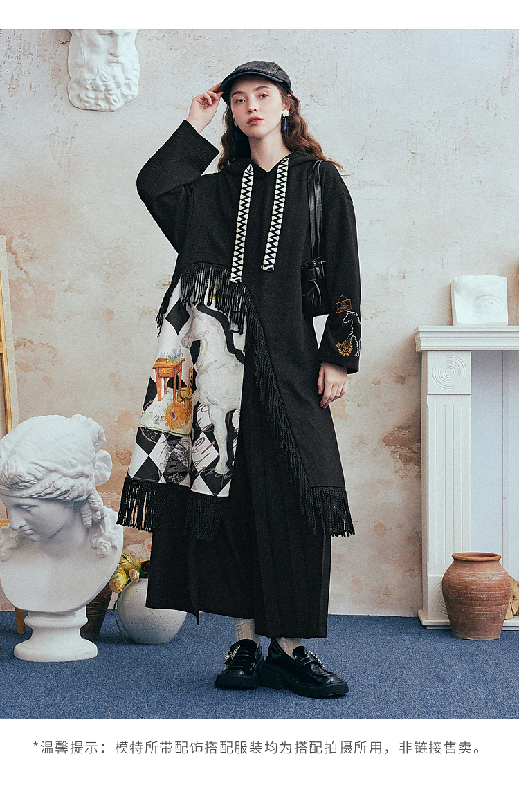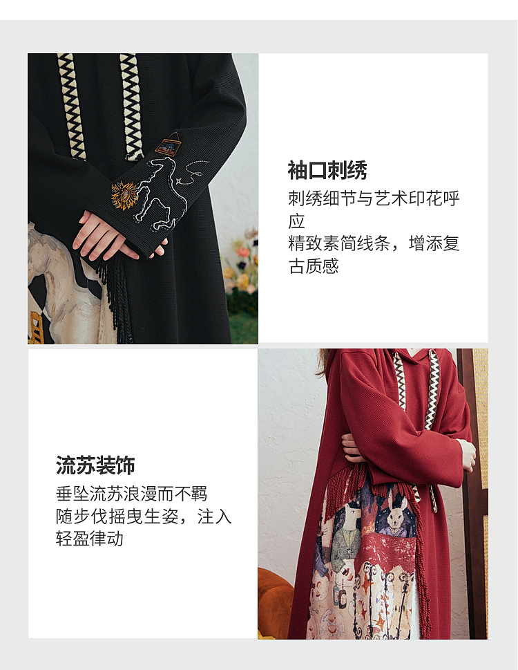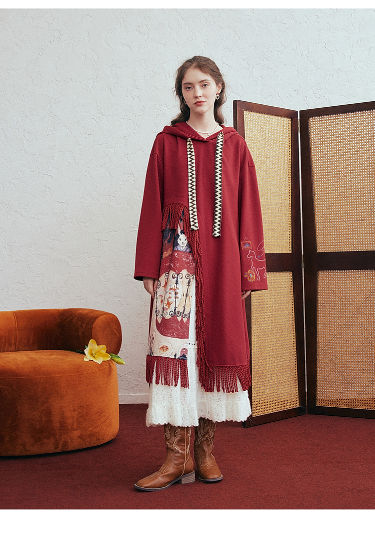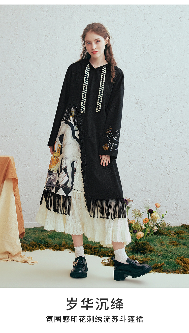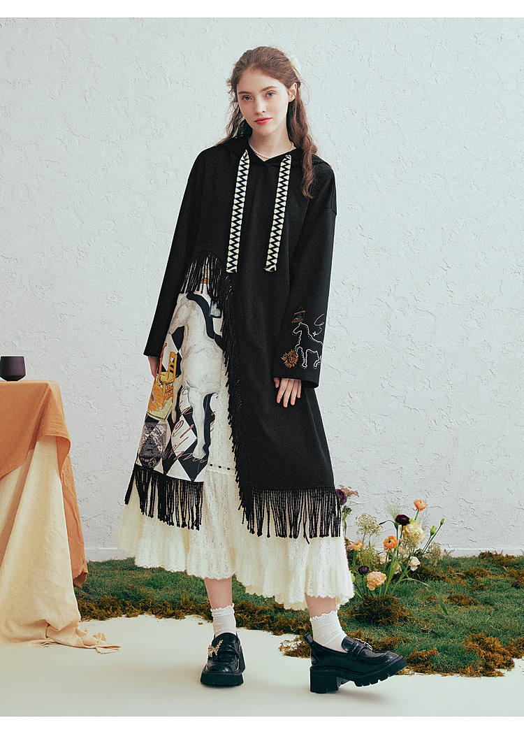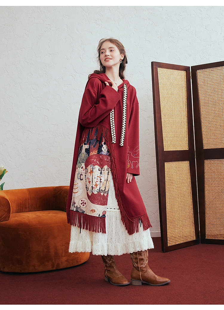 两三事梵高文艺岁华沉绛2026春季新款流苏裙摆印花开衩连帽连衣裙