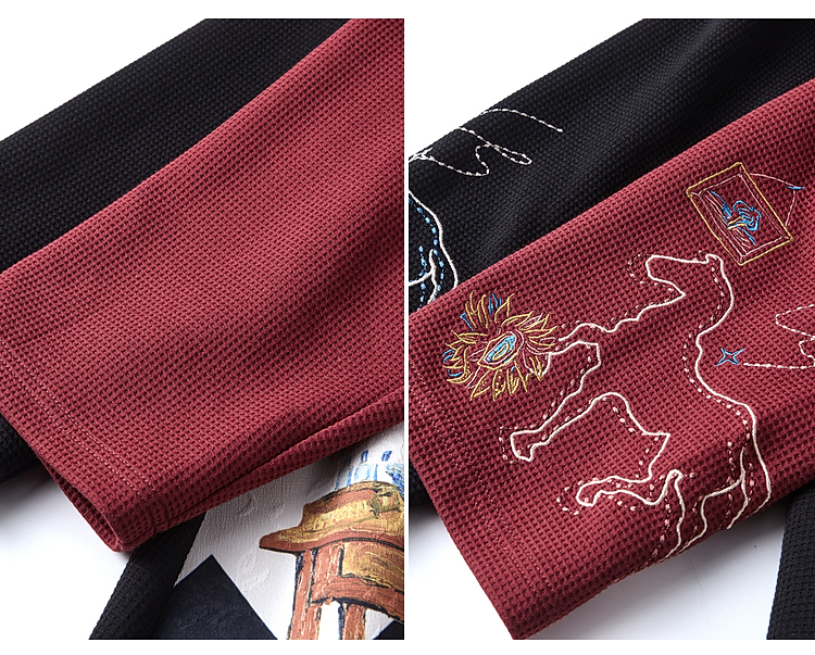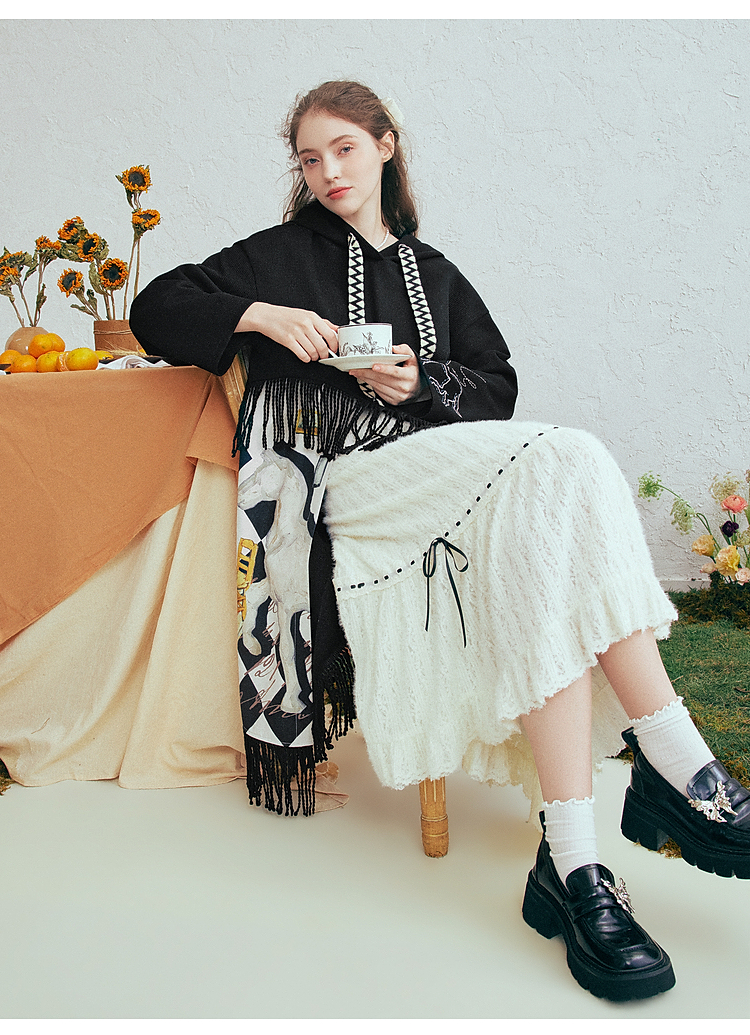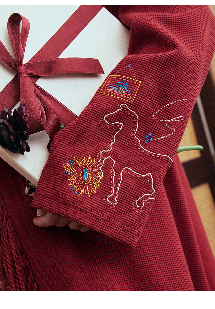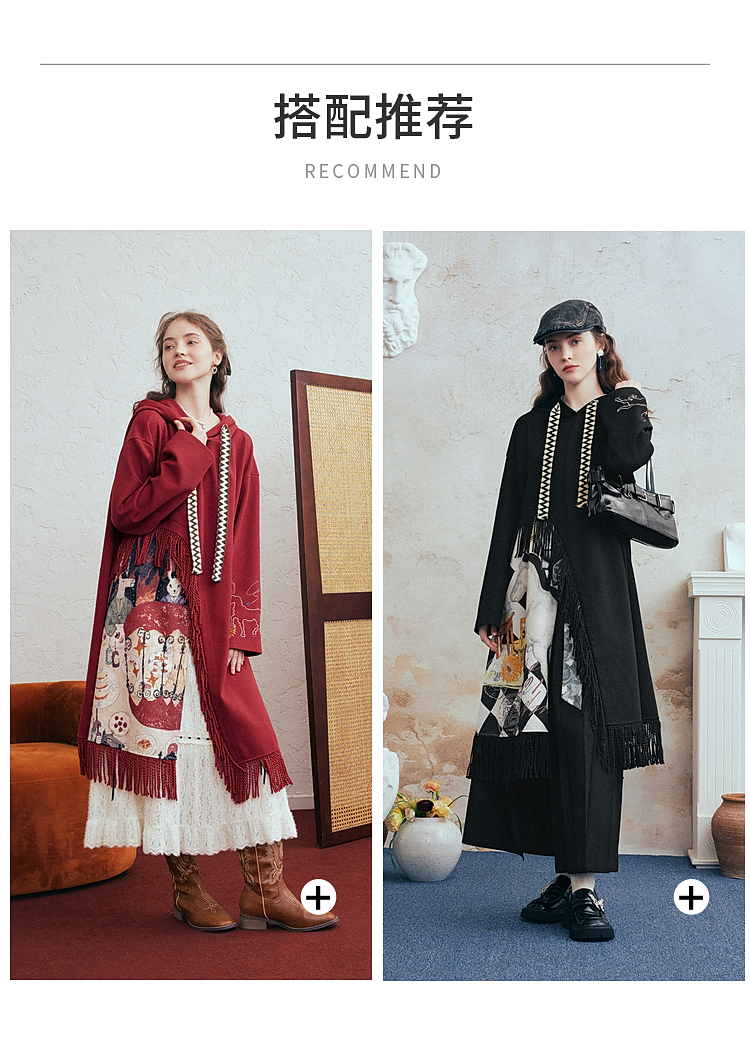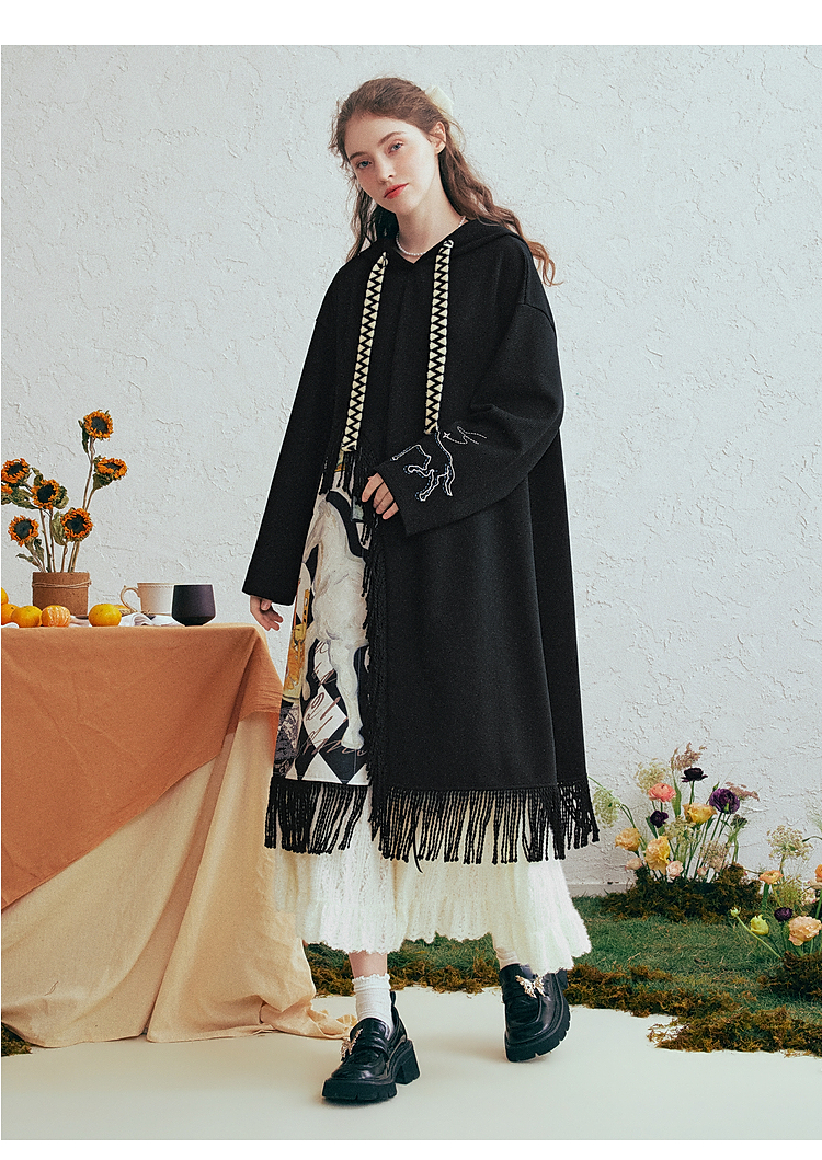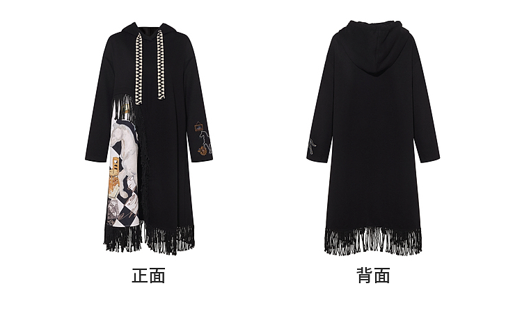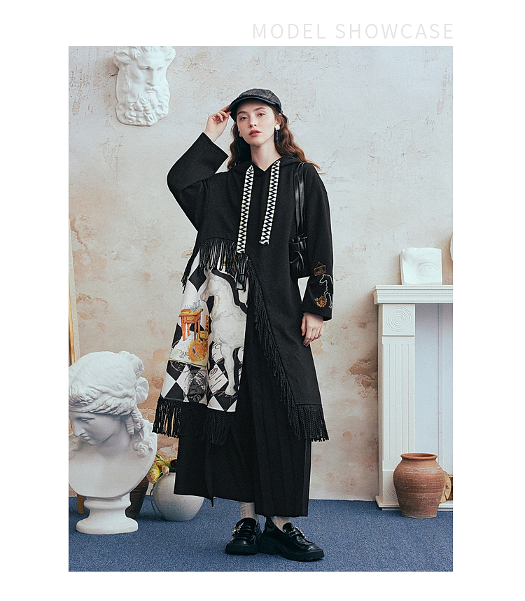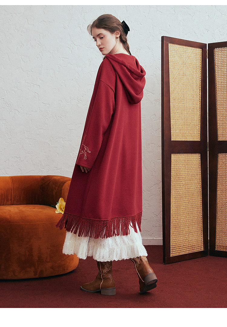 两三事梵高文艺岁华沉绛2026春季新款流苏裙摆印花开衩连帽连衣裙