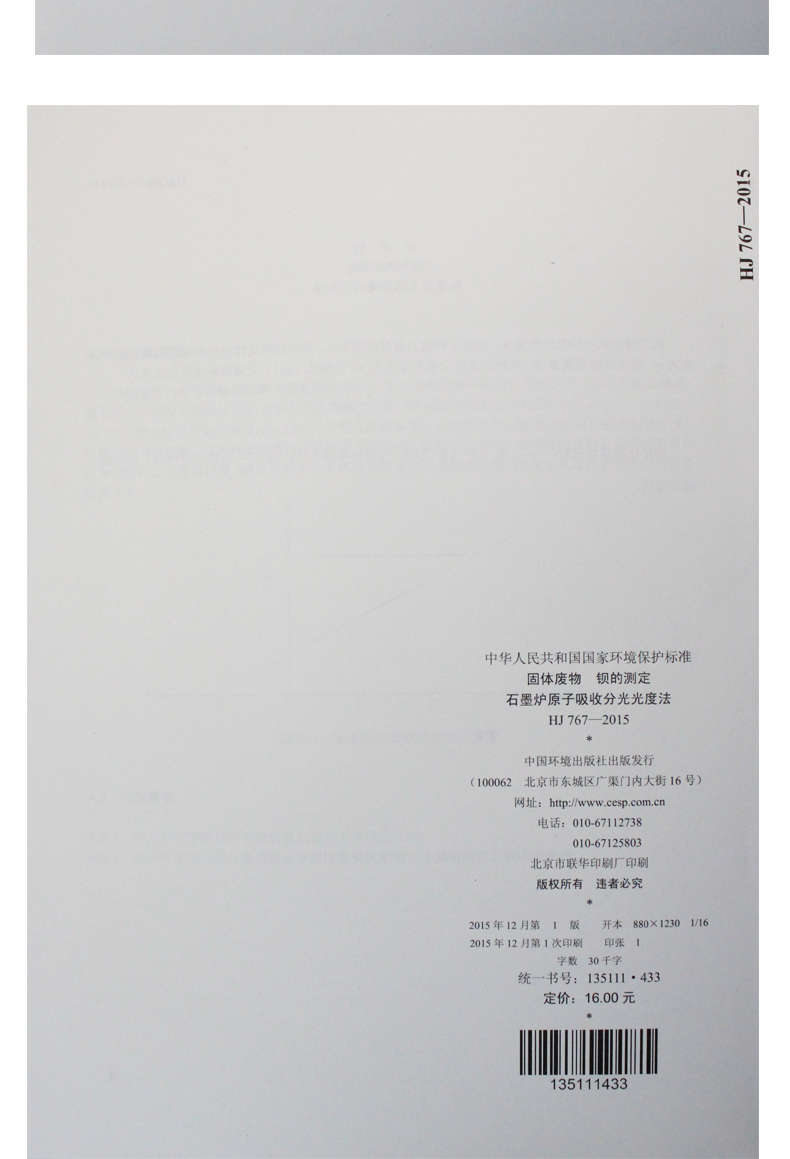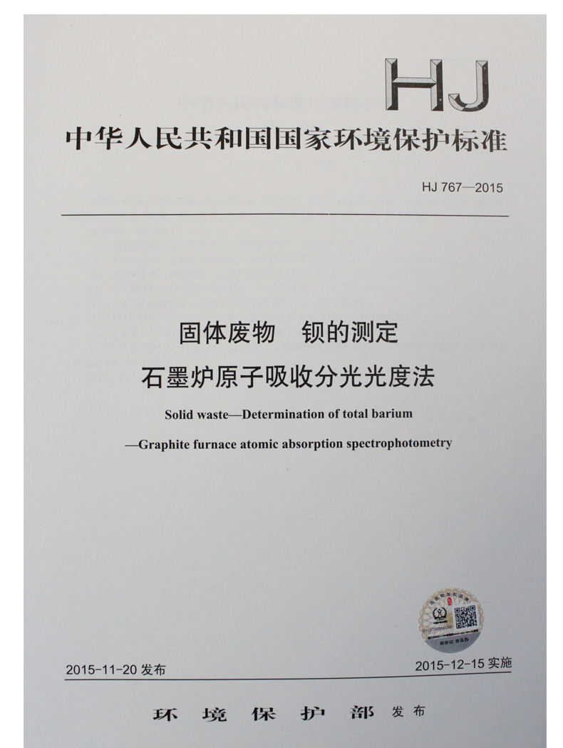 HJ 767-2015 固体废物 钡的测定 石墨炉原子吸收分光光度法 国家标准 国标 GB 环境保护 135111433