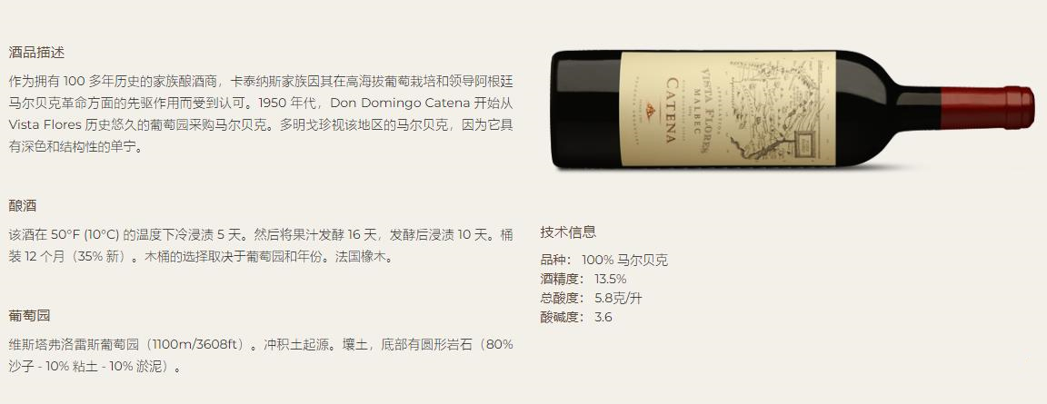Catena Appellations Malbec Vista Flores2021卡帝娜薇斯达红葡萄酒 2021