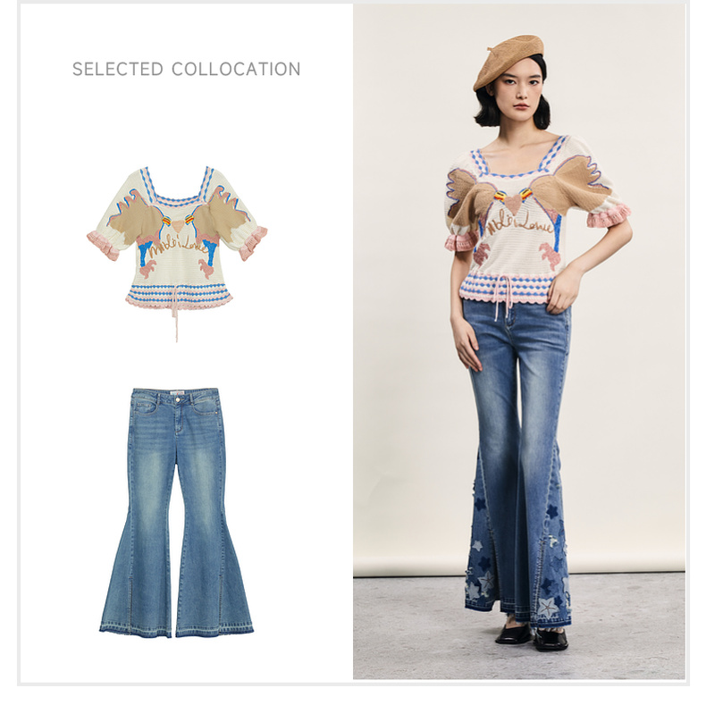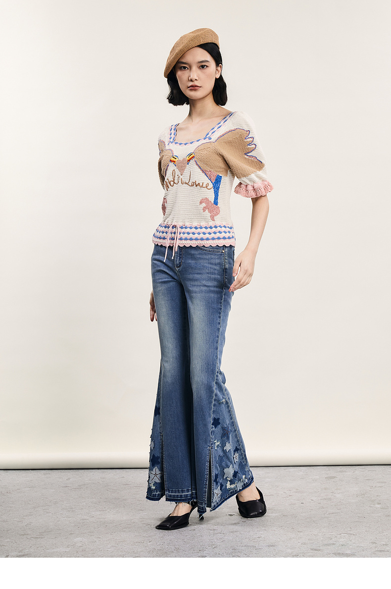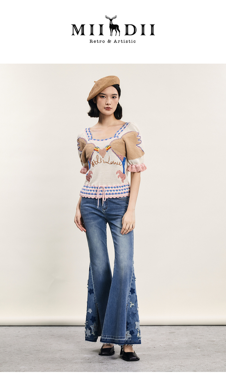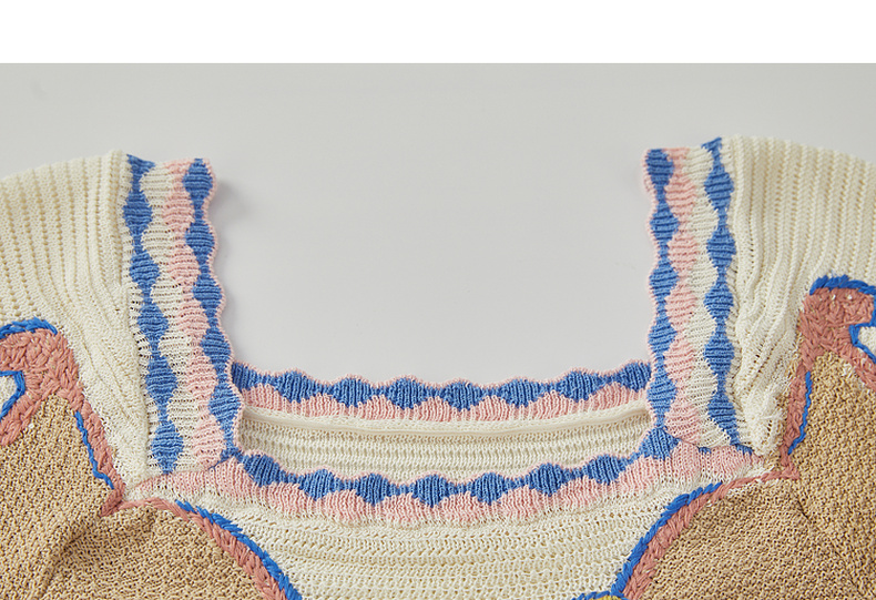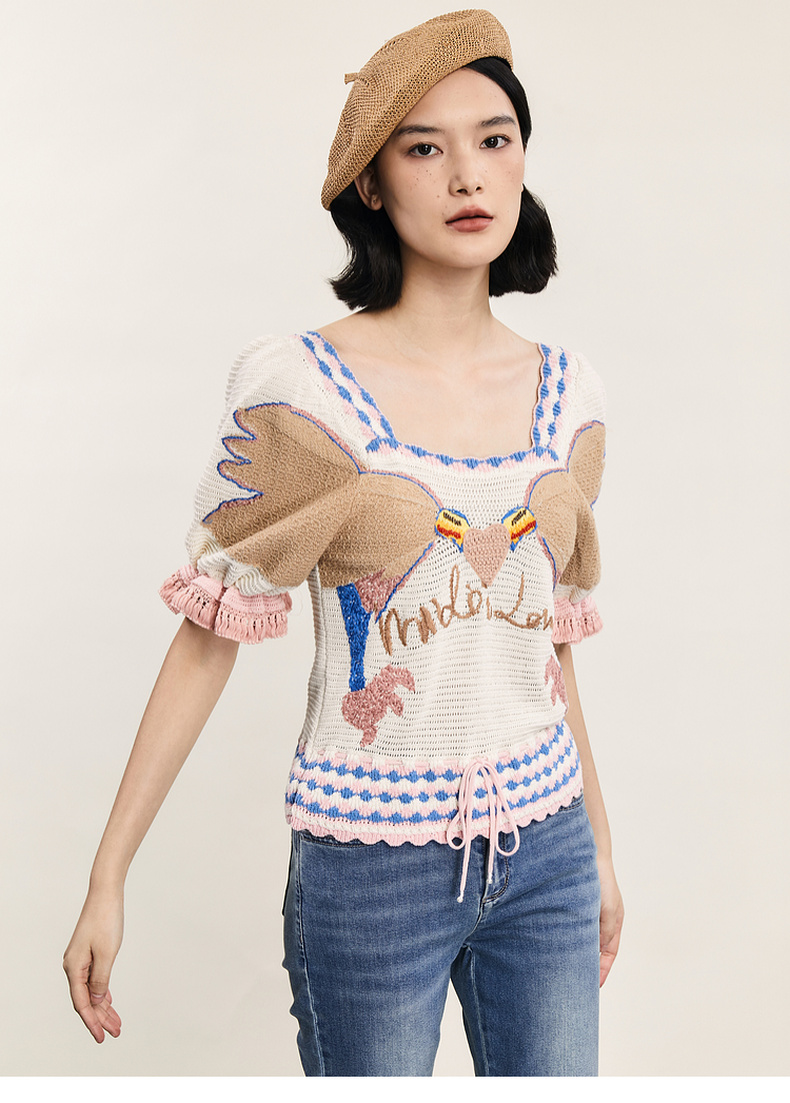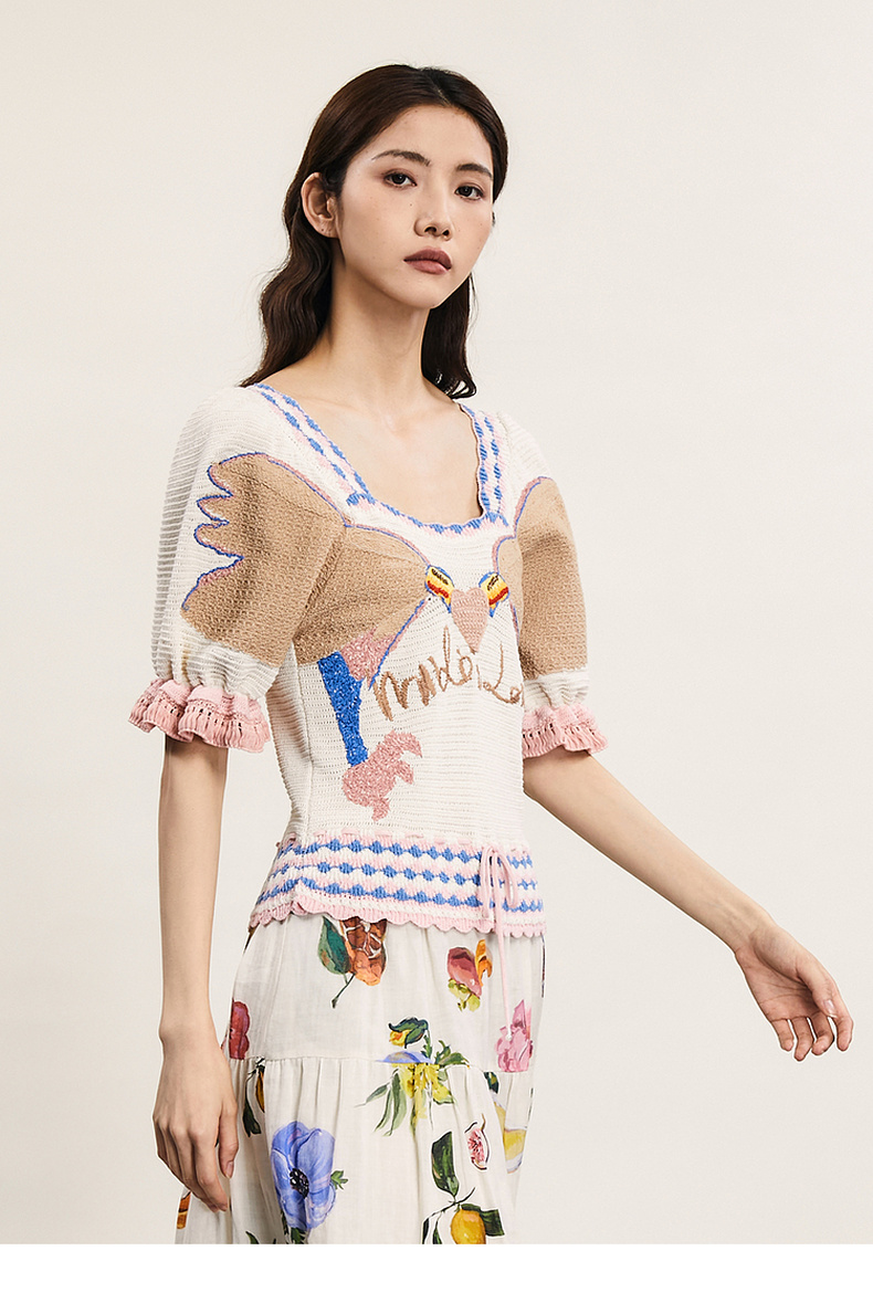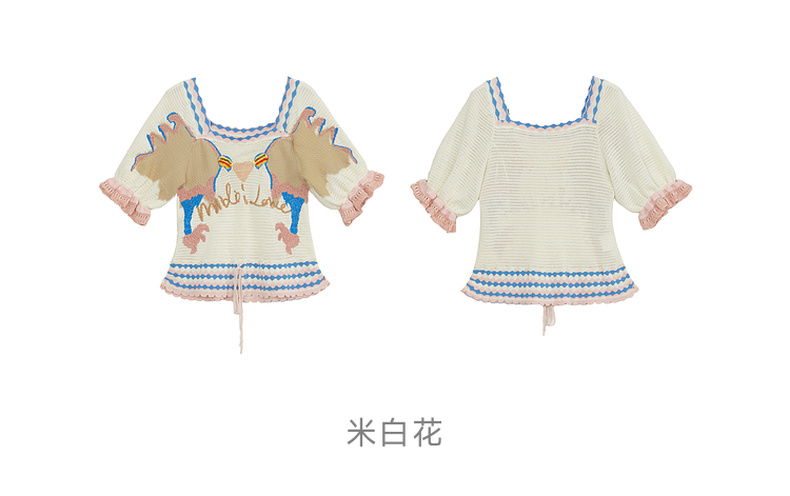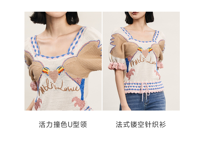 谜底短袖修身针织衫女2024年夏新品复古文艺方型领上衣242MZ0883