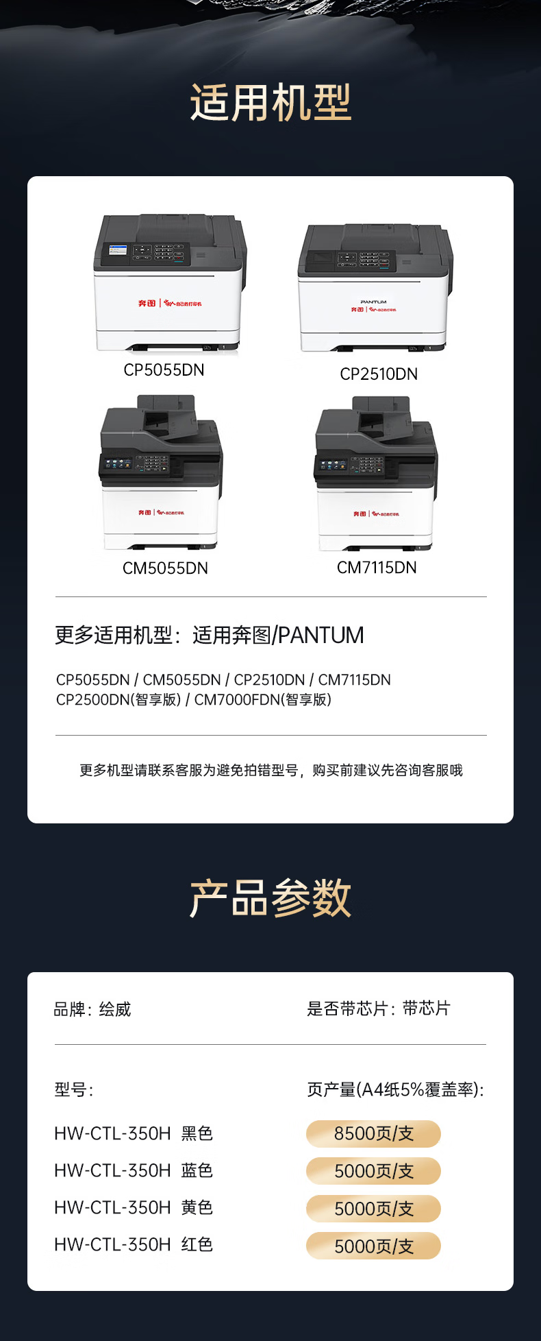 绘威臻享版CTL350HK粉盒适用奔图CM/CP5055DN粉盒CP2510DN/2500DN智享版墨盒CM7000PDN/7115DN打印机硒鼓四色