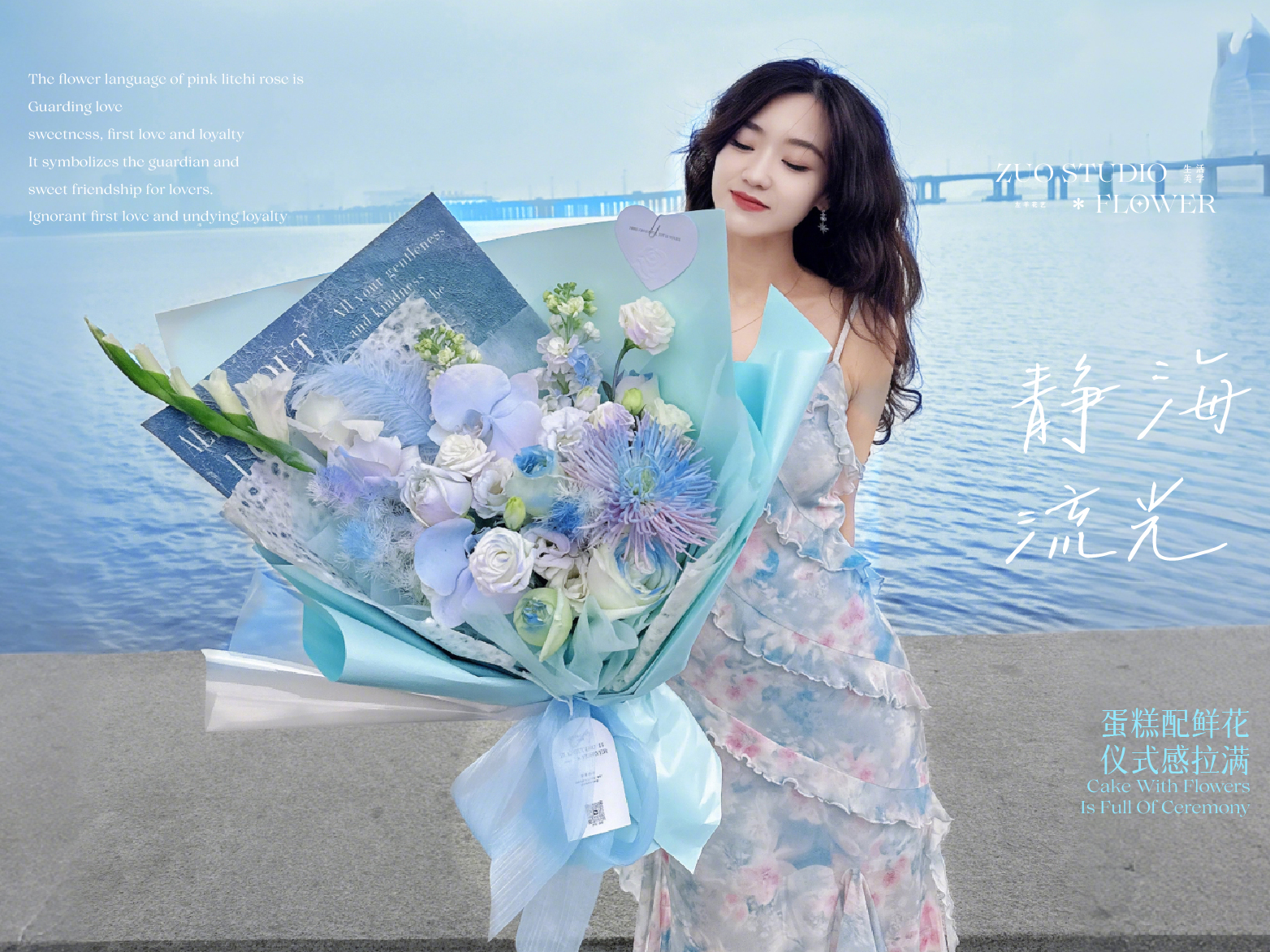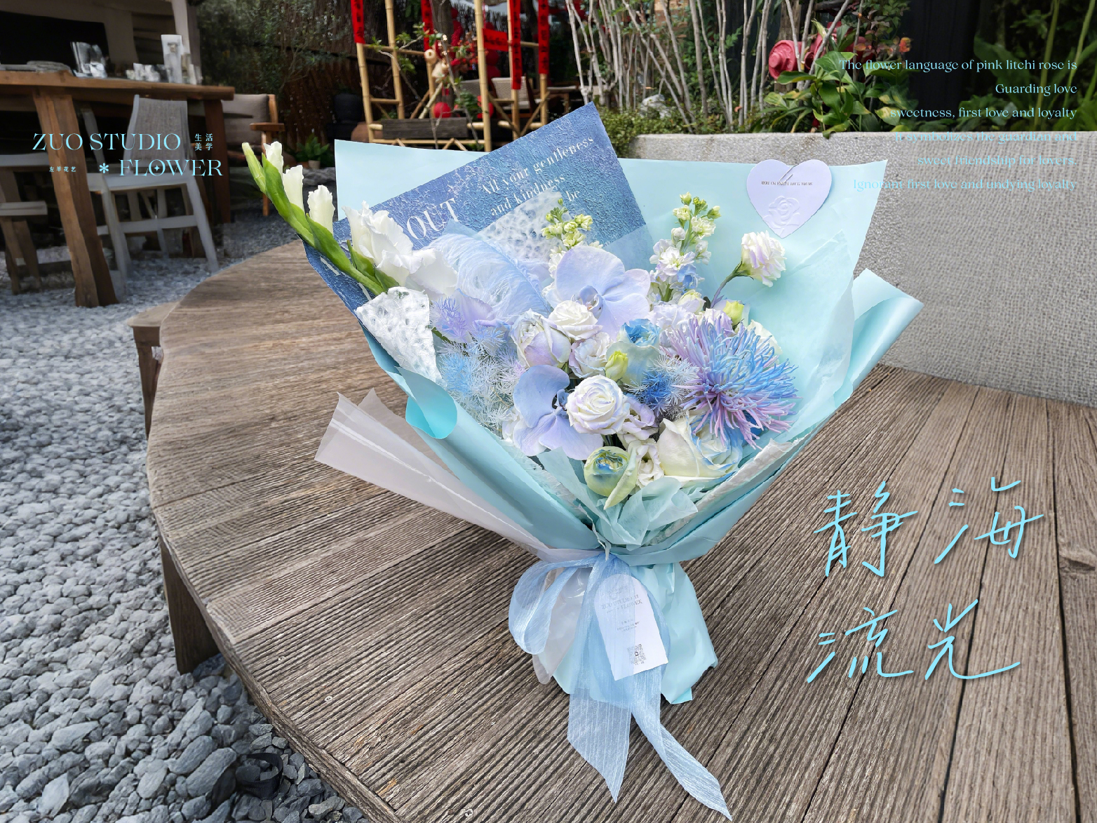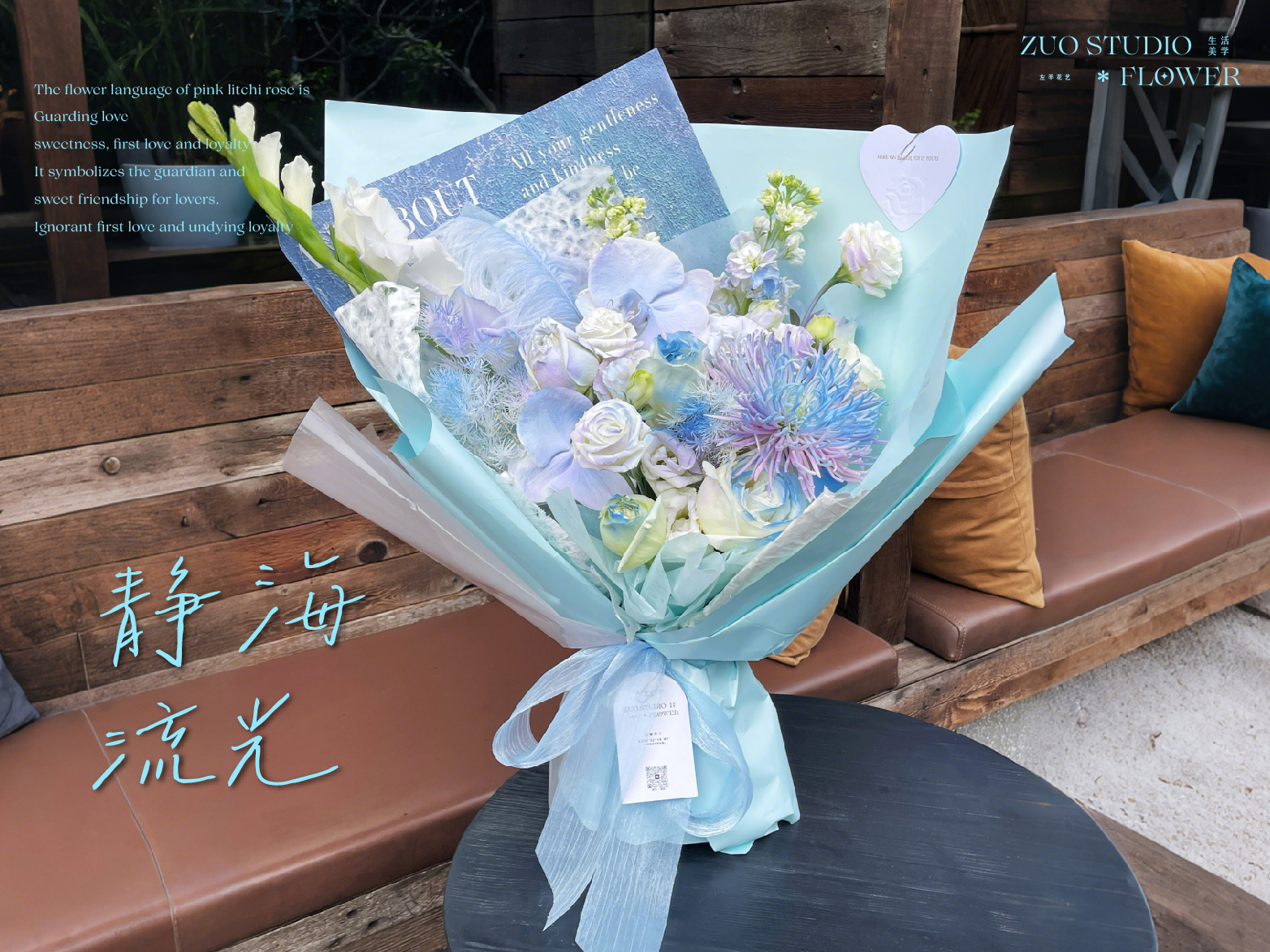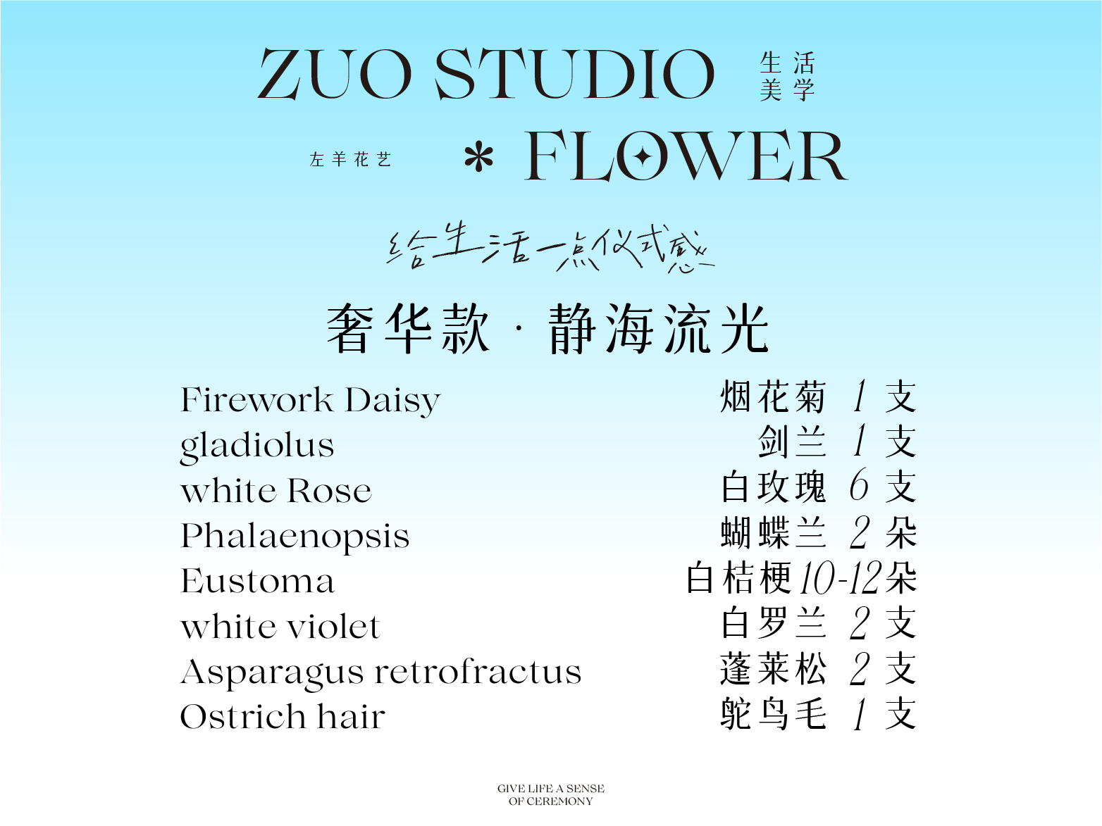 奢华款【静海流光】烟花菊1支/剑兰1支/白玫瑰6支/蝴蝶兰2朵/白桔梗10-12朵/白罗兰2支/蓬莱松2支/鸵鸟毛1支/氛围感鲜花/仪式感鲜花