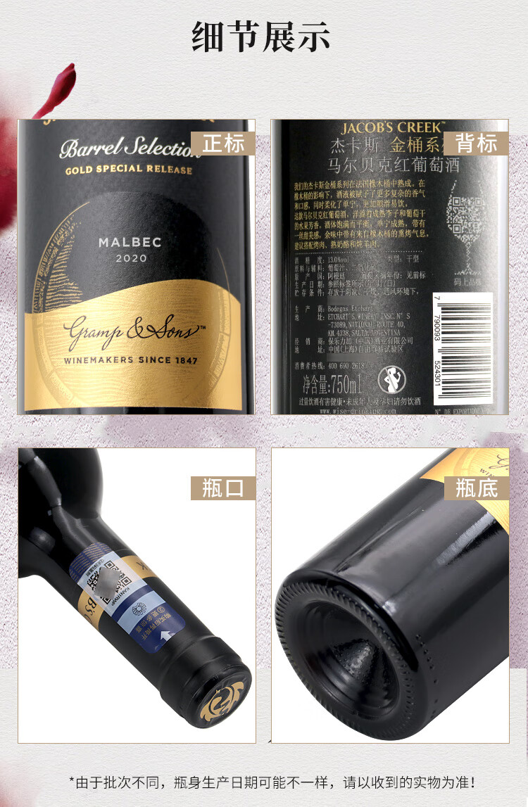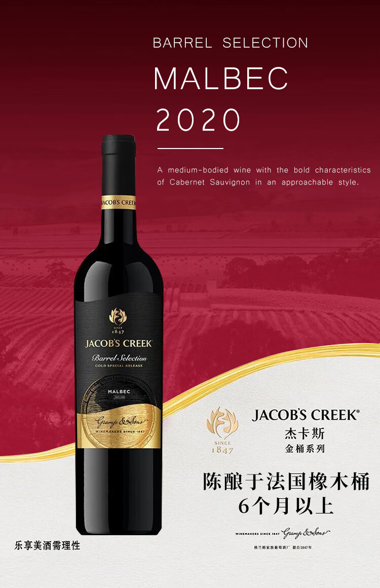 智利进口 红酒 杰卡斯金桶系列马尔贝克红葡萄酒