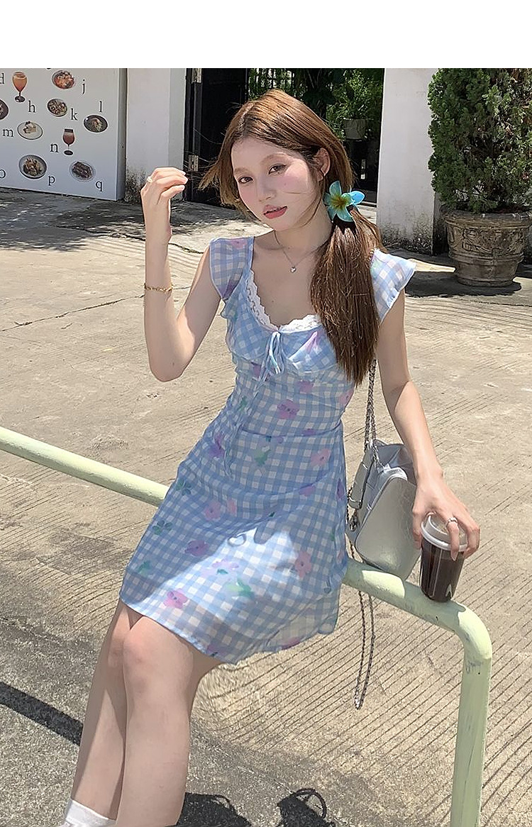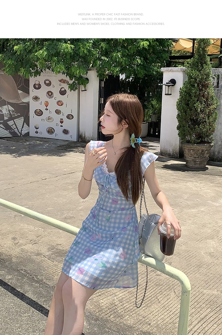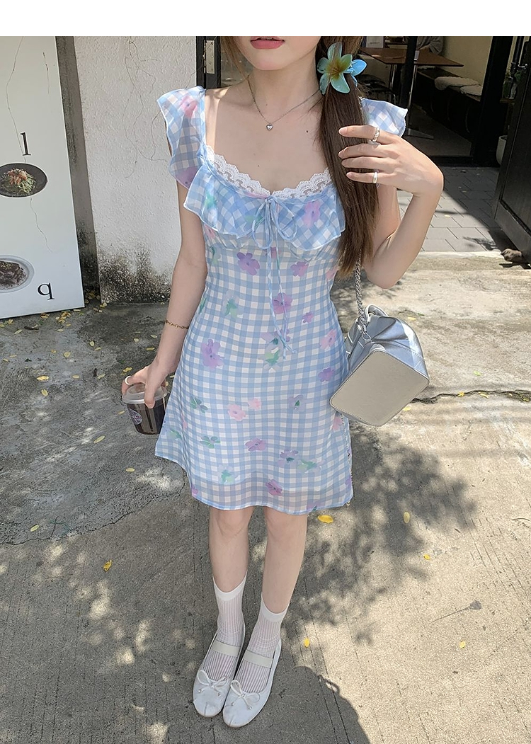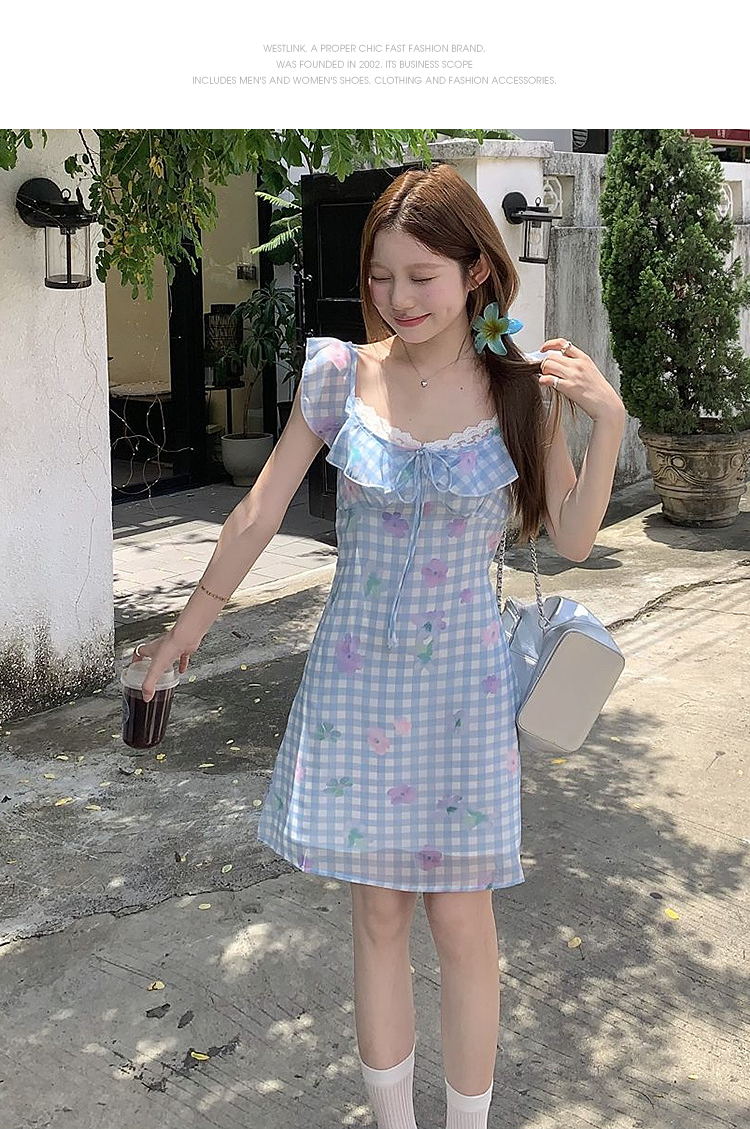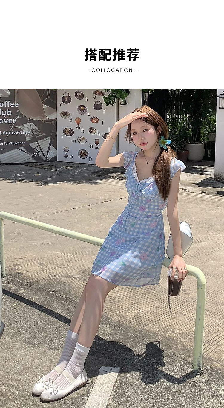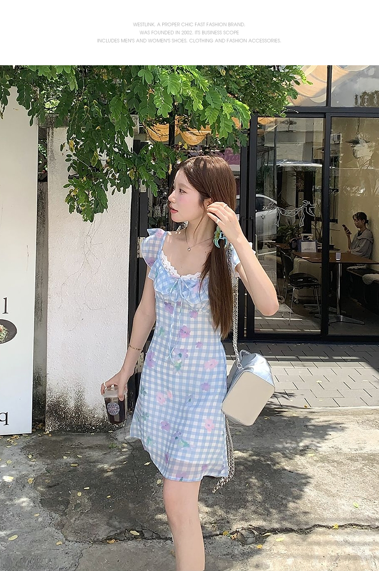西遇法式飞袖连衣裙女夏季新款系带蕾丝拼接格子碎花短裙SS050539
