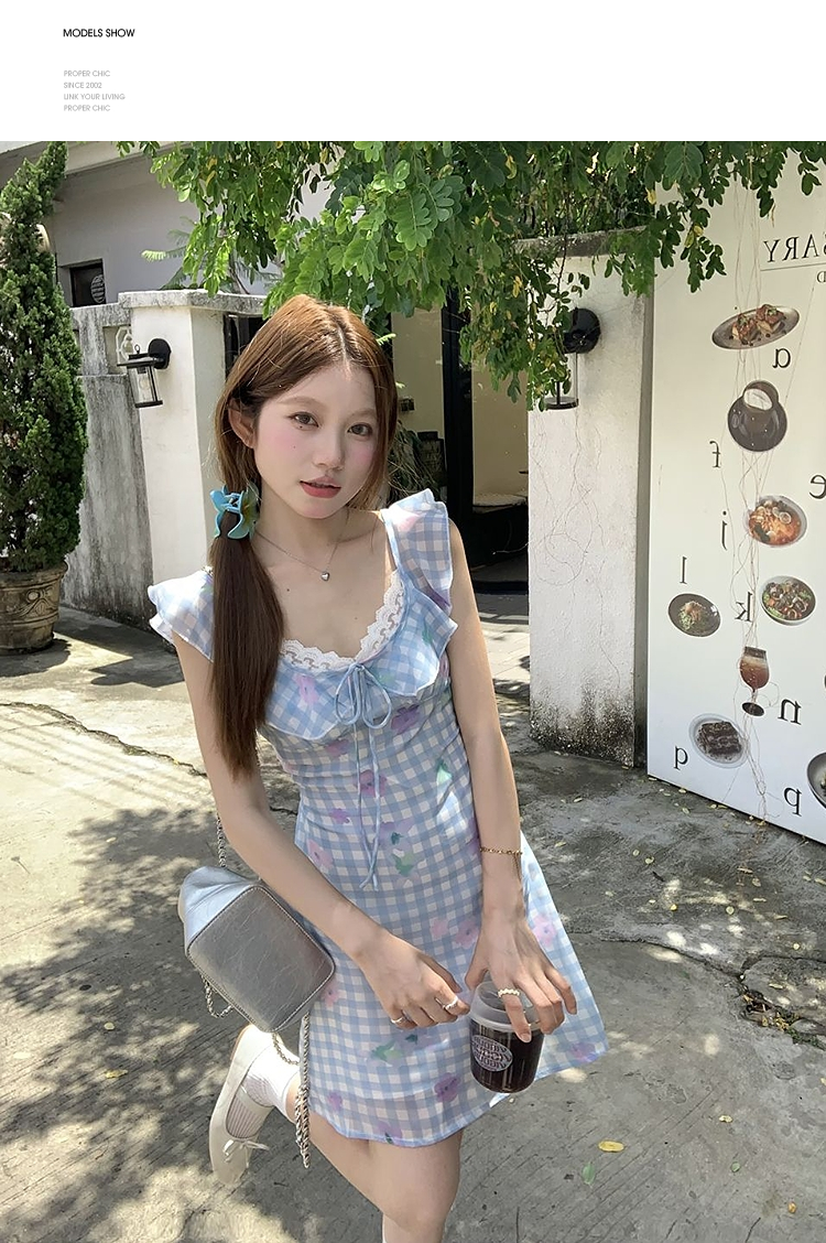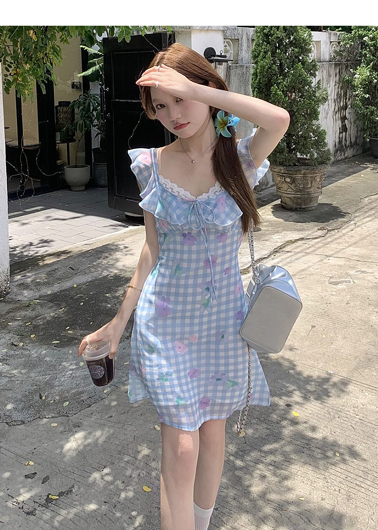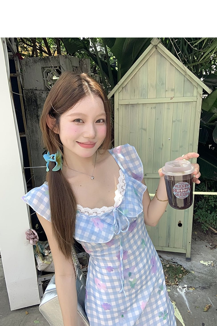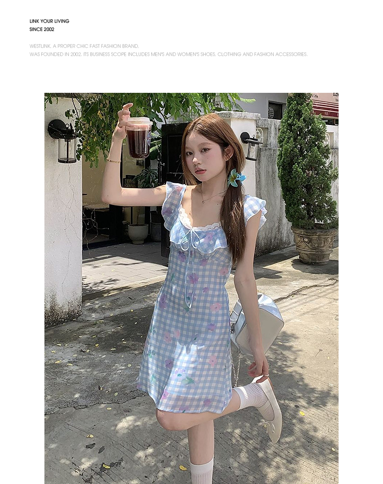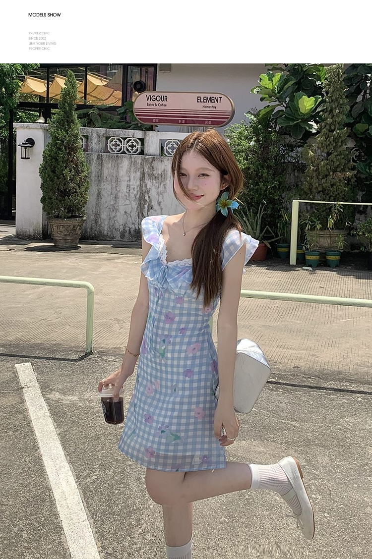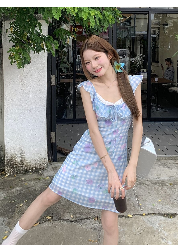 西遇法式飞袖连衣裙女夏季新款系带蕾丝拼接格子碎花短裙SS050539