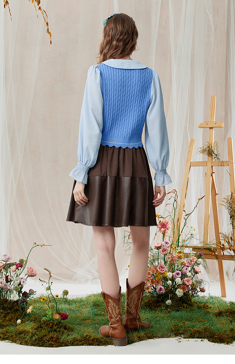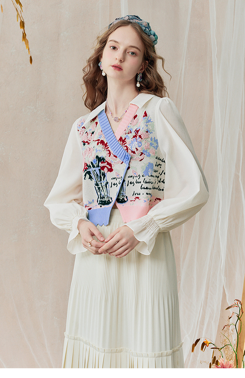 两三事 星缎釉彩 2025秋季新款复古花卉毛巾绣假两件针织衫女
