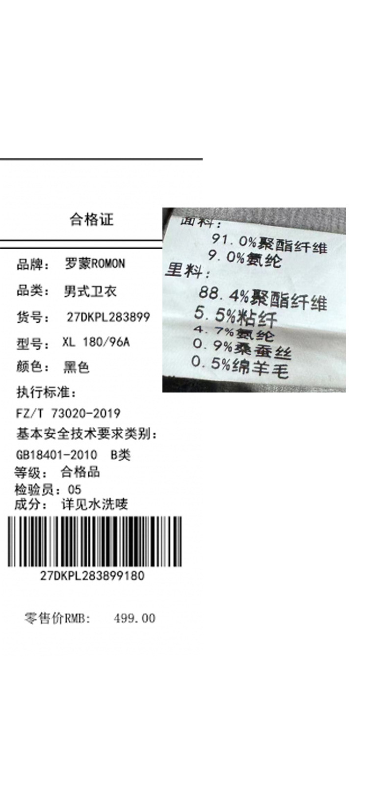里料:88.4%聚酯纤维5.5%粘纤 4.7%氨纶 0.9%桑蚕丝 0.5%绵羊毛