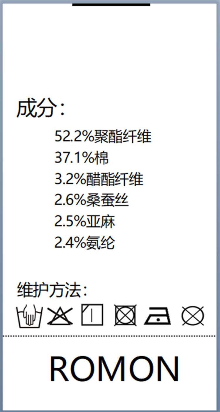 面料:52.2%聚酯纤维 37.1%棉 3.2%醋酯纤维 2.6%桑蚕丝 2.5%亚麻 2.4%氨纶
