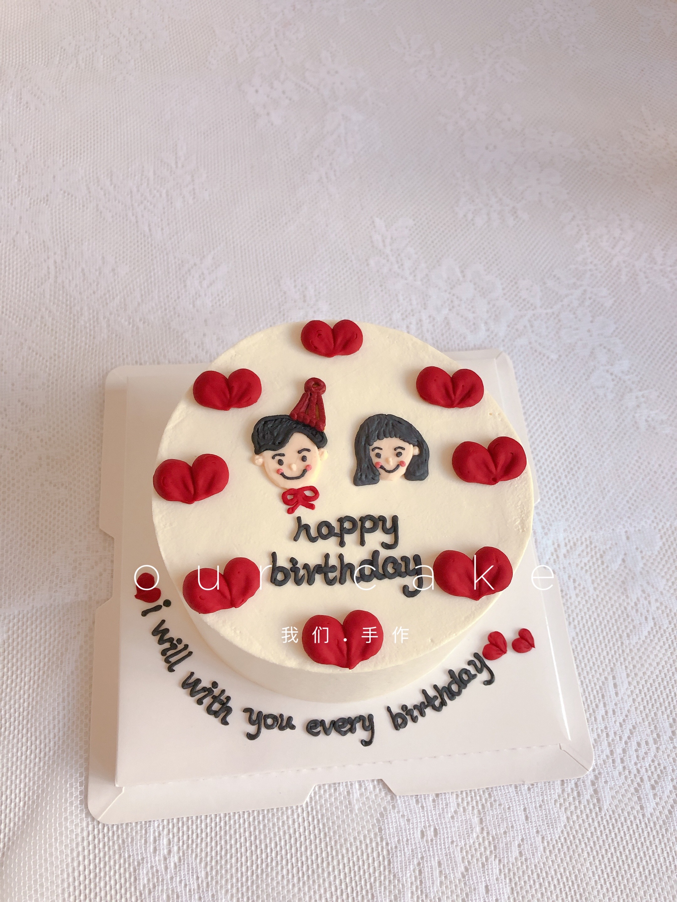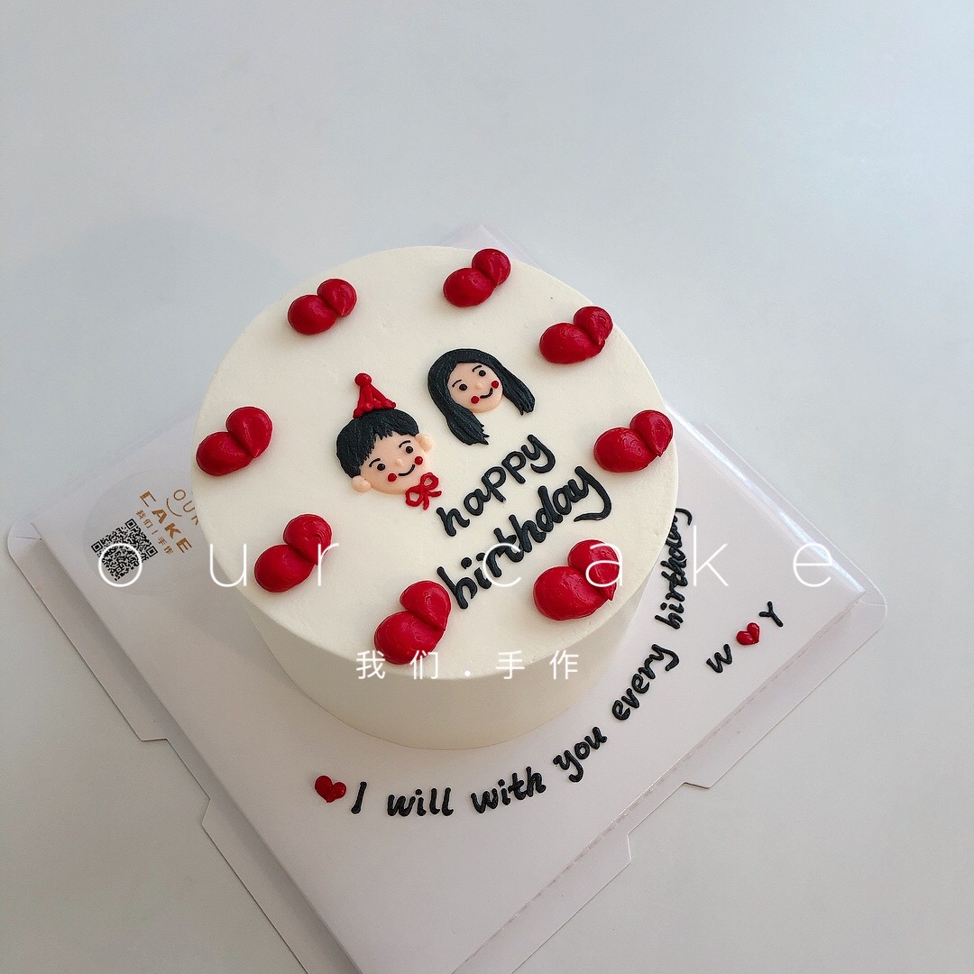 韩式爱心情侣手绘纪念日蛋糕-低糖处理无添加