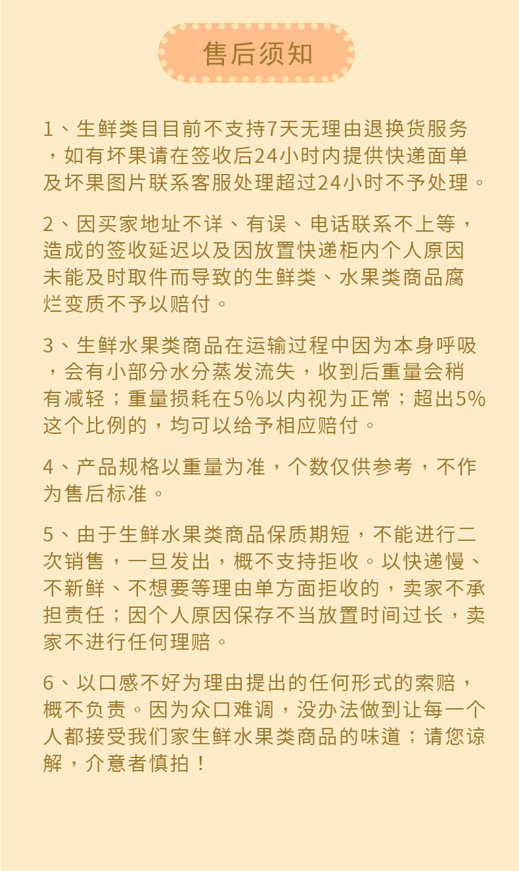 1.生鲜水果类不支持七天无理由退换,一经下单不支持中途拦截拒收,更改地址等,介意慎拍!
