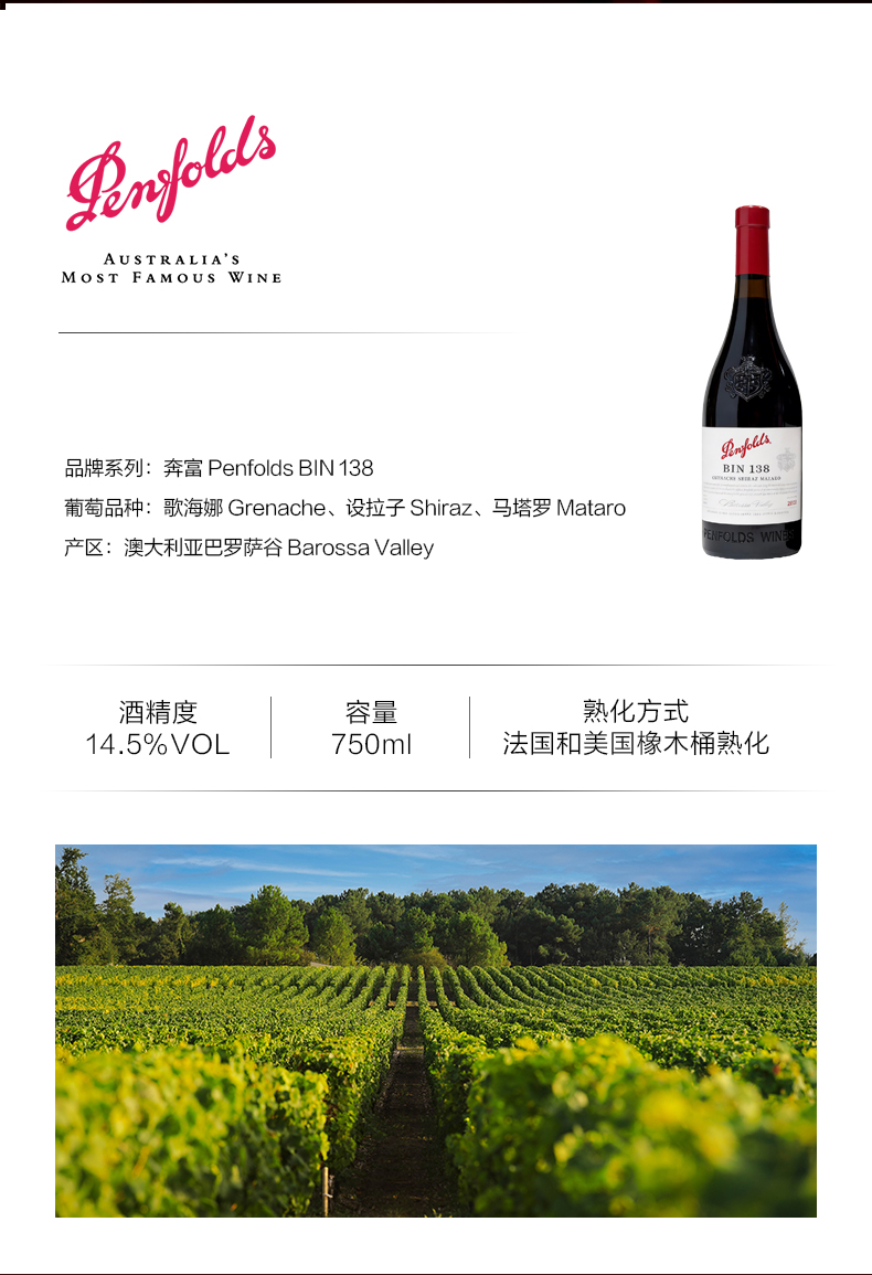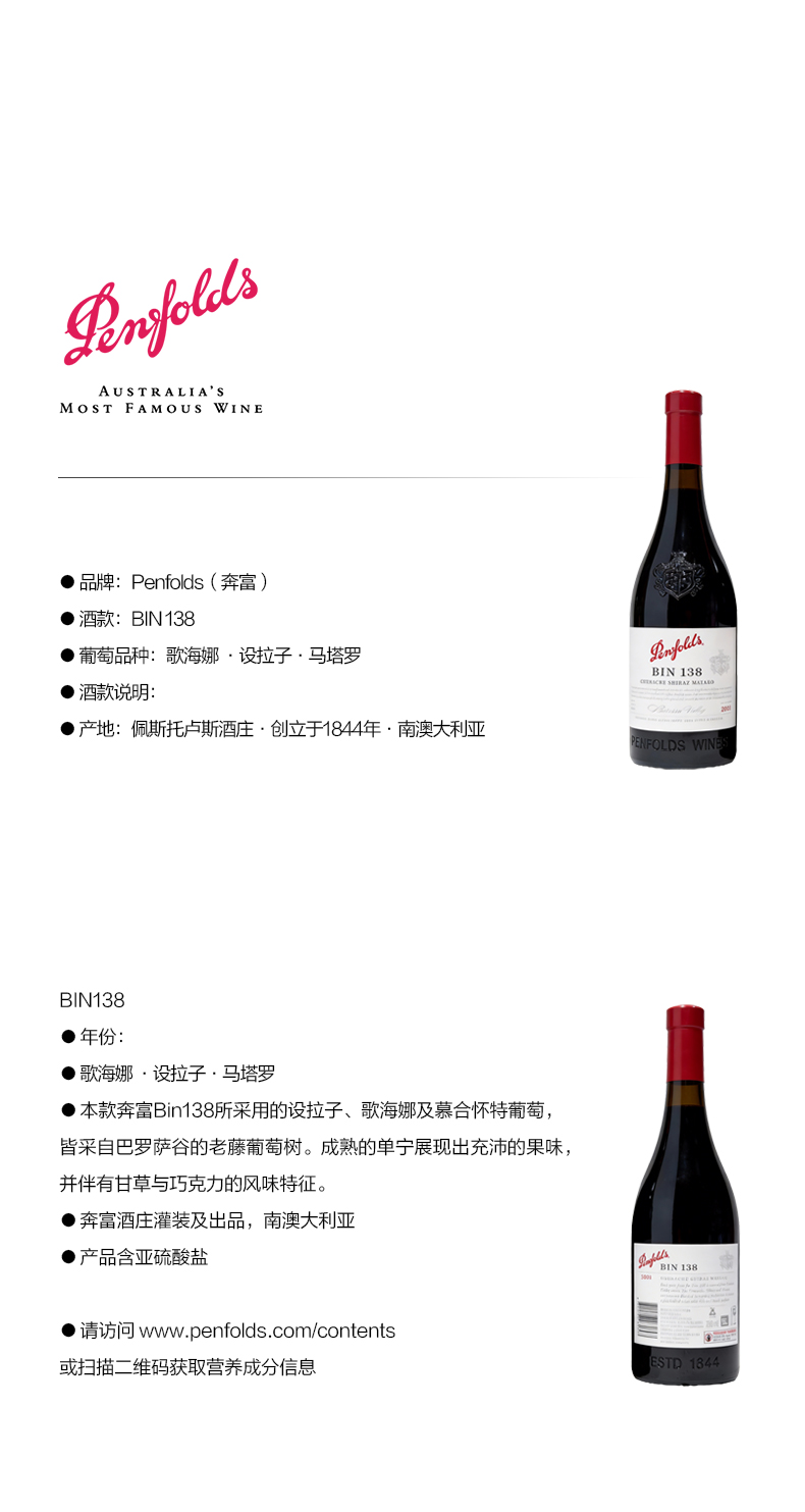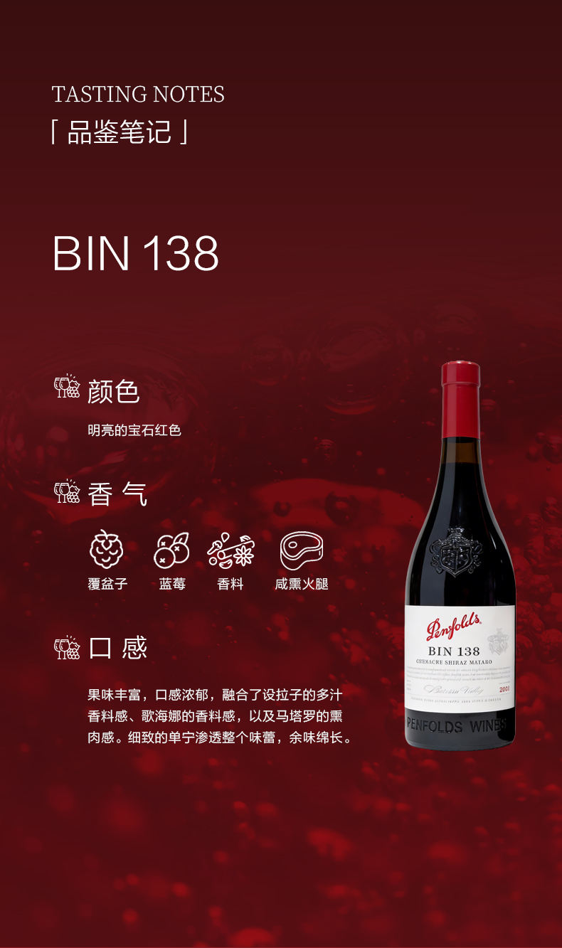 奔富(Penfolds)BIN138歌海娜设拉子玛塔罗干红葡萄酒裸瓶木塞750ml单支 澳洲原产【保税进口】