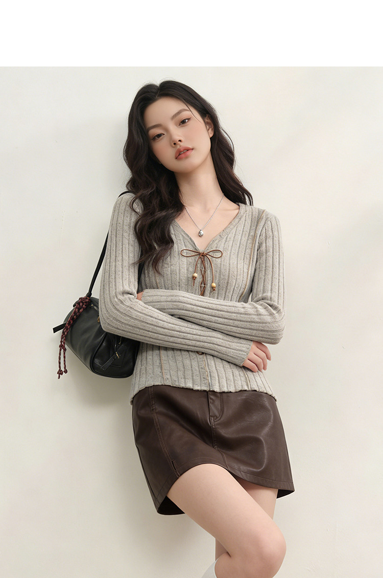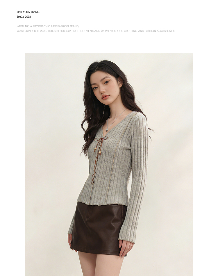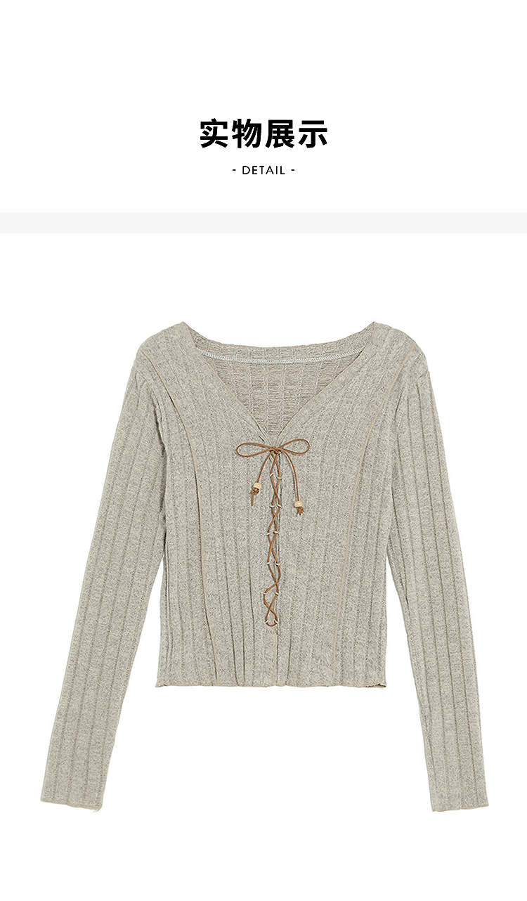 西遇V领长袖T恤女2026年春季新款甜辣修身显瘦绑带短款长袖针织衫E0060073