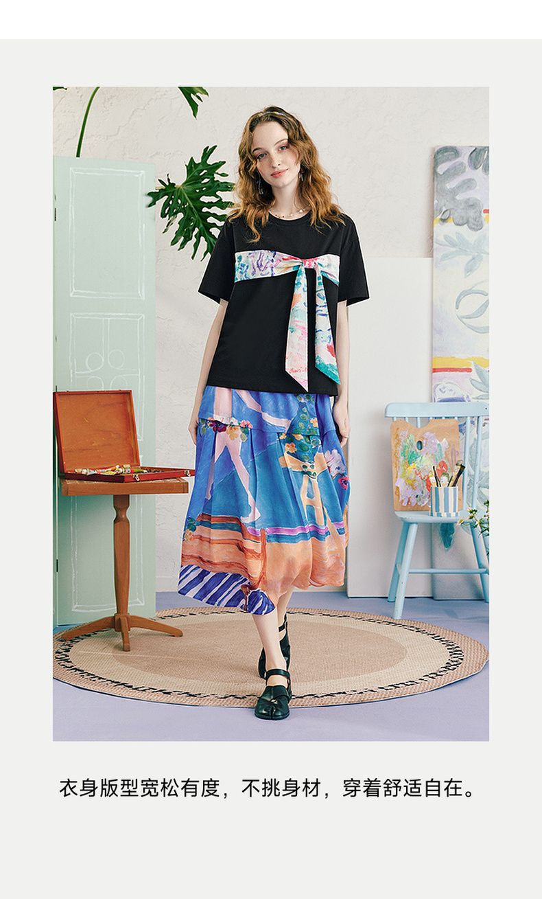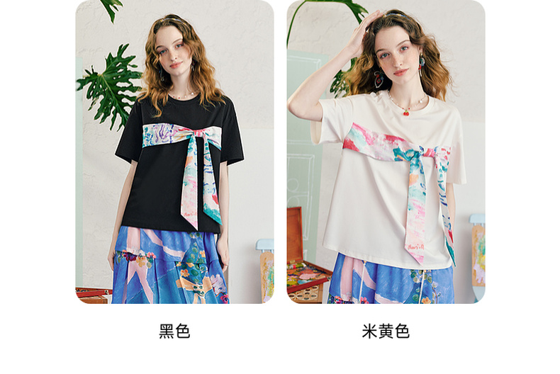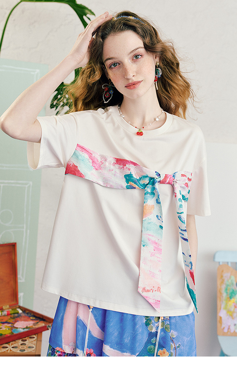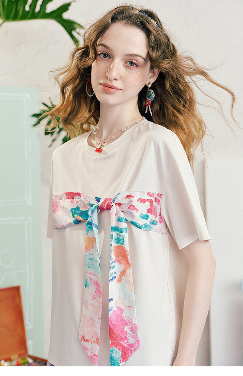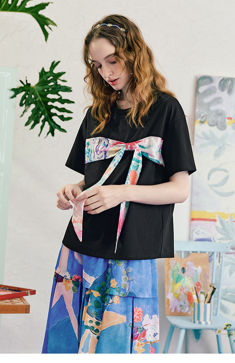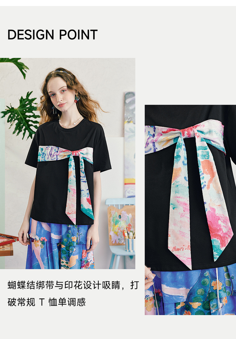两三事 沁甜蝶浪 2025夏季新款甜美印花蝴蝶结短袖t恤女宽松