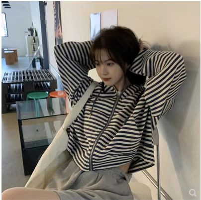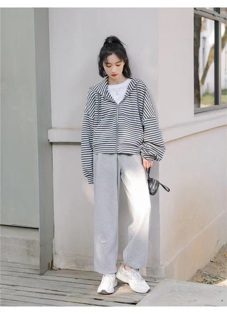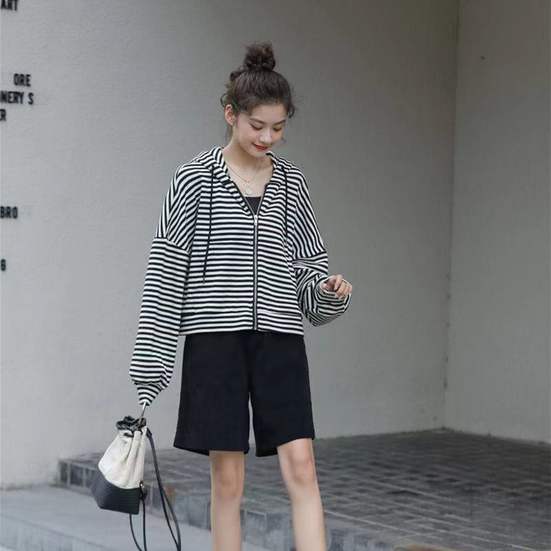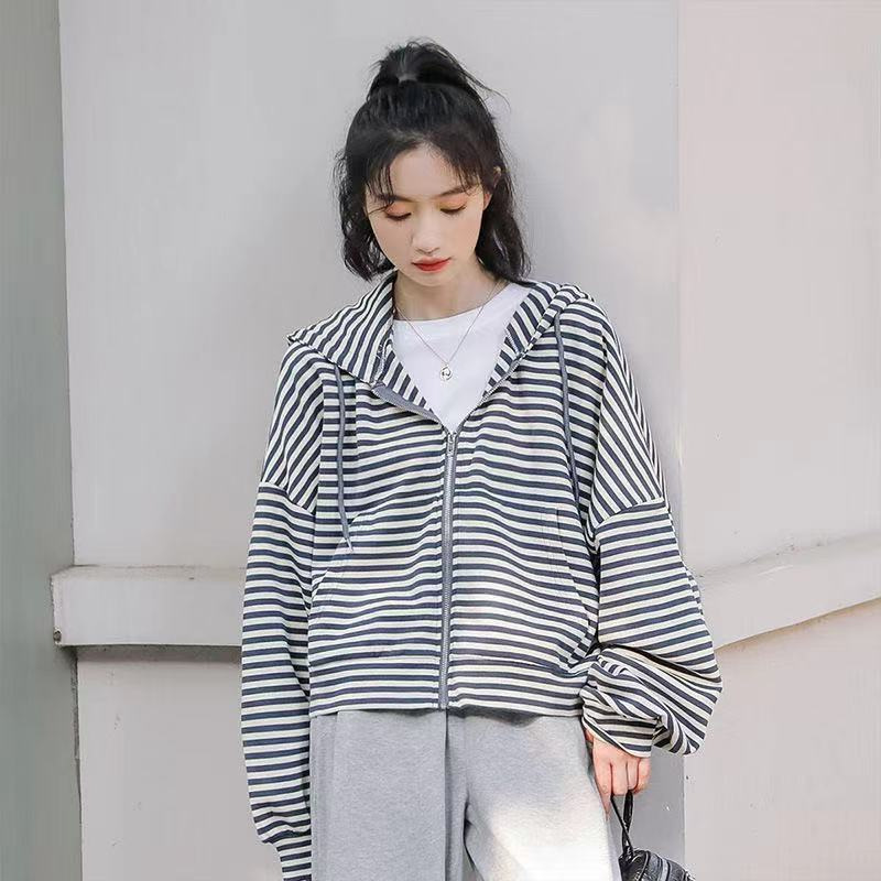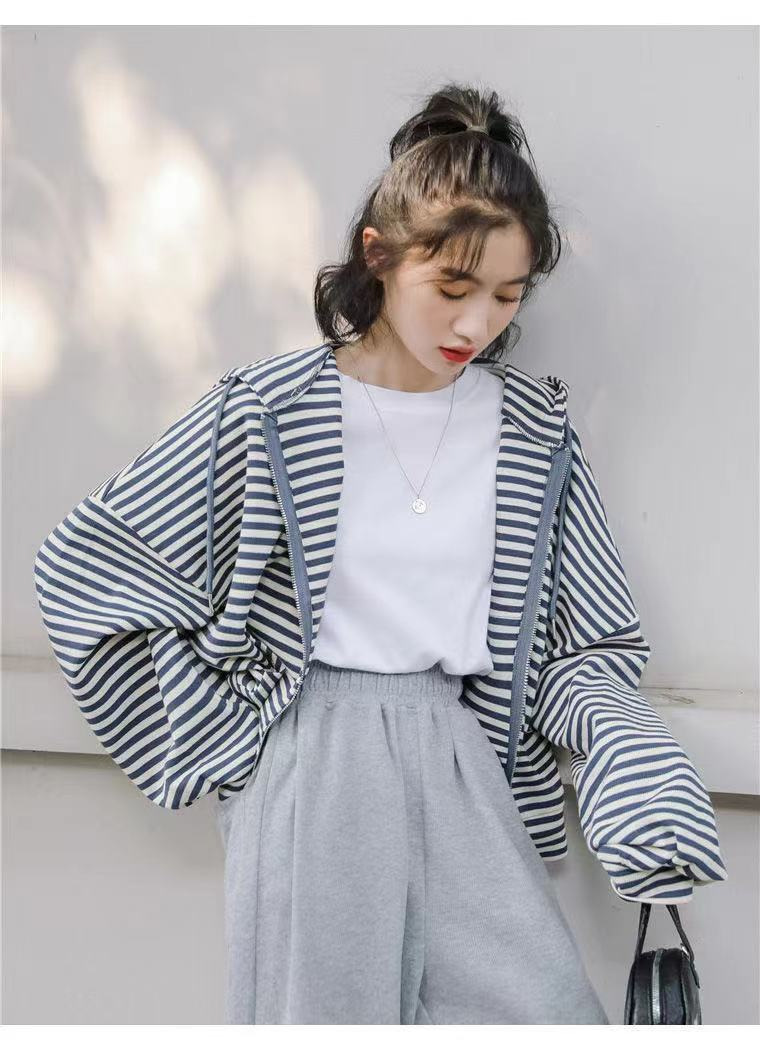 秋装薄款连帽拉链卫衣女宽松显瘦条纹长袖外套运动上衣韩国女装