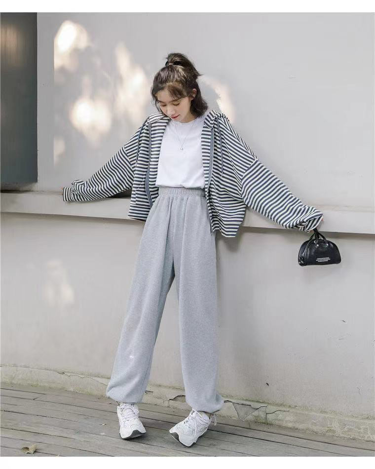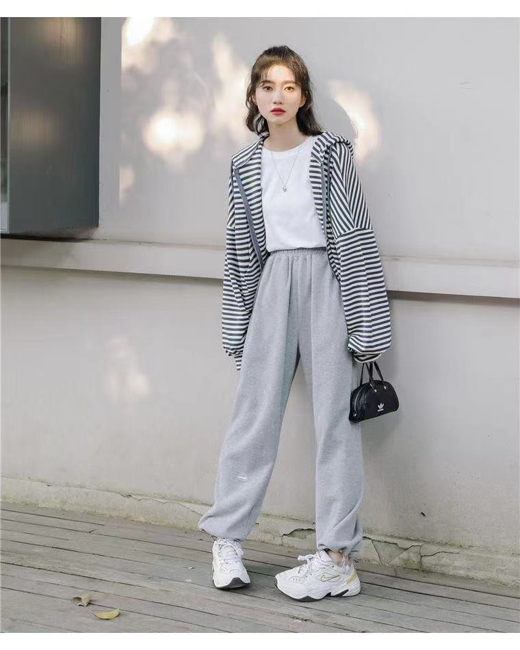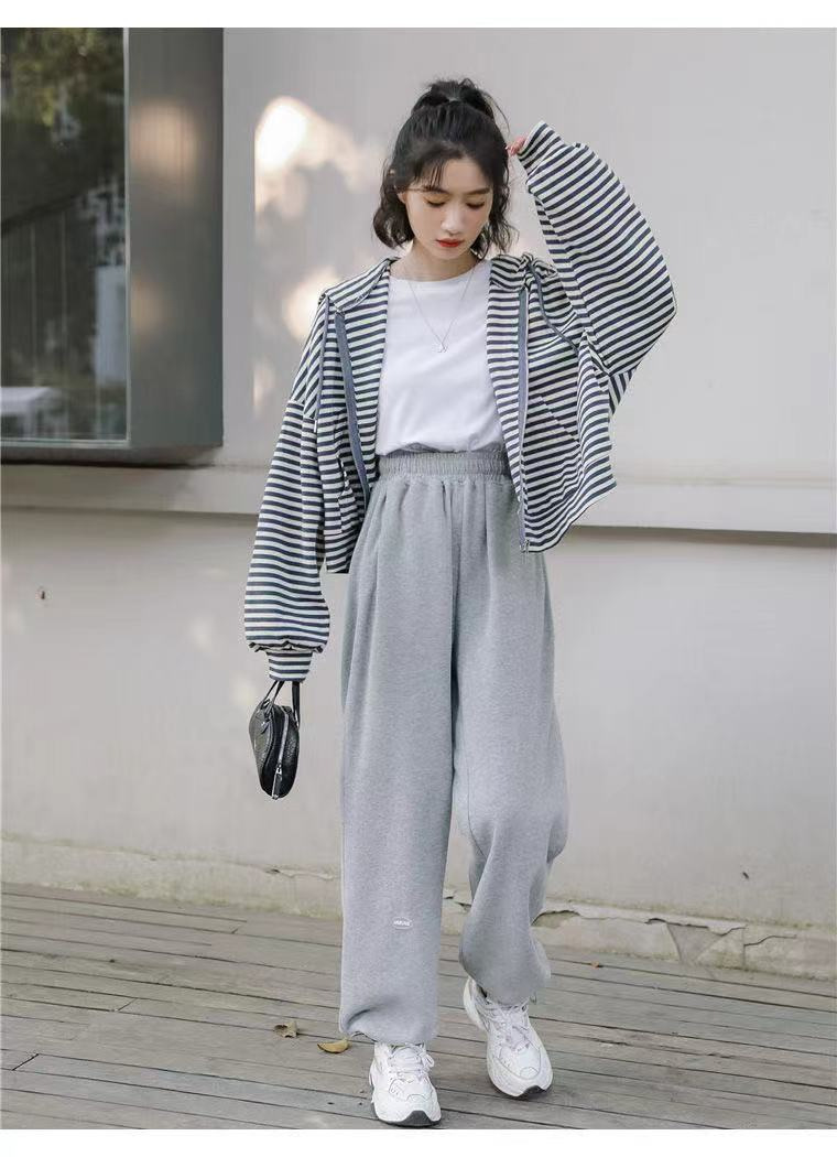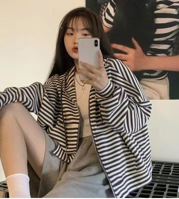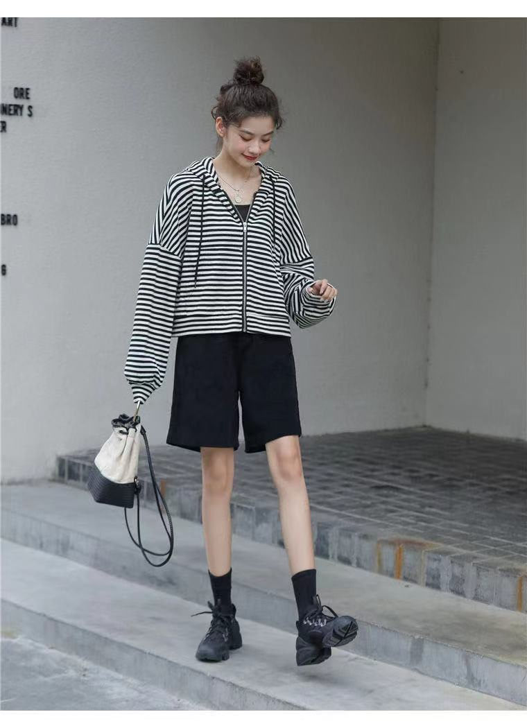 秋装薄款连帽拉链卫衣女宽松显瘦条纹长袖外套运动上衣韩国女装