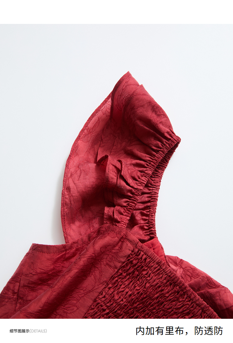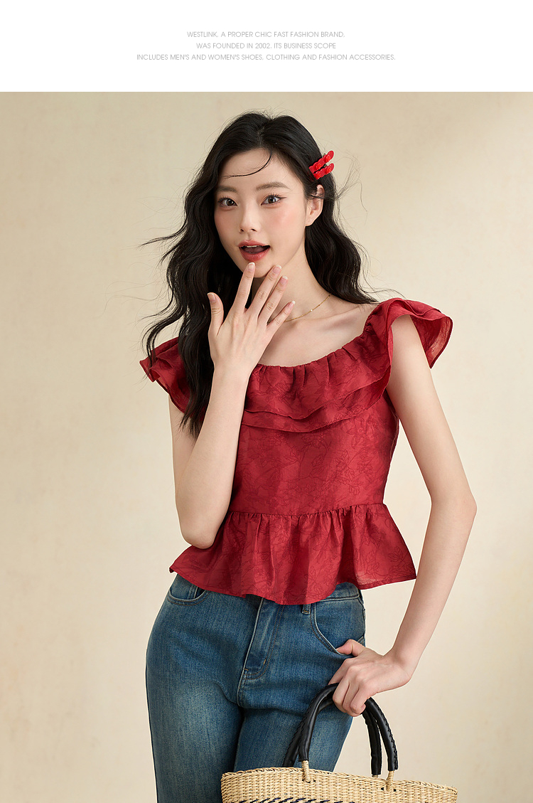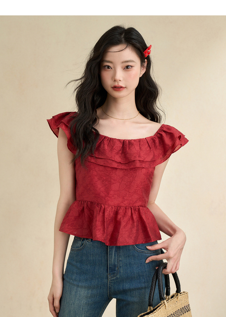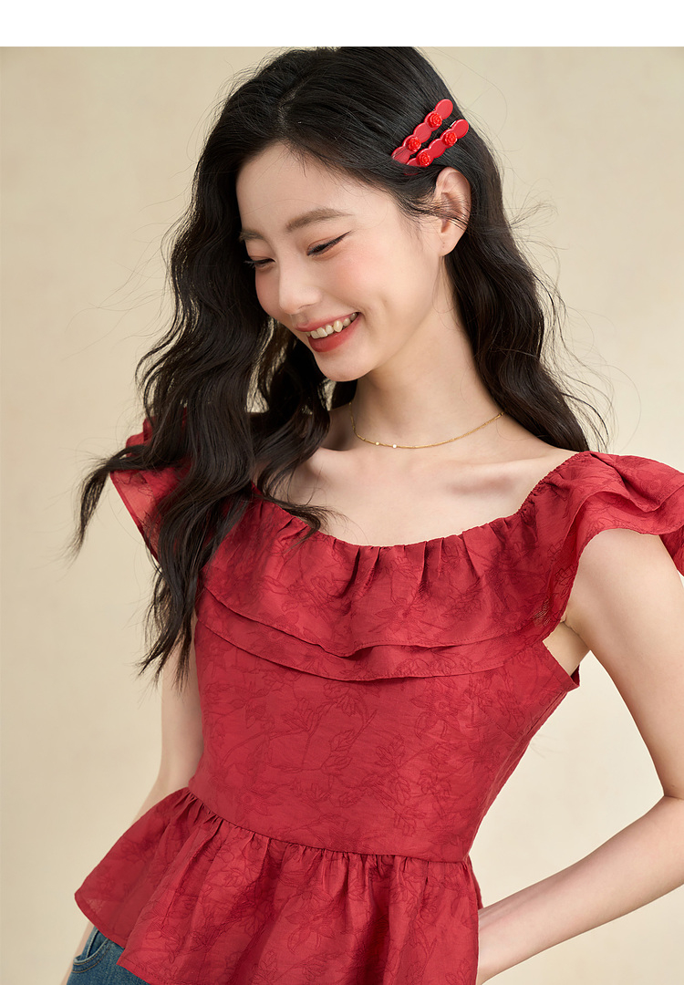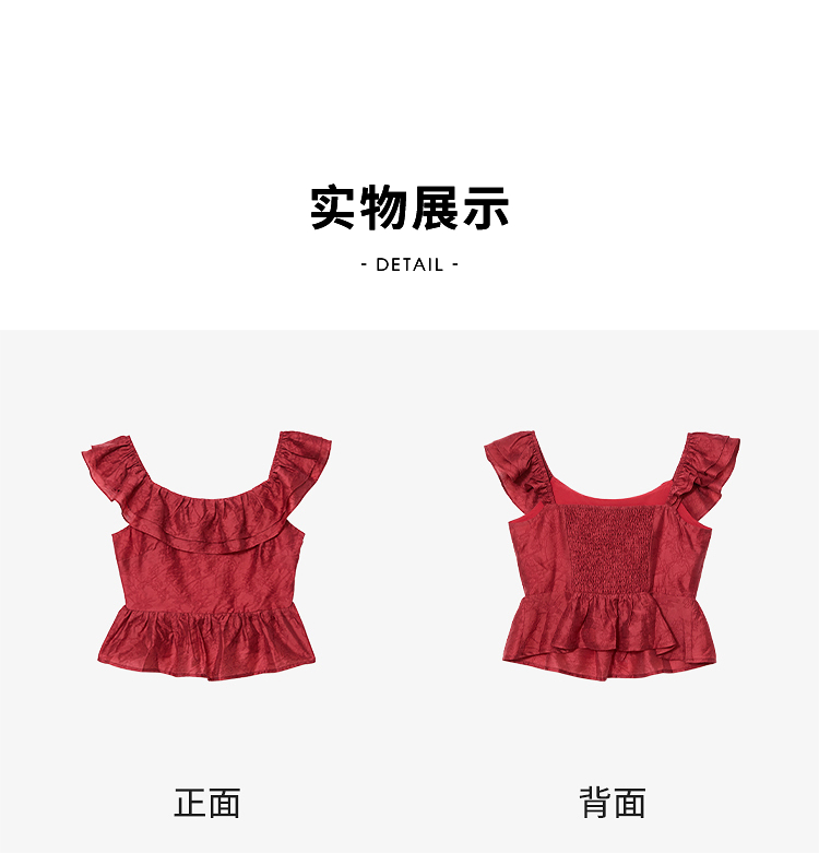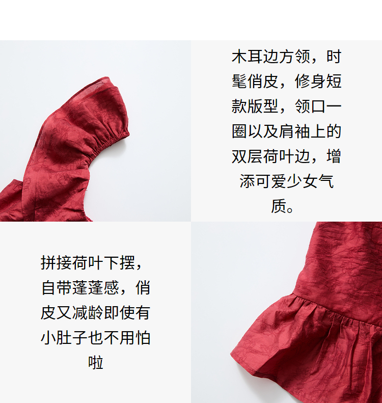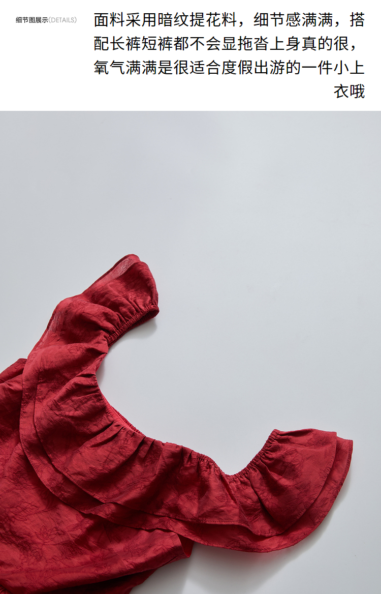 法式浪漫复古暗纹提花衬衫女度假荷叶边方领上衣V2541960