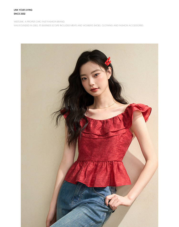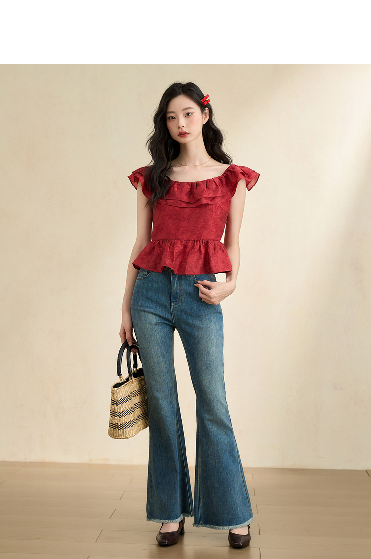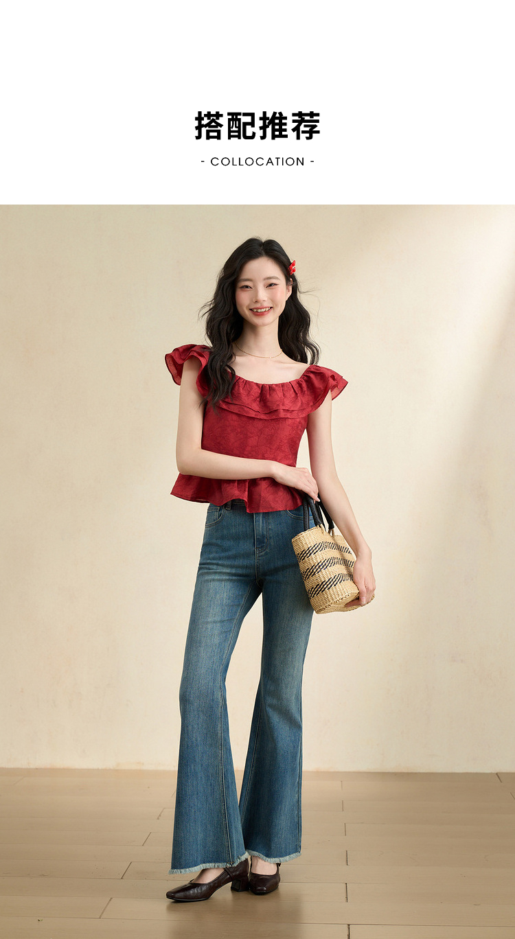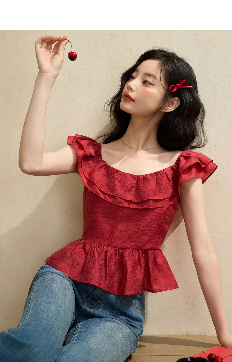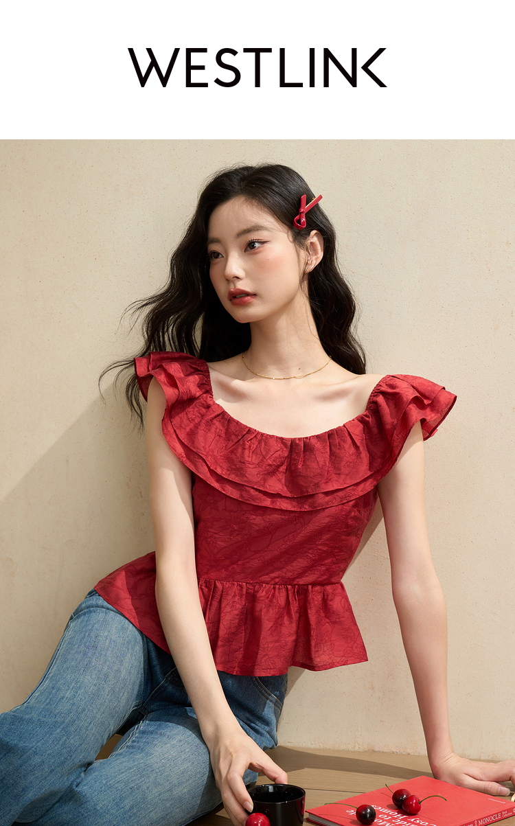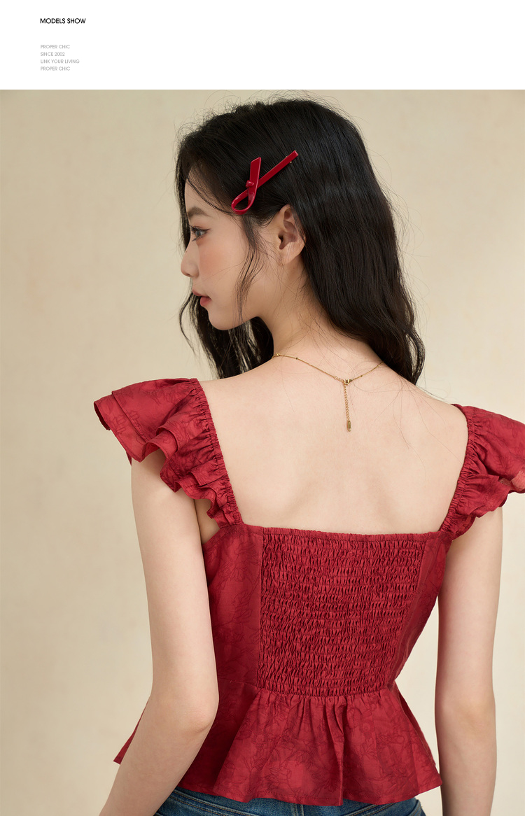 法式浪漫复古暗纹提花衬衫女度假荷叶边方领上衣V2541960