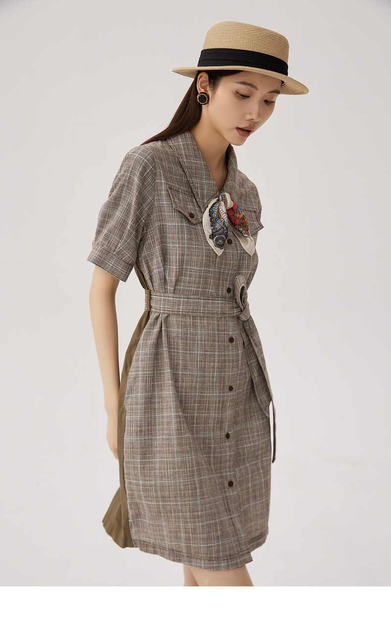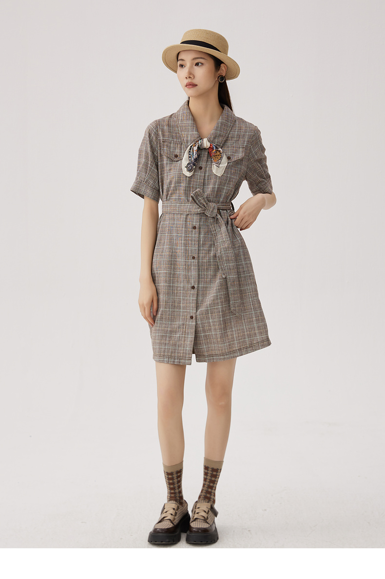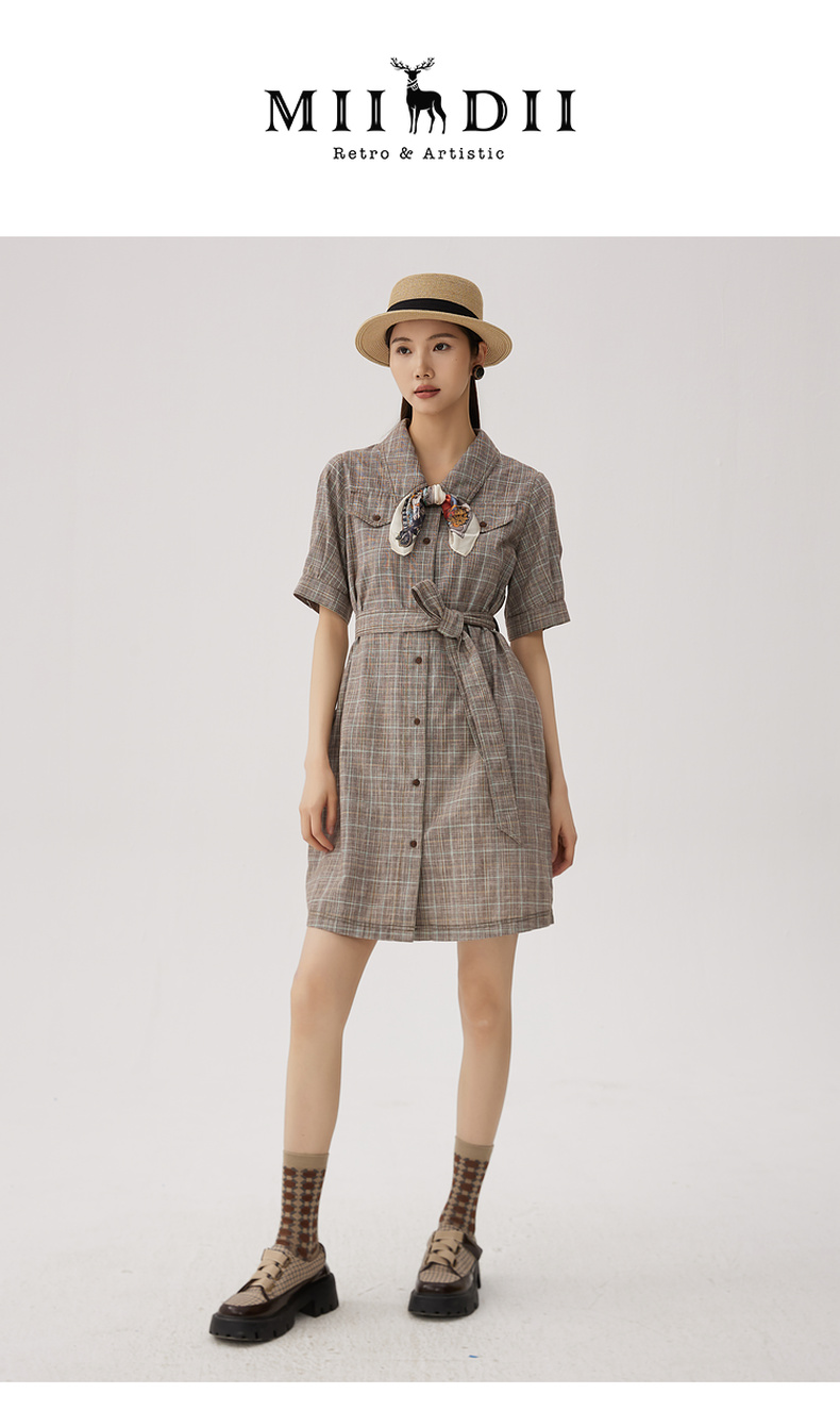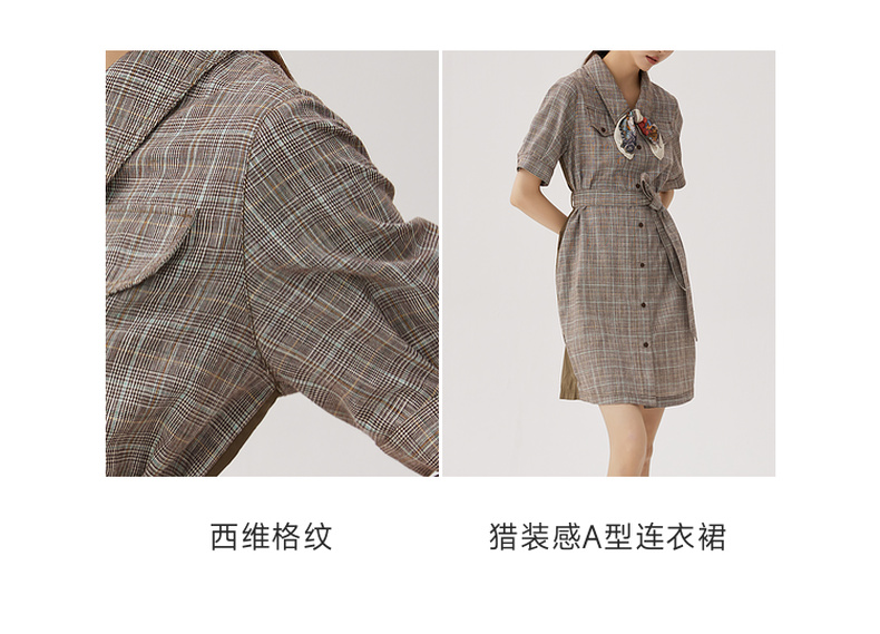谜底格纹连衣裙短袖女2024秋新品复古猎装感短裙配腰带243ML1163