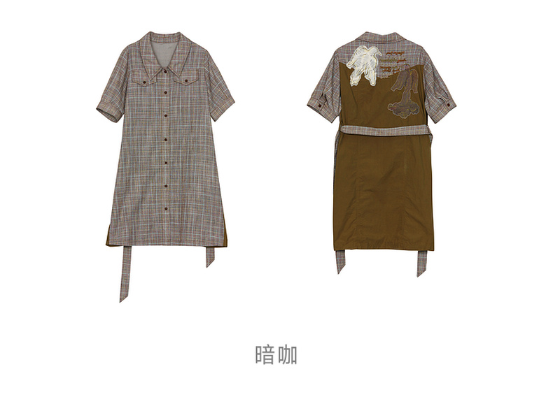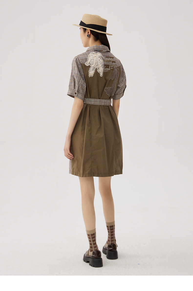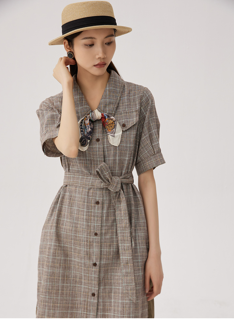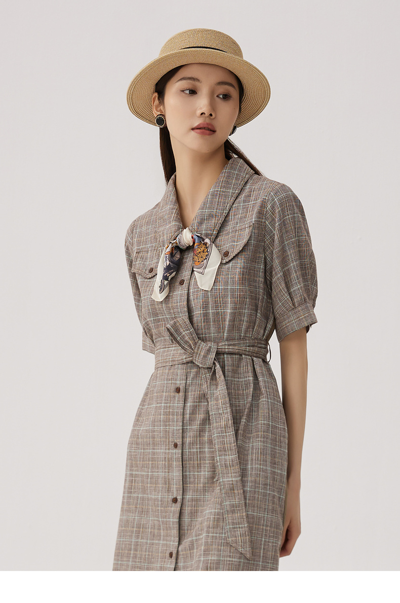 谜底格纹连衣裙短袖女2024秋新品复古猎装感短裙配腰带243ML1163