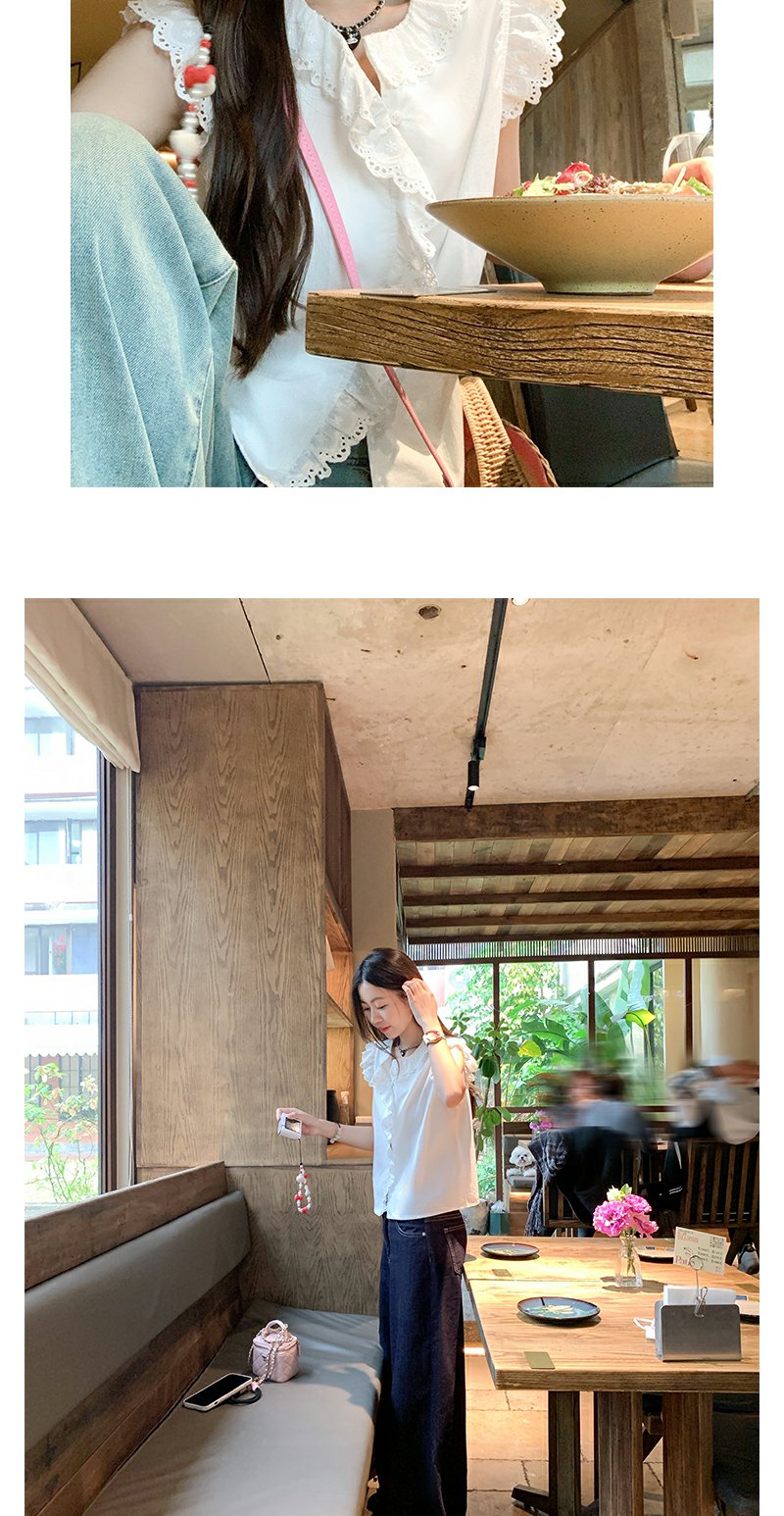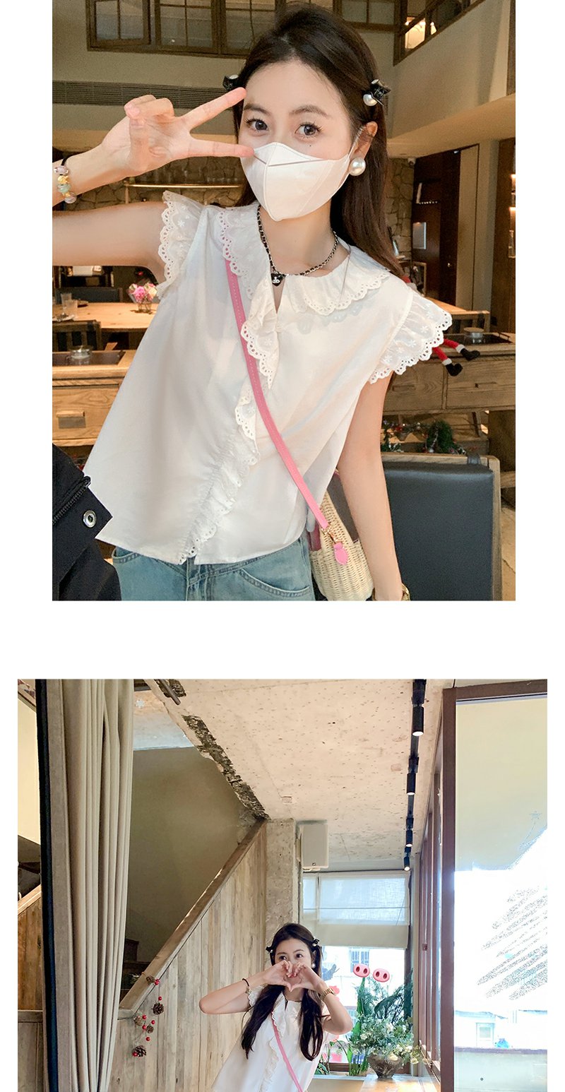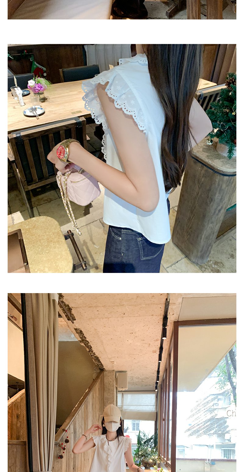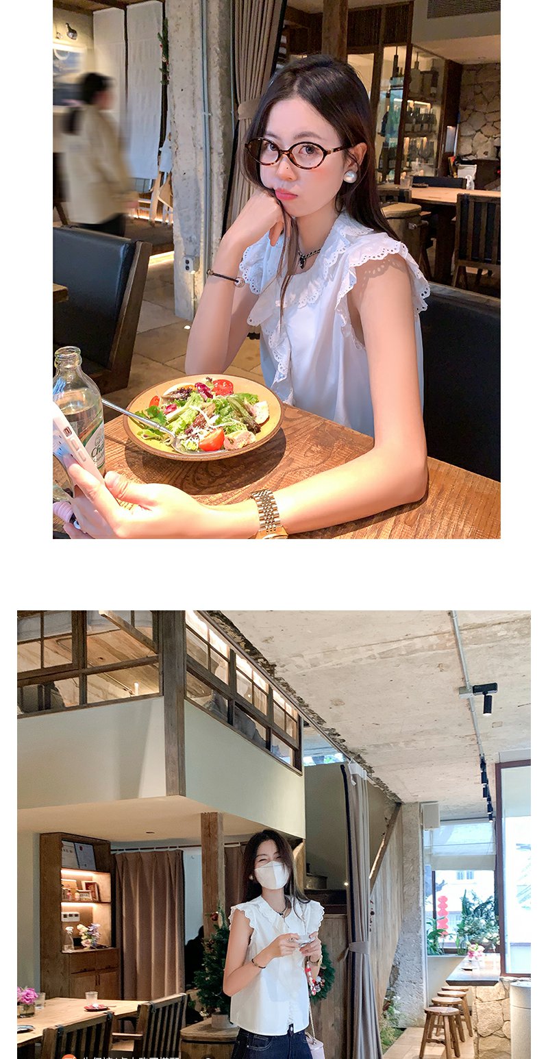 <曾小咸推荐>甜美白色圆领蕾丝边无袖衬衫