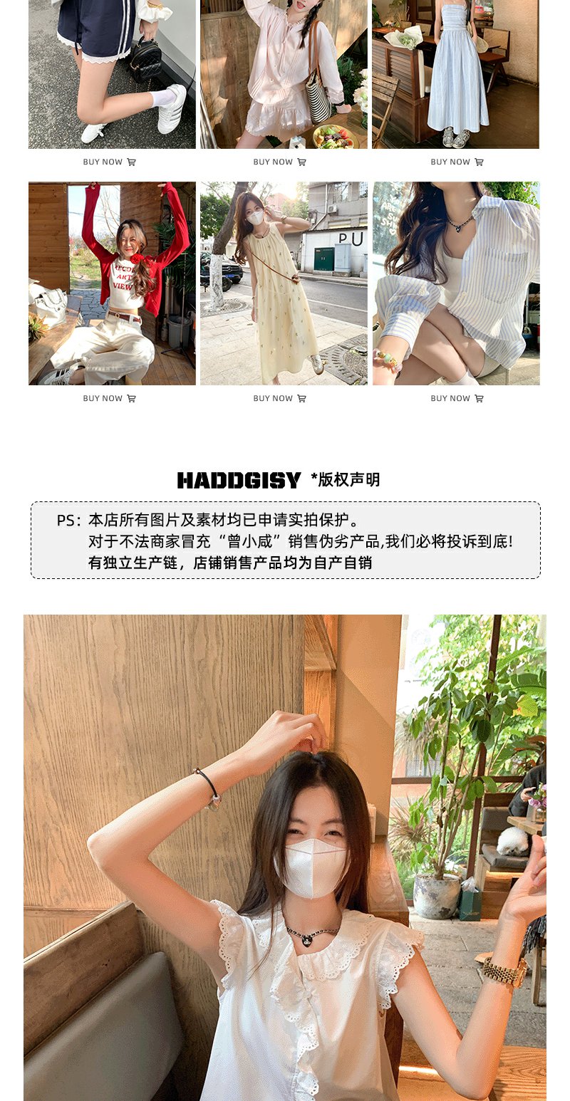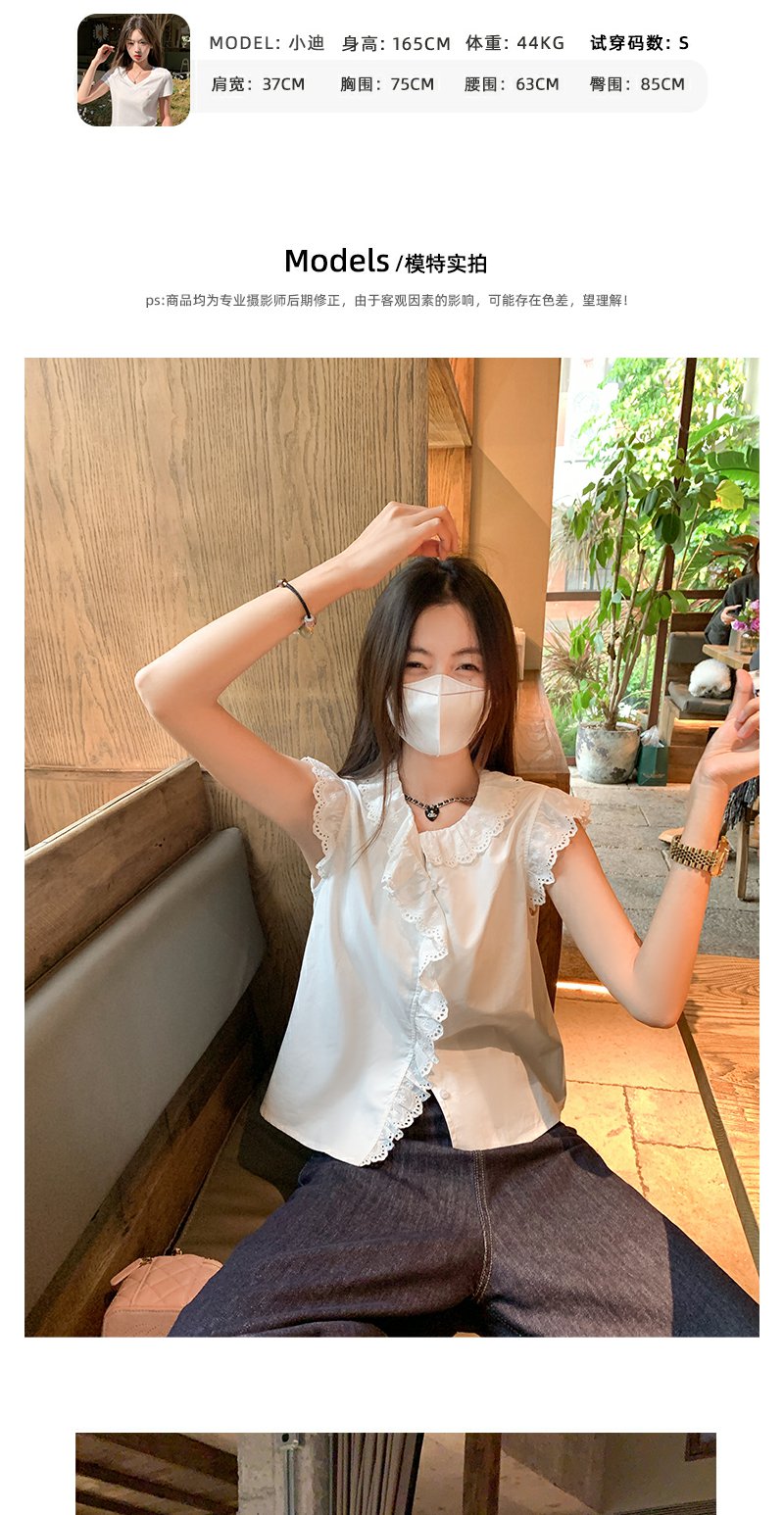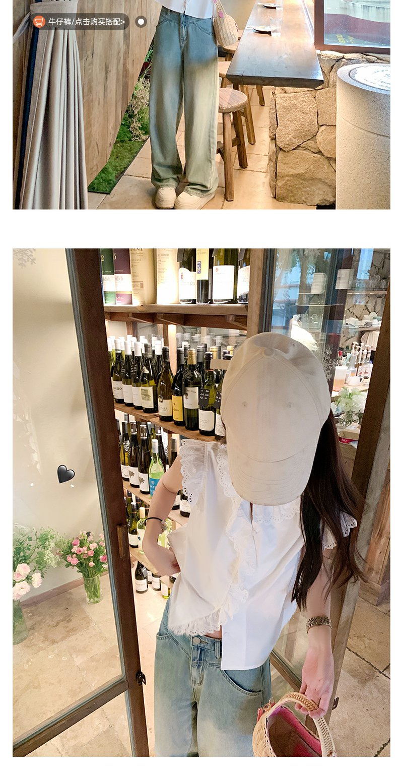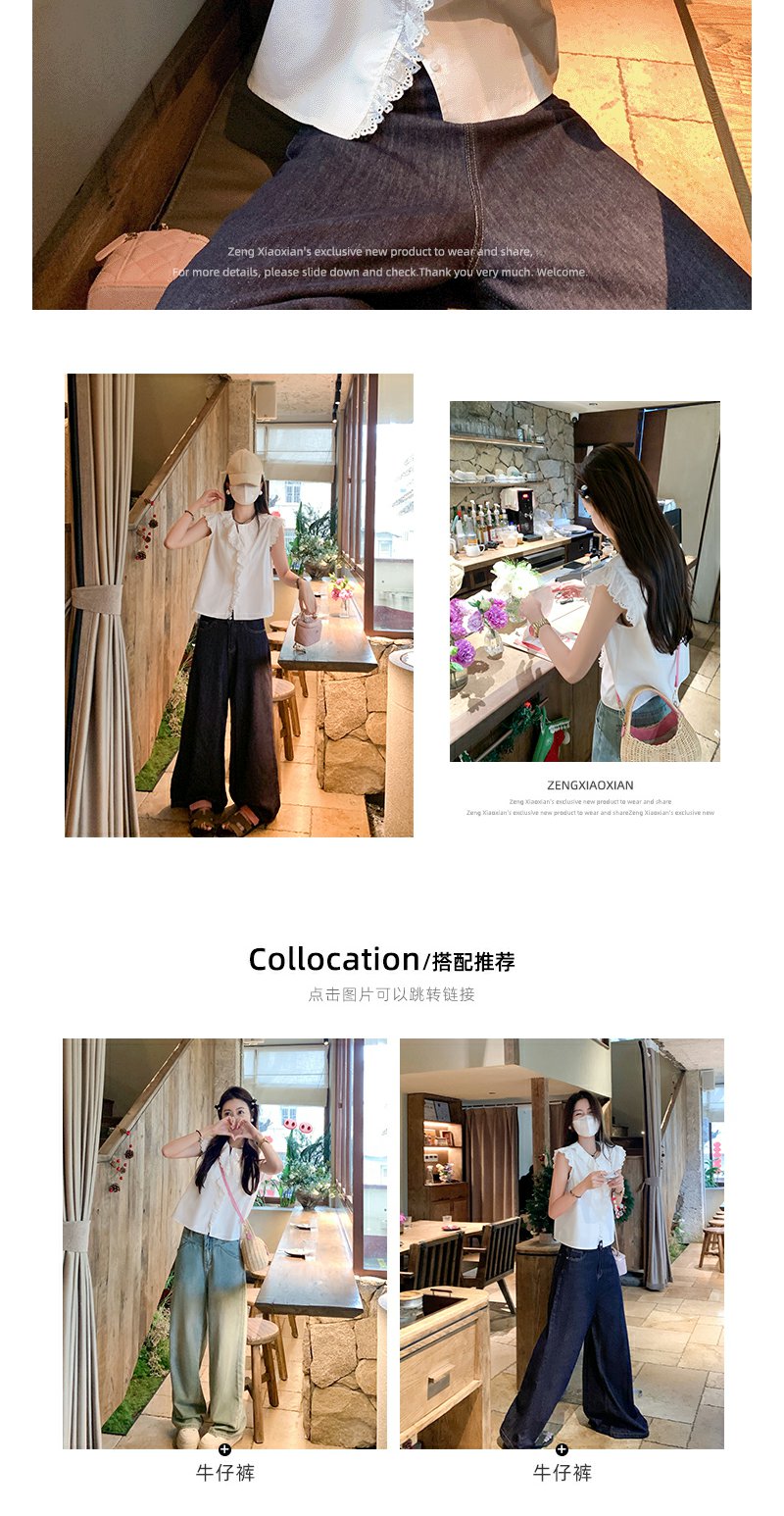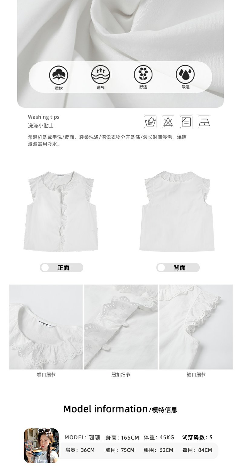 <曾小咸推荐>甜美白色圆领蕾丝边无袖衬衫