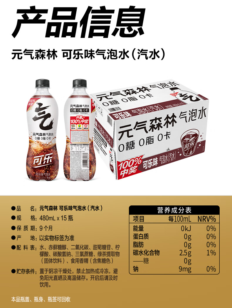 元气森林 无糖气泡水-可乐味480ml*15 (0糖0脂0卡)