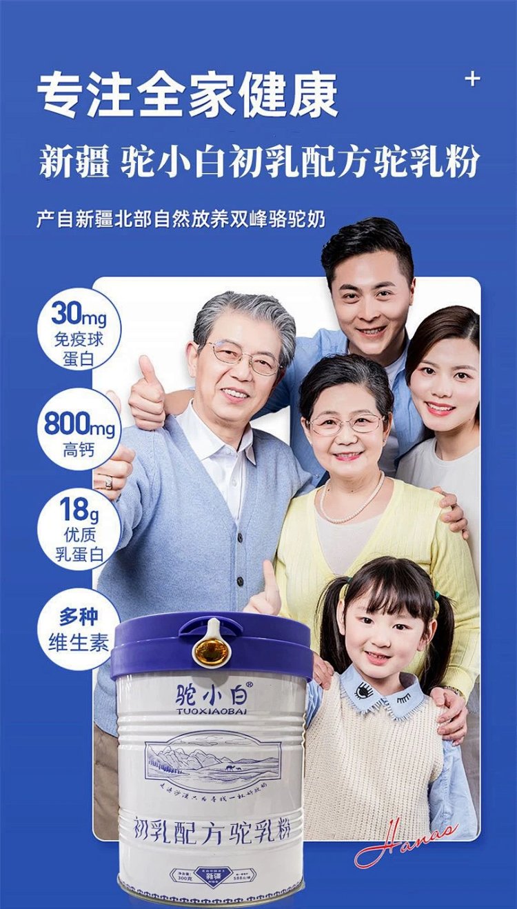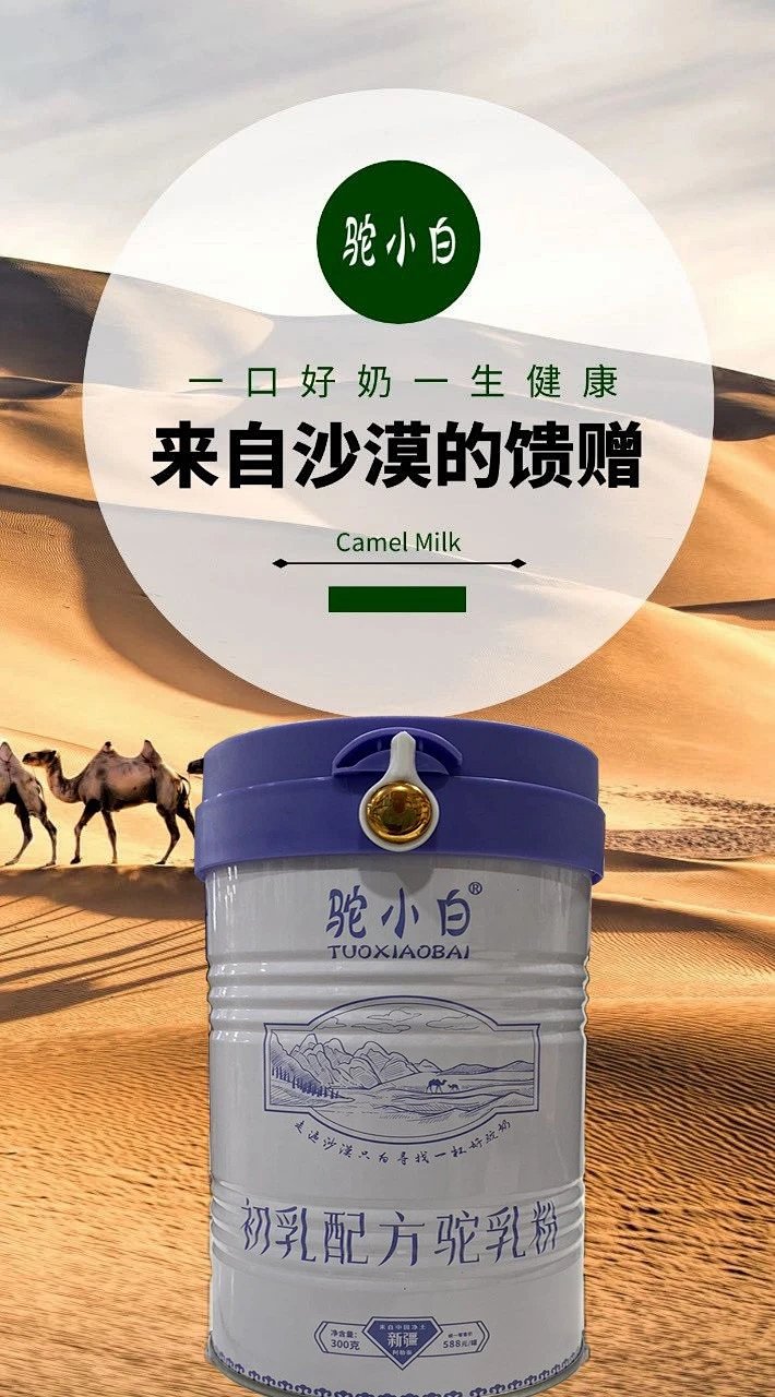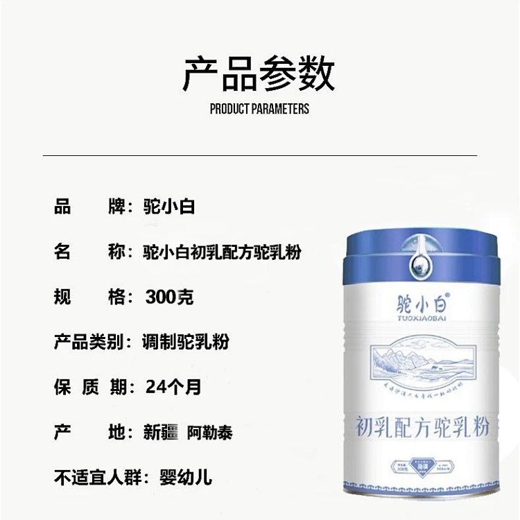 新款驼小白初乳配方驼乳粉品名:新款驼小白初乳配方驼乳粉品牌:驼小白规格:300克生产商:新疆阿勒泰哈纳斯乳业有限公司产地:新疆 阿勒泰不适用人群:婴幼儿保质期:24个月包装:12罐/箱