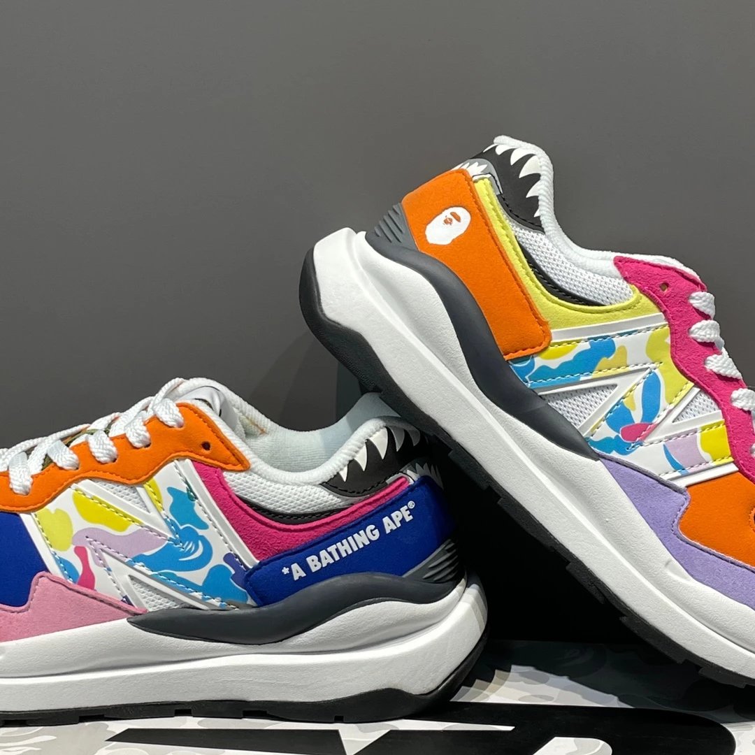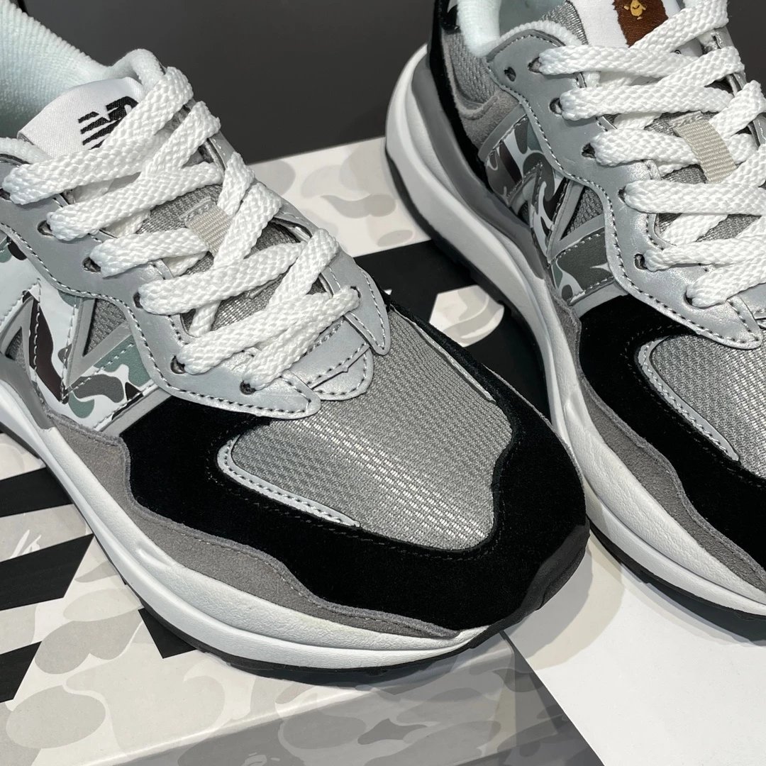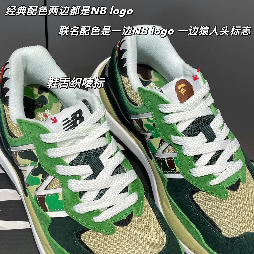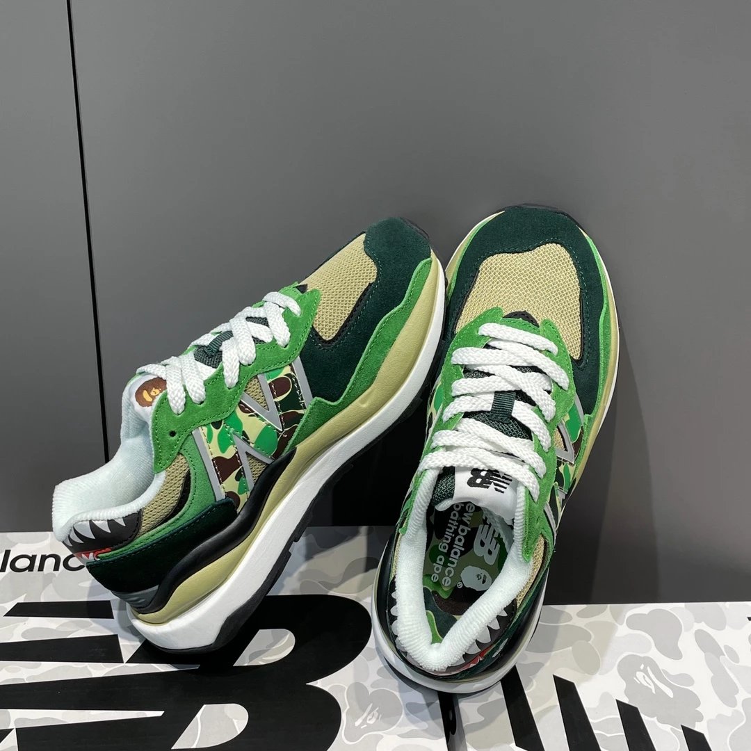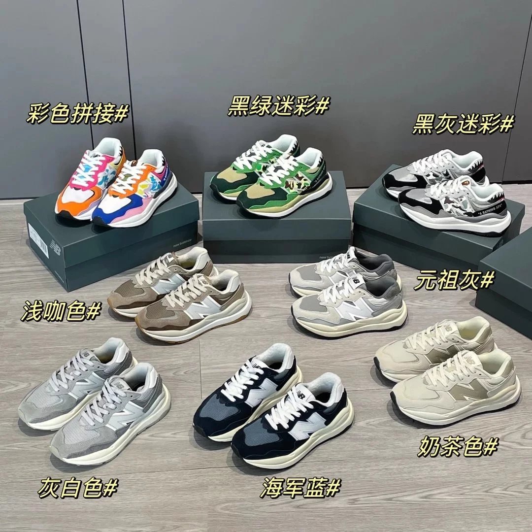 🌟一共8个配色 元祖灰 海军蓝 奶茶色 灰白色 浅咖色 黑灰迷彩 彩色拼接 黑绿迷彩 除了奶茶色只有女码 其它配色都是男女码哈 颜色上你们听我的 没有元祖灰的先入手元祖灰 经典中的经典 比你想象中还要好看还要百搭!已经有了的 试试海军蓝也很不错 男生女生都适合哈 特别是当情侣鞋简直绝了!然后还有奶茶色和浅咖色 真的超级适合秋冬搭配 奶茶色很温柔很日常 浅咖色很复古很有氛围感! 上面说的都是经典色 还有联名色哈 5740经典鞋型搭配上bape标志性迷彩元素 不仅特别还非常的有辨识度 整体给人的感觉超不一样!黑灰迷彩低调内敛 黑绿迷彩山系户外 彩色拼接出挑吸睛! 总之就是各有各的好看哈 大家自己看啦!!