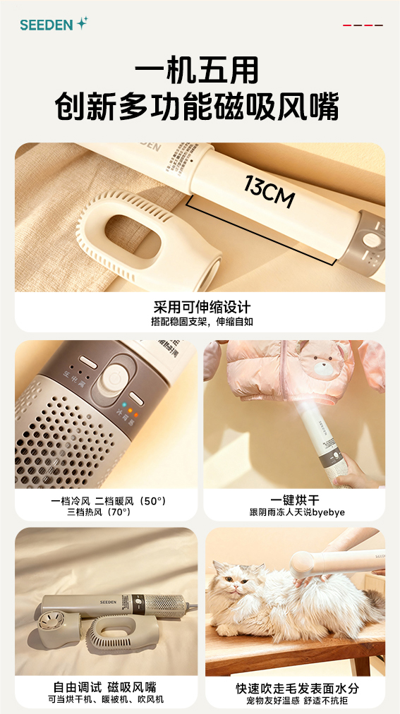 【2025居家“魔法棒”】SEEDEN 高速便携式多功能烘干机(五合一)XD-8500HB西点魔法棒=一台除螨仪+一台干衣机+一台暖被机+一台高效速干吹风机+一台柔顺毛发的宠物吹风机