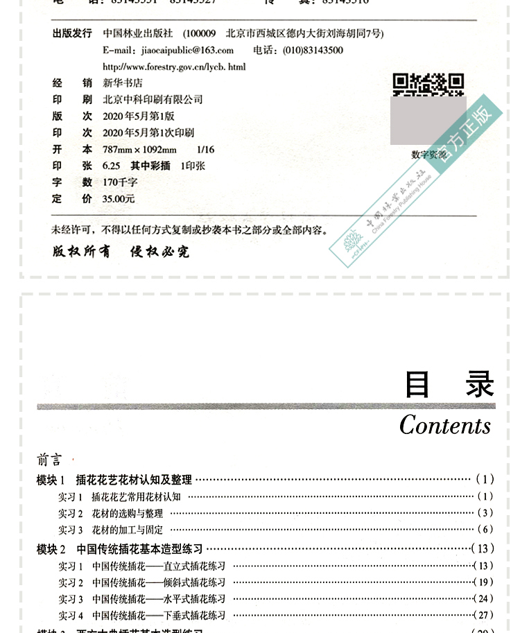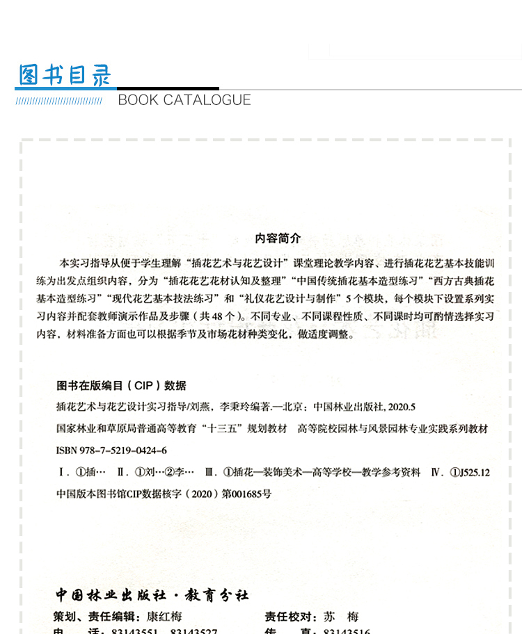 本实习指导从便于学生理解“插花艺术与花艺设计”课堂理论教学内容、进行插花花艺基本技能训练为出发点组织内容,分为“插花花艺花材认知及整理”“中国传统插花基本造型练习”“西方古典插花基本造型练习”“现代花艺基本技法练习”和“礼仪花艺设计与制作”5个模块,每个模块下设置系列实习内容并配套教师演示作品及步骤(共48个)。不同专业、不同课程性质、不同课时均可酌情选择实习内容,材料准备方面也可以根据季节及市场花材种类变化,做适度调整。