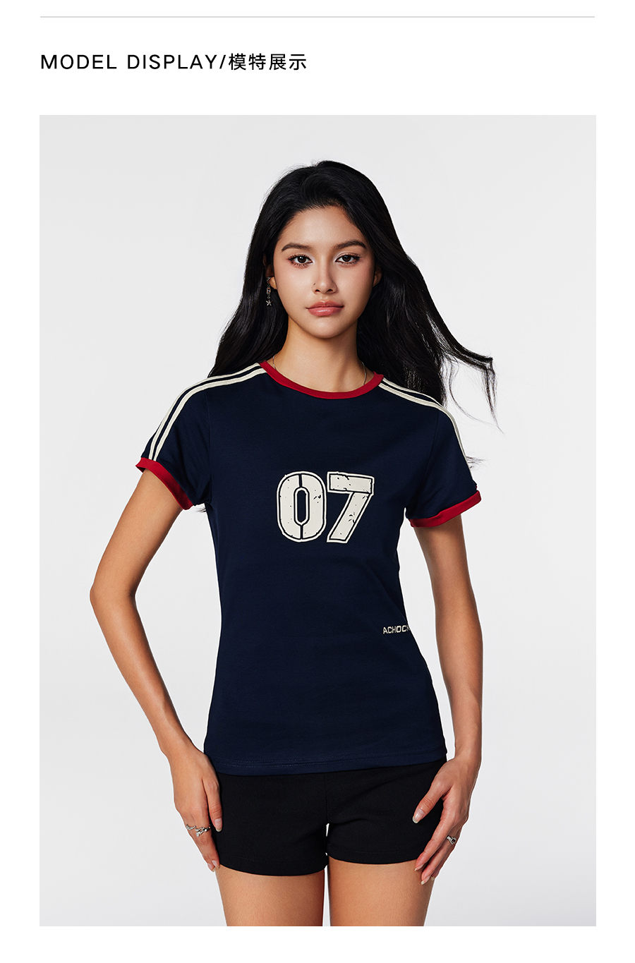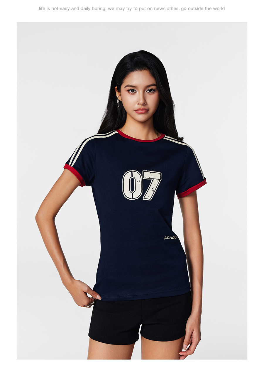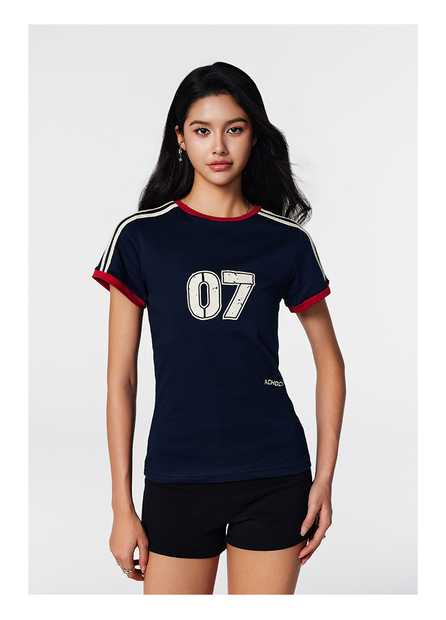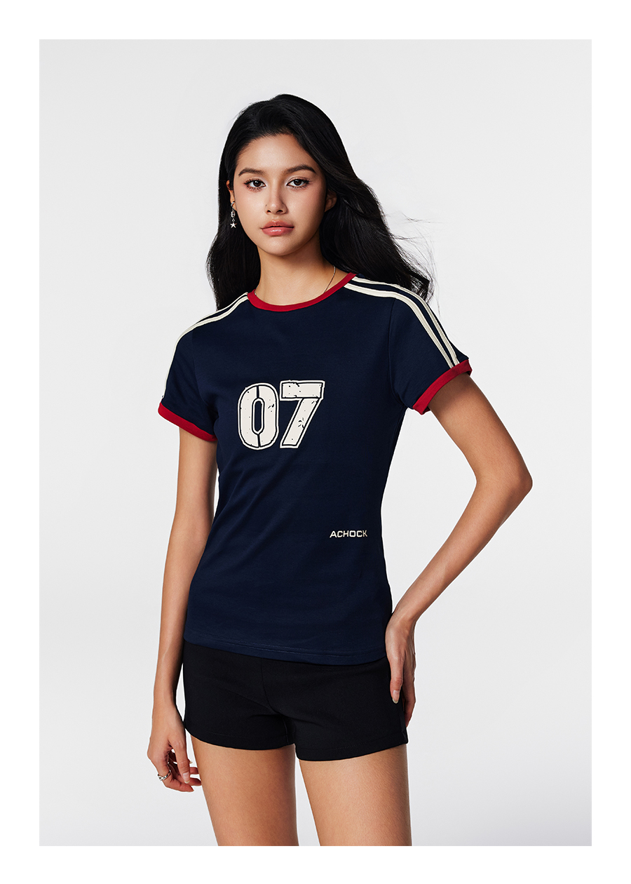 【Achock官方店】美式复古辣妹撞色条纹拼接潮牌显瘦修身短袖体恤