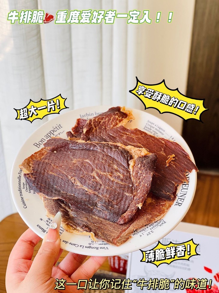 巨大一片,比纸还轻薄,可以透光的程度,吃起来口感超级酥脆,不干硬也不难嚼,老少咸宜。薄如蝉翼的牛排脆🥩口口酥脆,吃起来咔呲咔呲的,超过瘾~