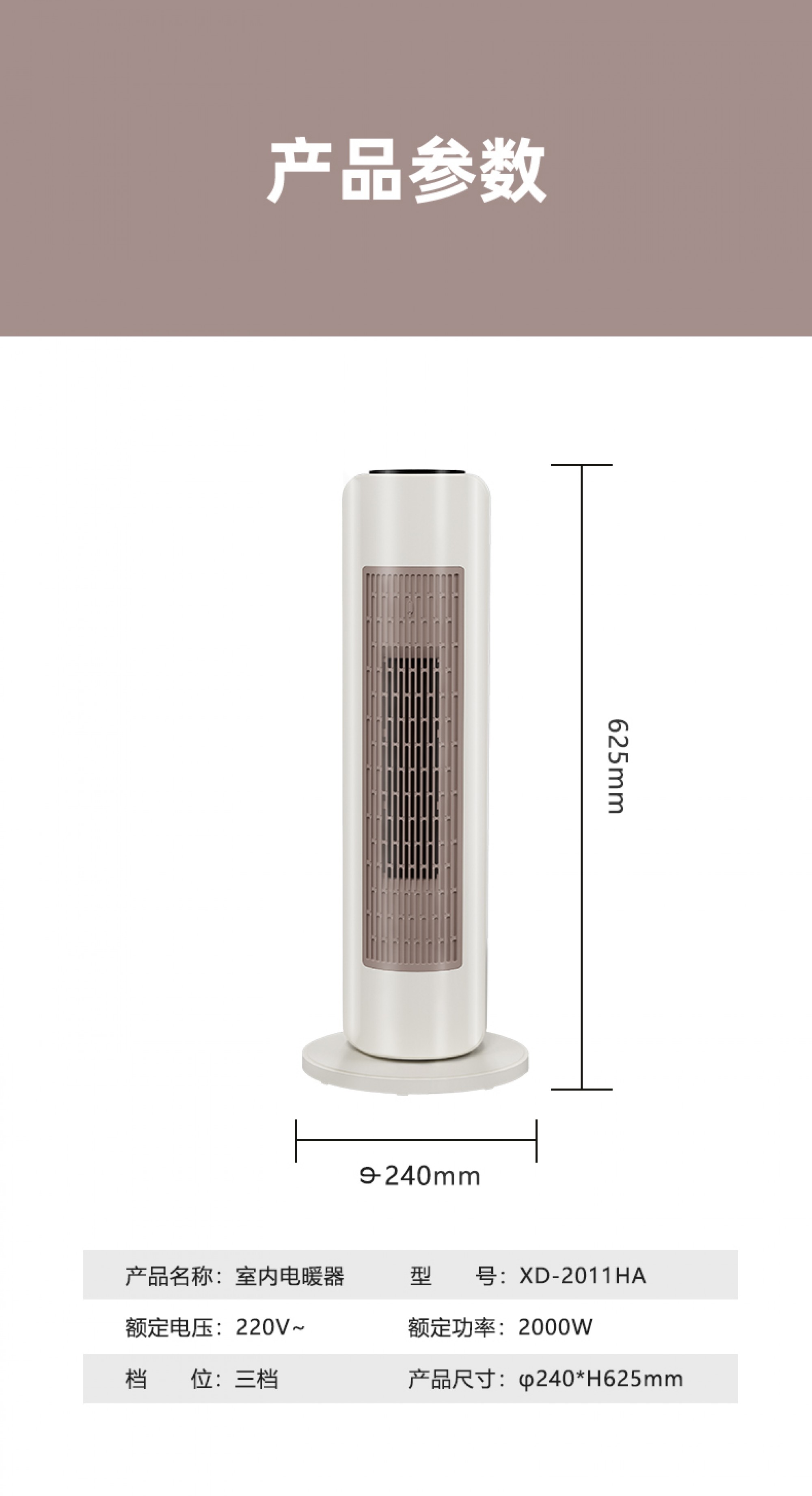 机械款和电子款都是采用PTC陶瓷发热,拥有强大的制热能力,2000W大功率,让室内快速升温。