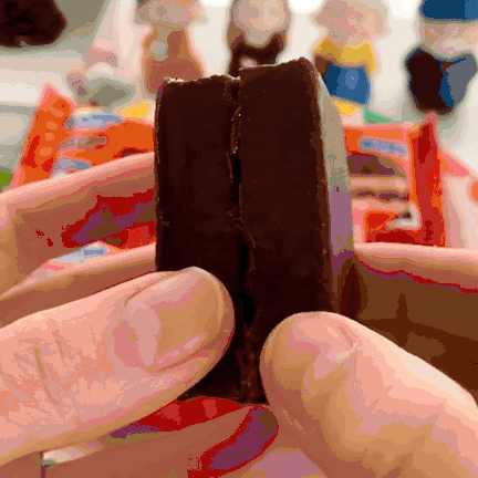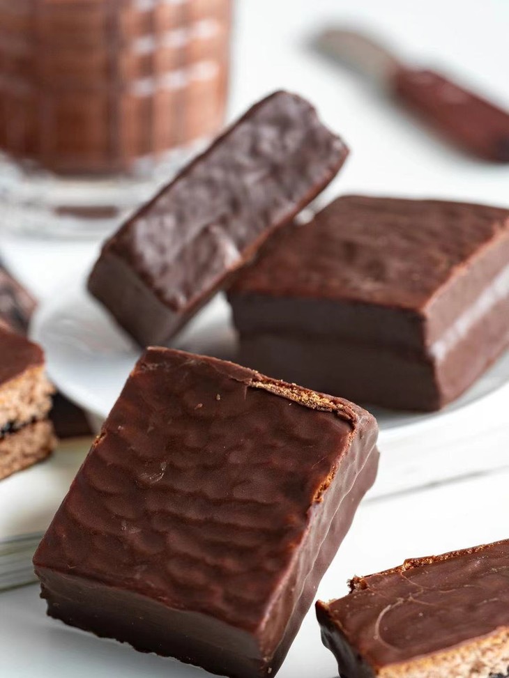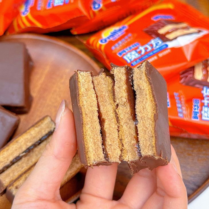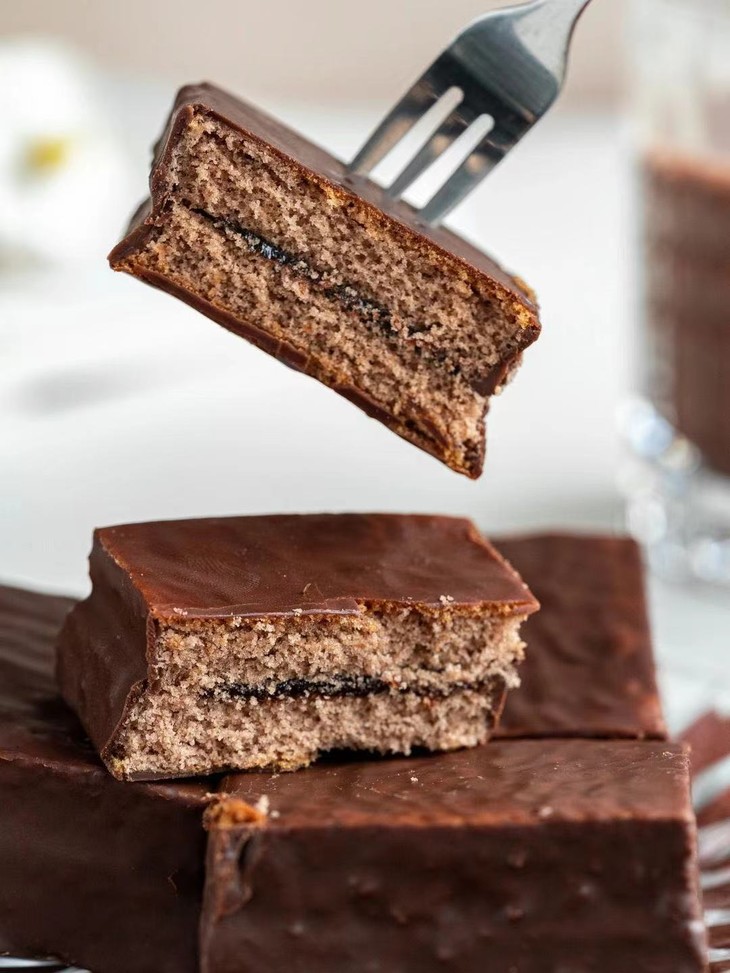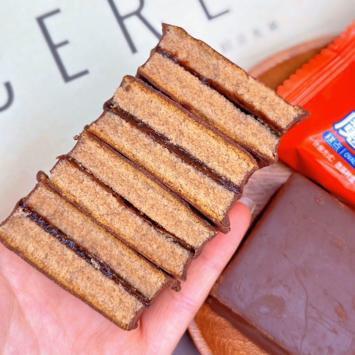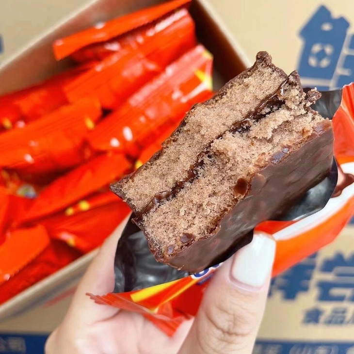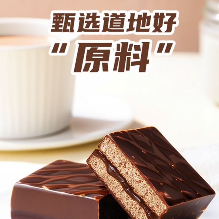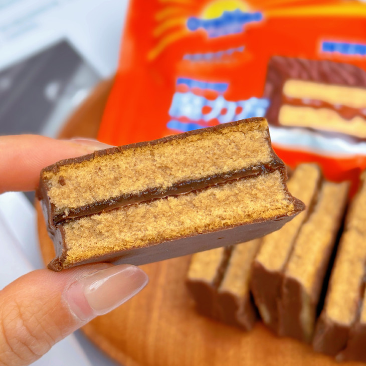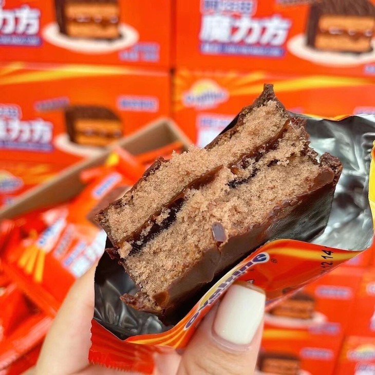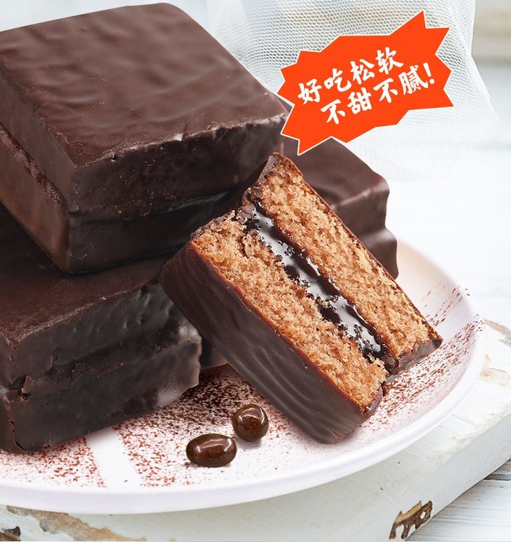 第三款:魔力方 外面一层薄薄的巧克力涂层,吃起来顺滑但是不腻 而且厚切的它在块头上的优势就hin明显 早饭来一个贼扛饿 下午茶解解馋也是不错的选择呦~ 而且蛋糕的弹性也棒,轻轻按压回弹感强 巧克力涂层和夹心的味道非常浓郁~好吃!