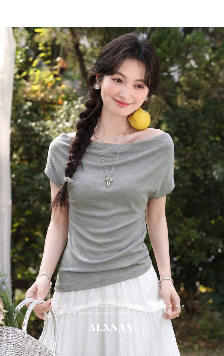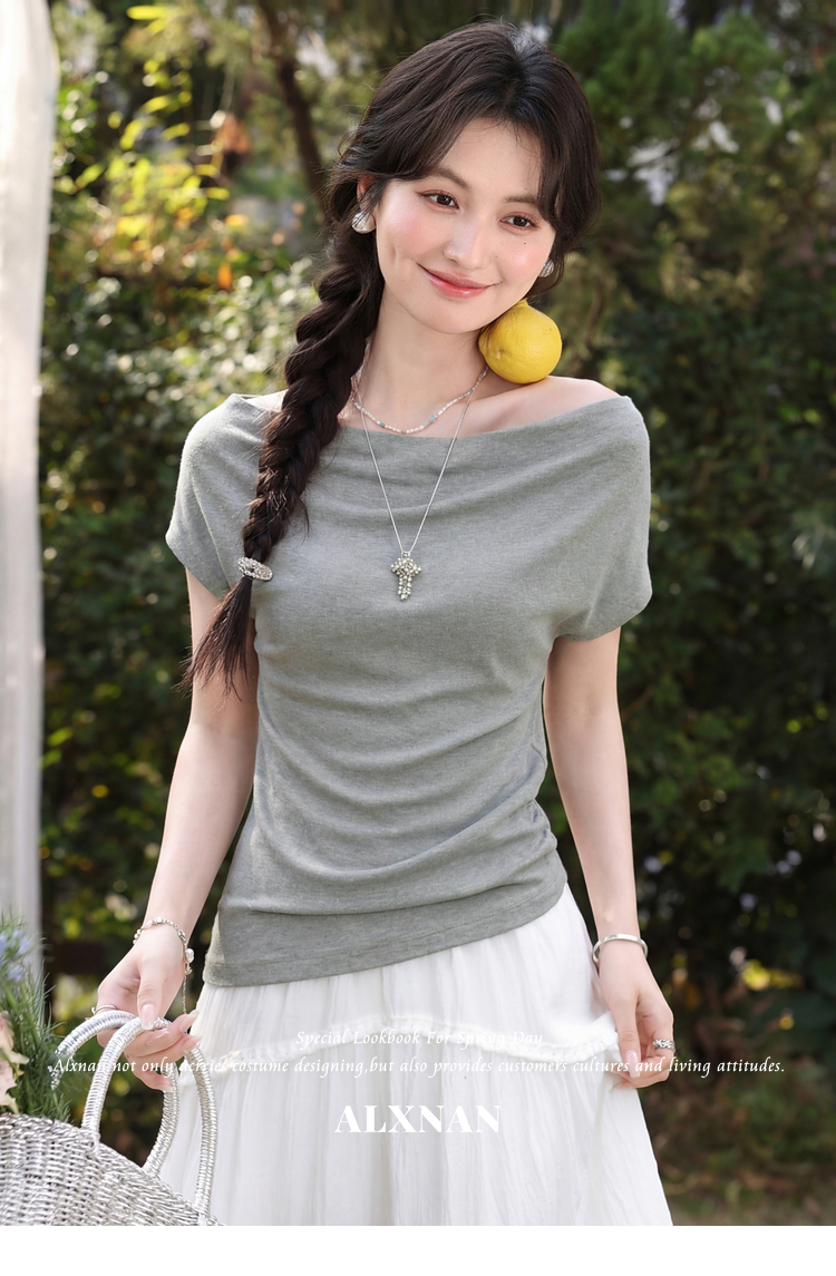 鹿向南「沐风栖云」莱赛尔V领白色T恤女夏季气质通勤掐腰短袖上衣
