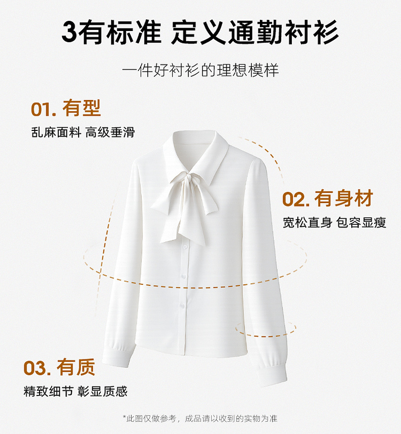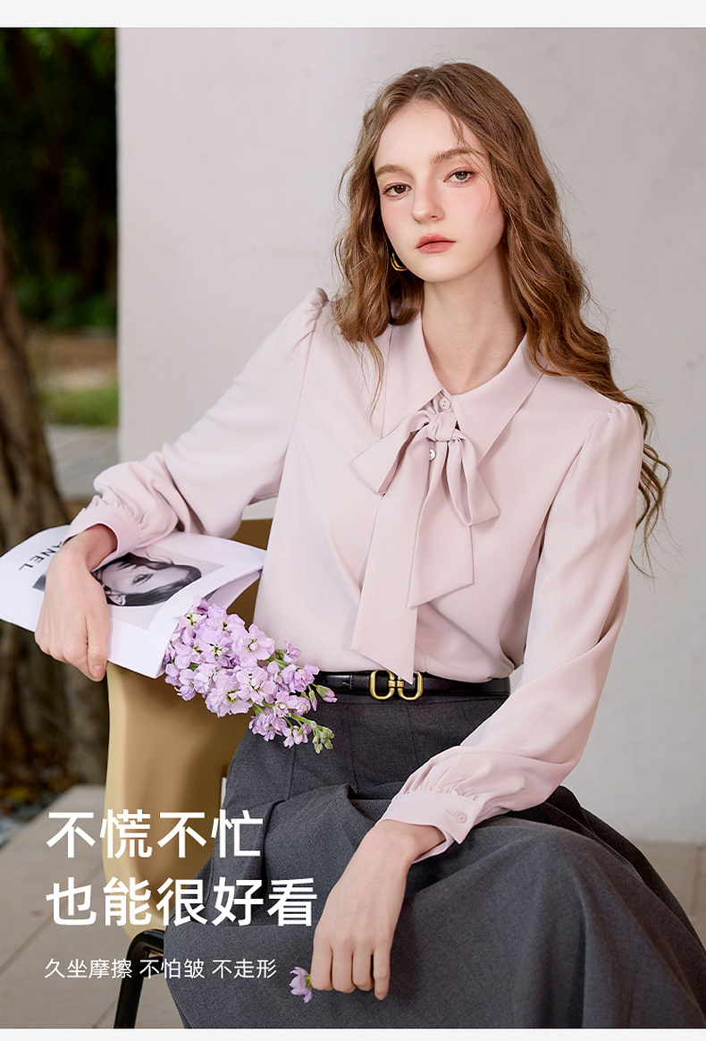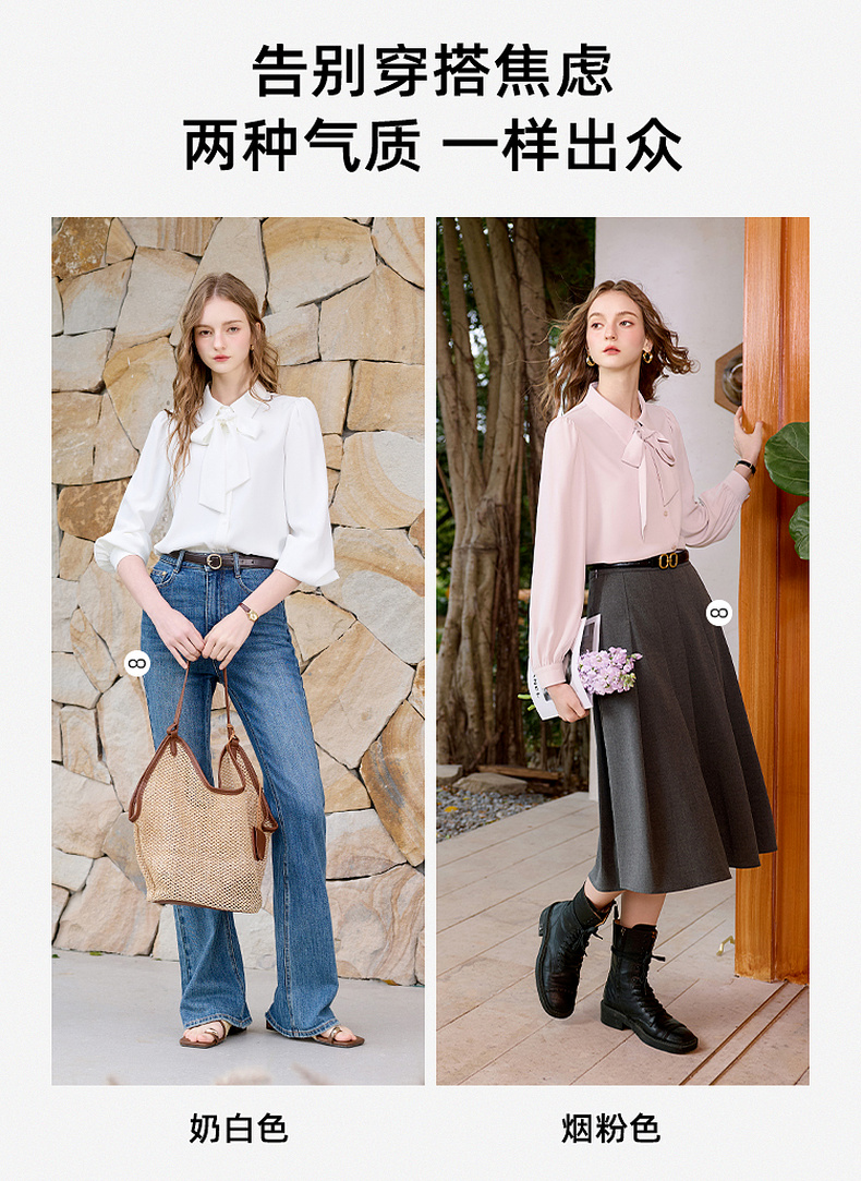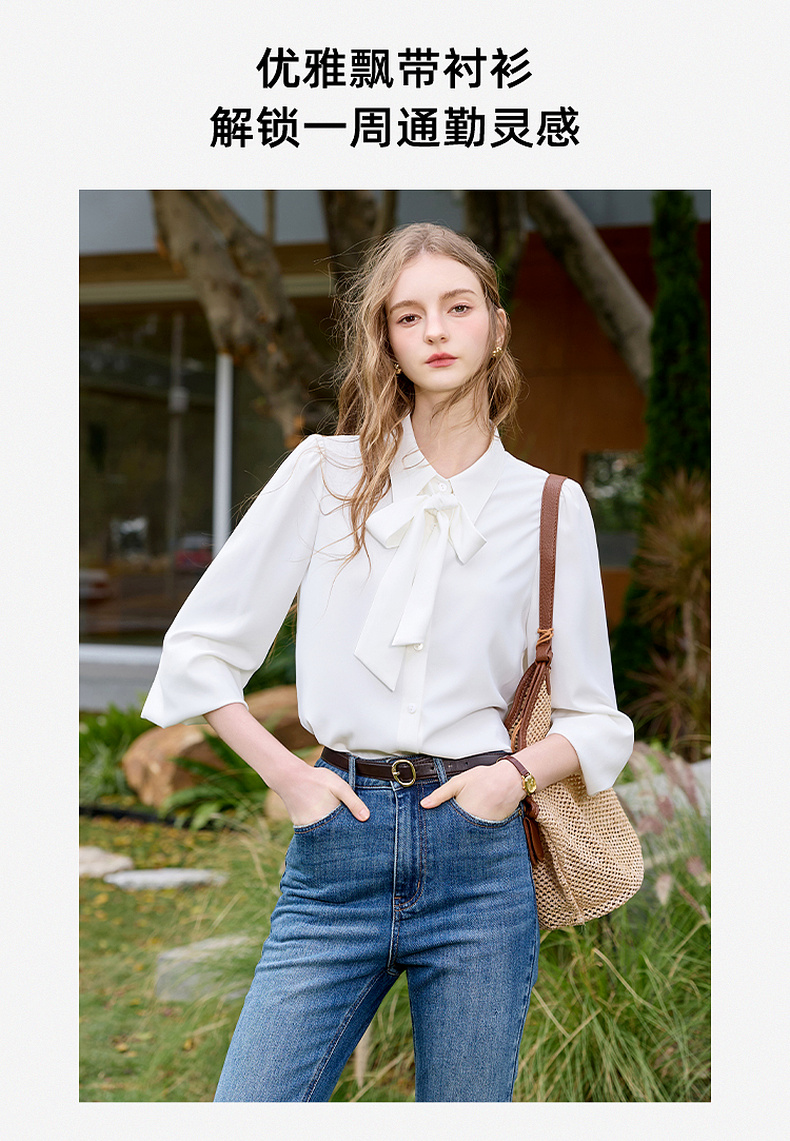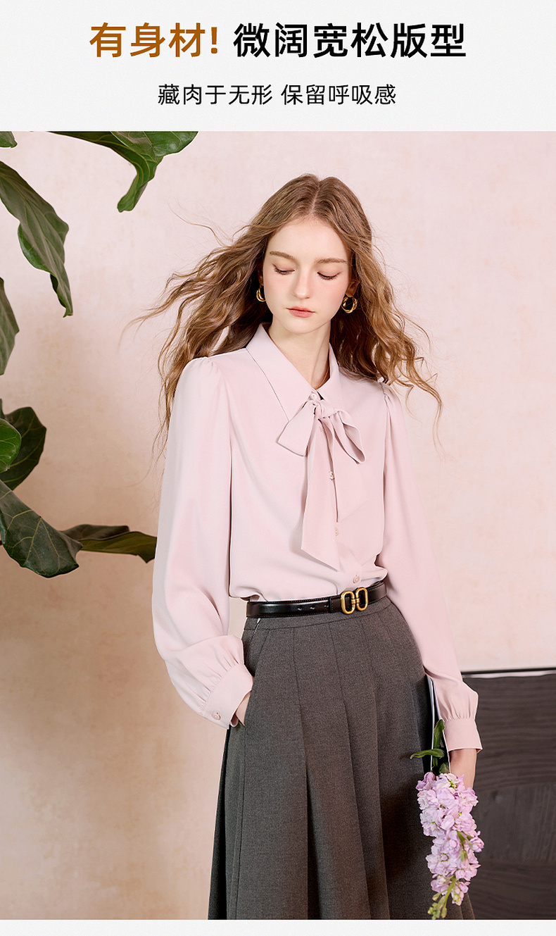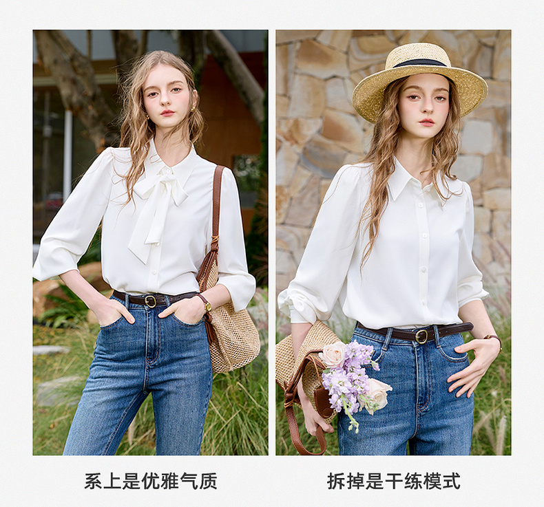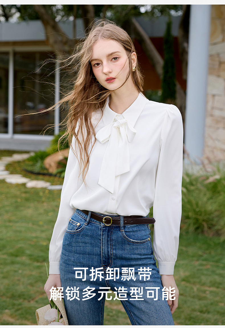 三彩2026春季新款翻领衬衫飘带可拆卸宽松衬衣优雅气质M