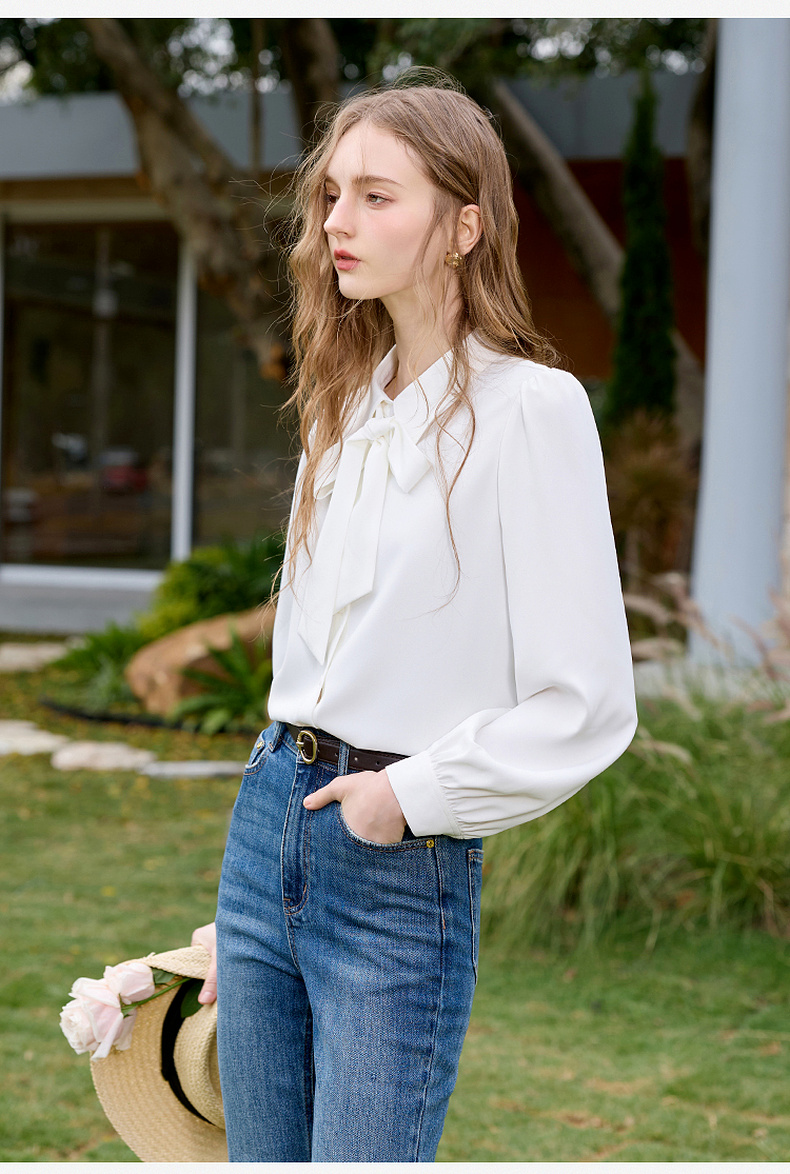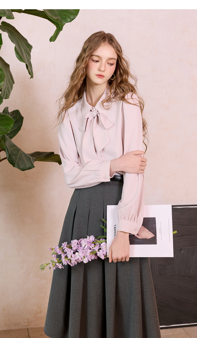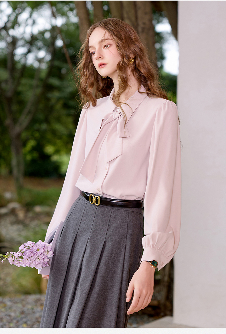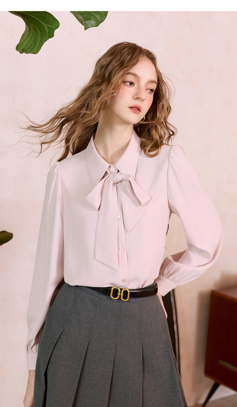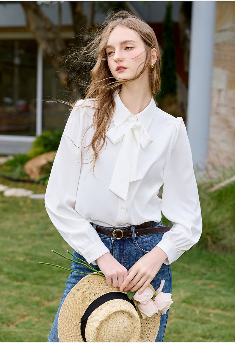 三彩2026春季新款翻领衬衫飘带可拆卸宽松衬衣优雅气质M