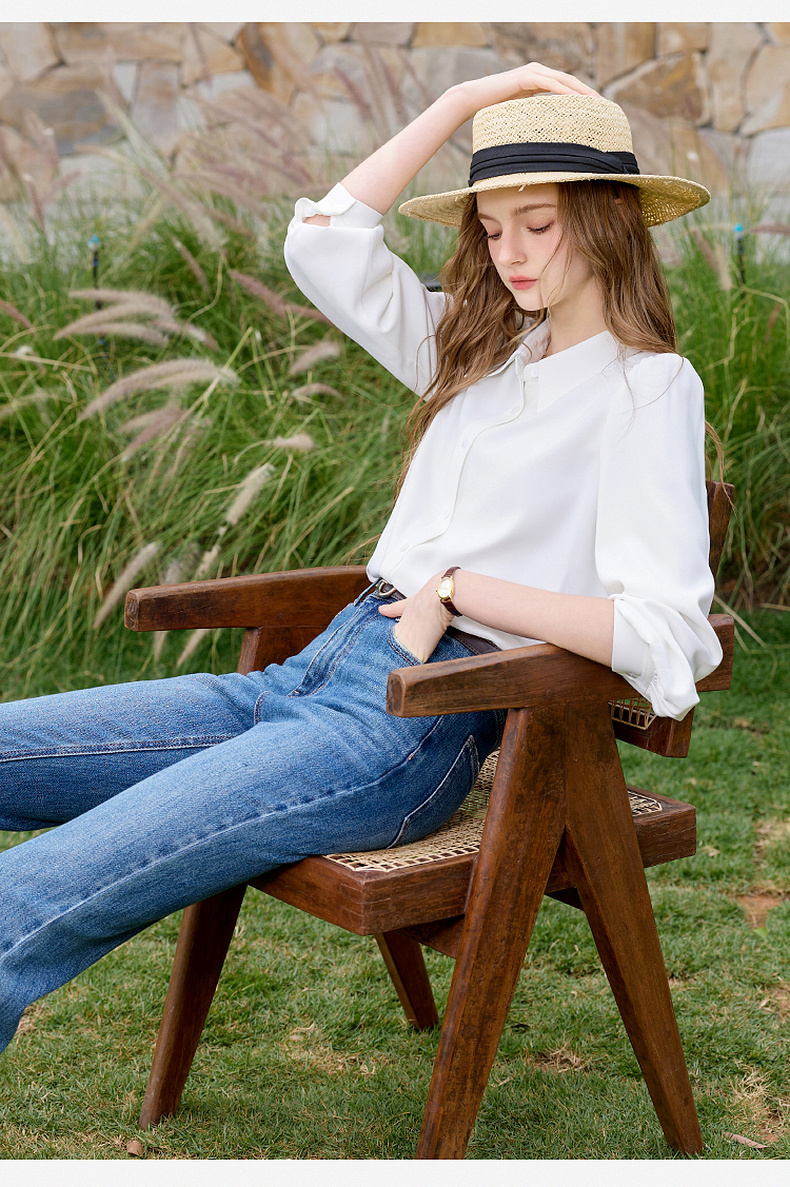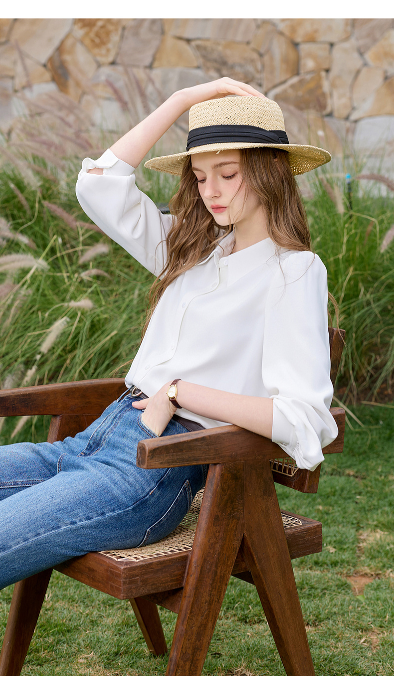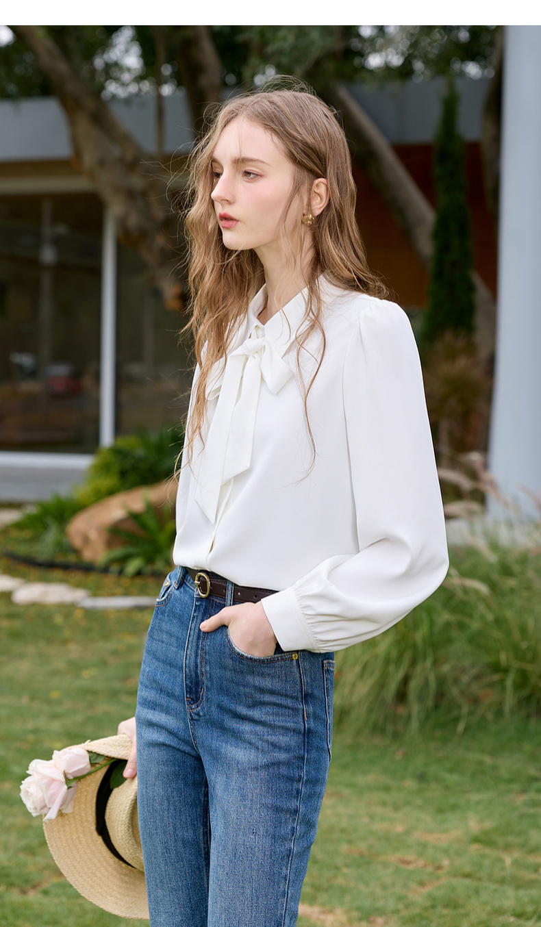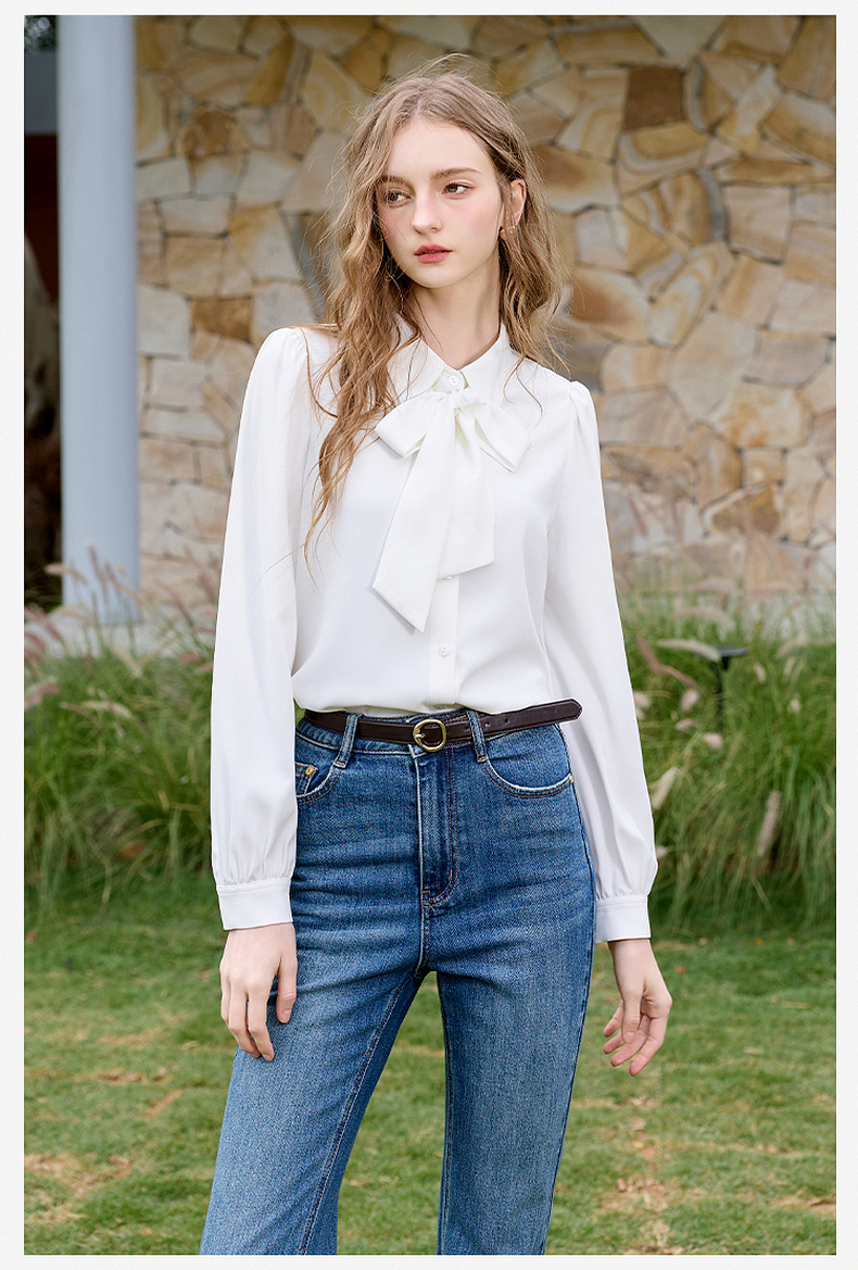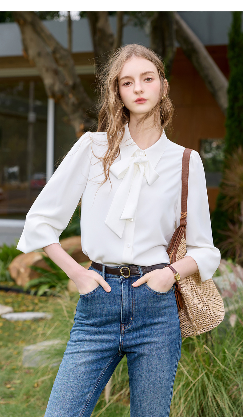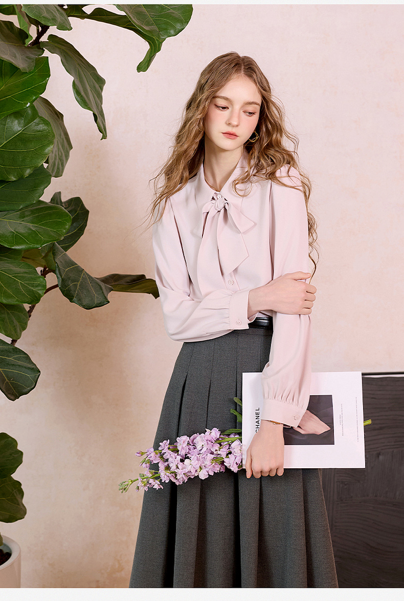 三彩2026春季新款翻领衬衫飘带可拆卸宽松衬衣优雅气质M
