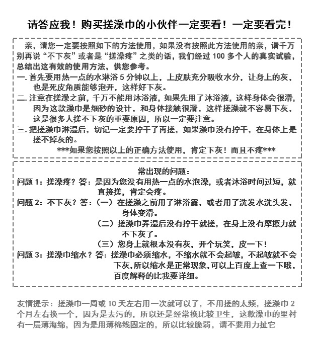 科普🔰 🔰 ✅ 搓澡巾下水缩水 不缩水就不会起皱,不起皱就不会下灰 所以缩水是正常现象但是不会缩很多 ✅ 很多人搓澡前都要泡会澡 或者桑拿房汗蒸一会才去搓澡这样就好搓灰很多。