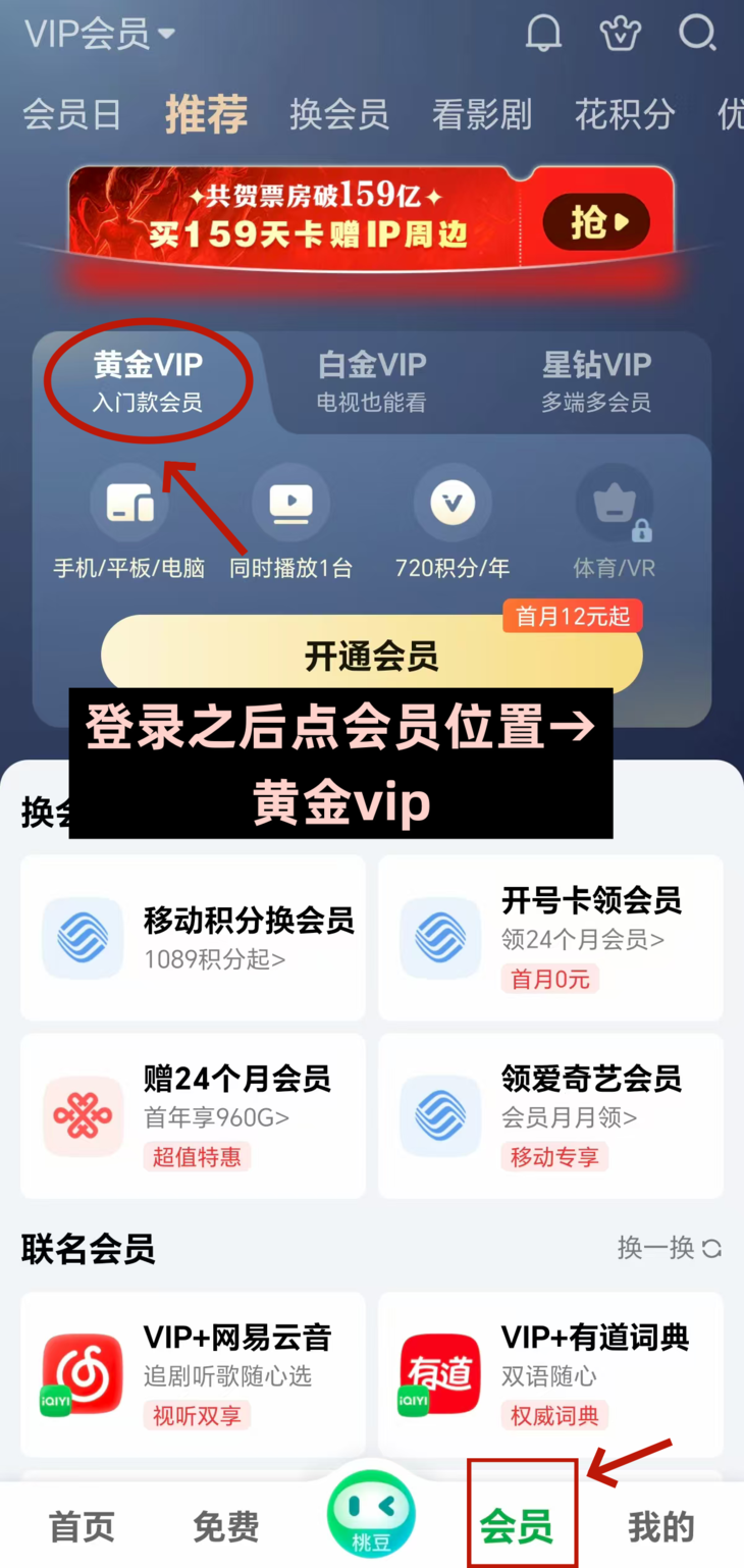 1. 在爱奇艺app → 登录手机账号 → 会员 →