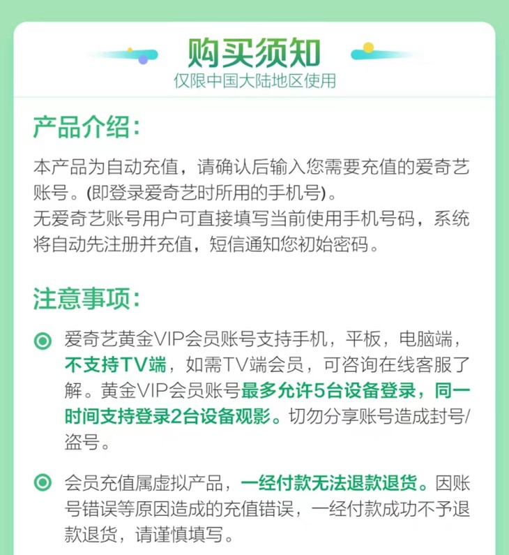 ▸下单时请再三确认好您爱奇艺APP绑定的手机号,这个是直充账户的。
