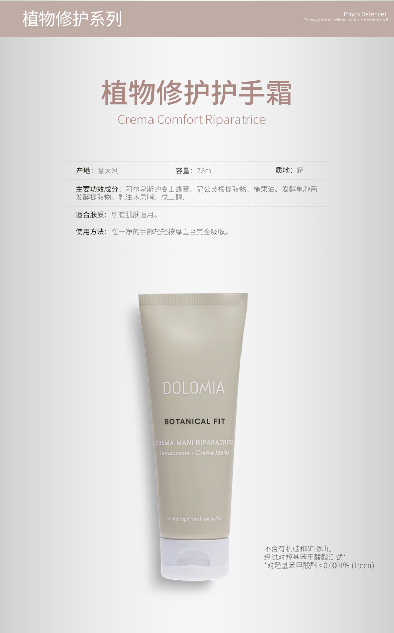 意大利DOLOMIA植物修护护手霜75ml保湿滋润不油腻弹嫩双手