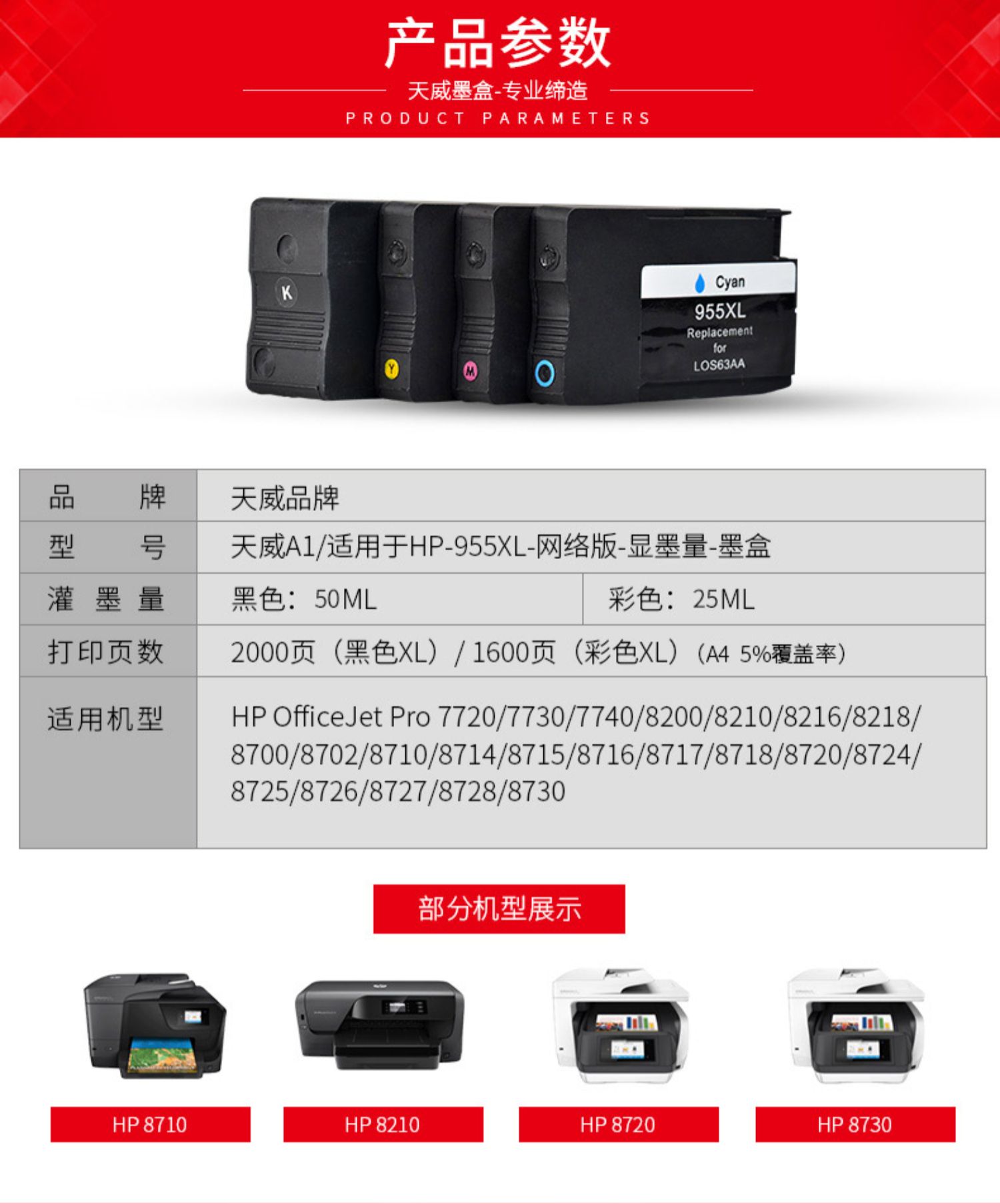 天威955XL墨盒 适用惠普hp 8210 8710 8720 7720 7730 7740打印机墨盒 四色套装