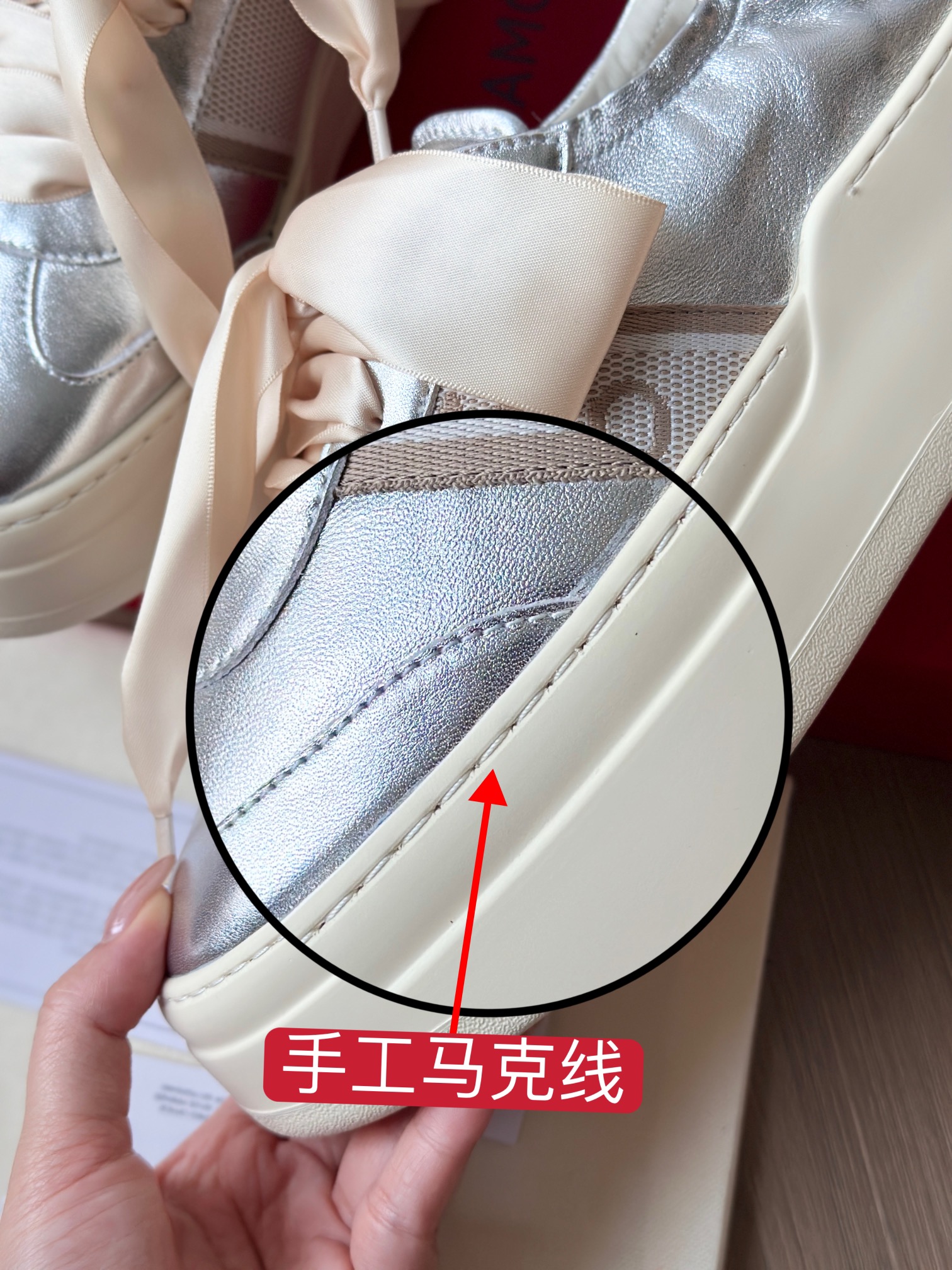 鞋底周圈全部实线 纯马克线缝制 耐穿不易开胶,大牌才有的工序!
