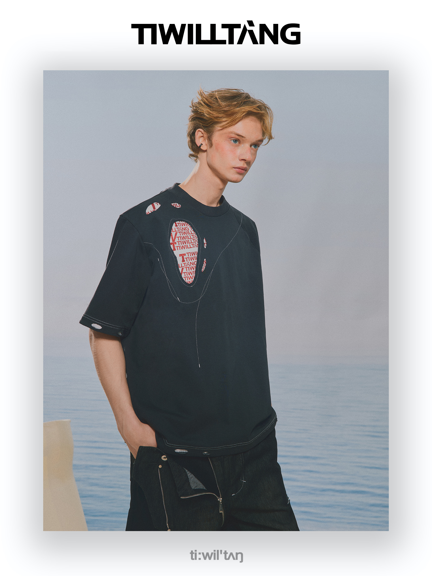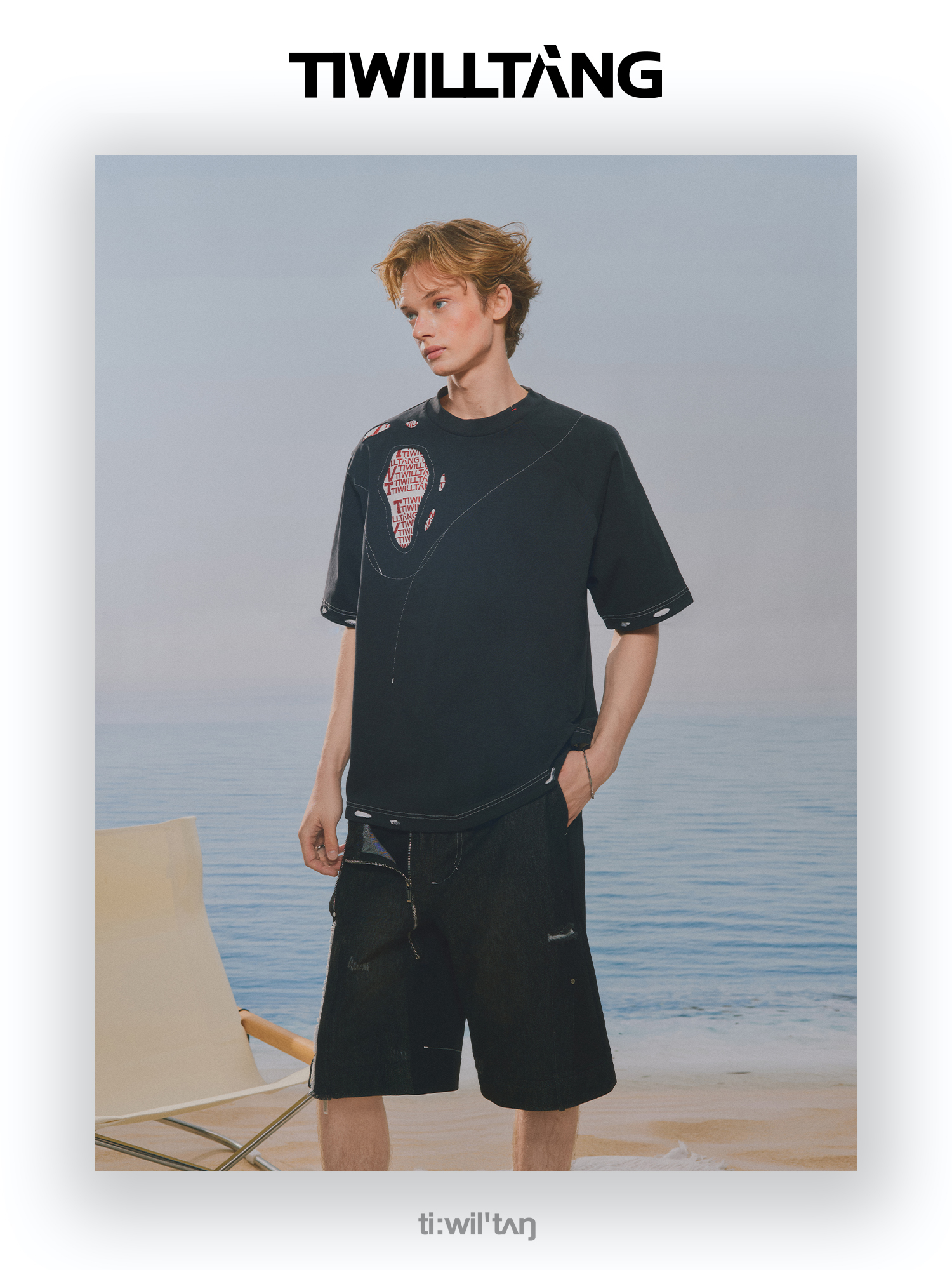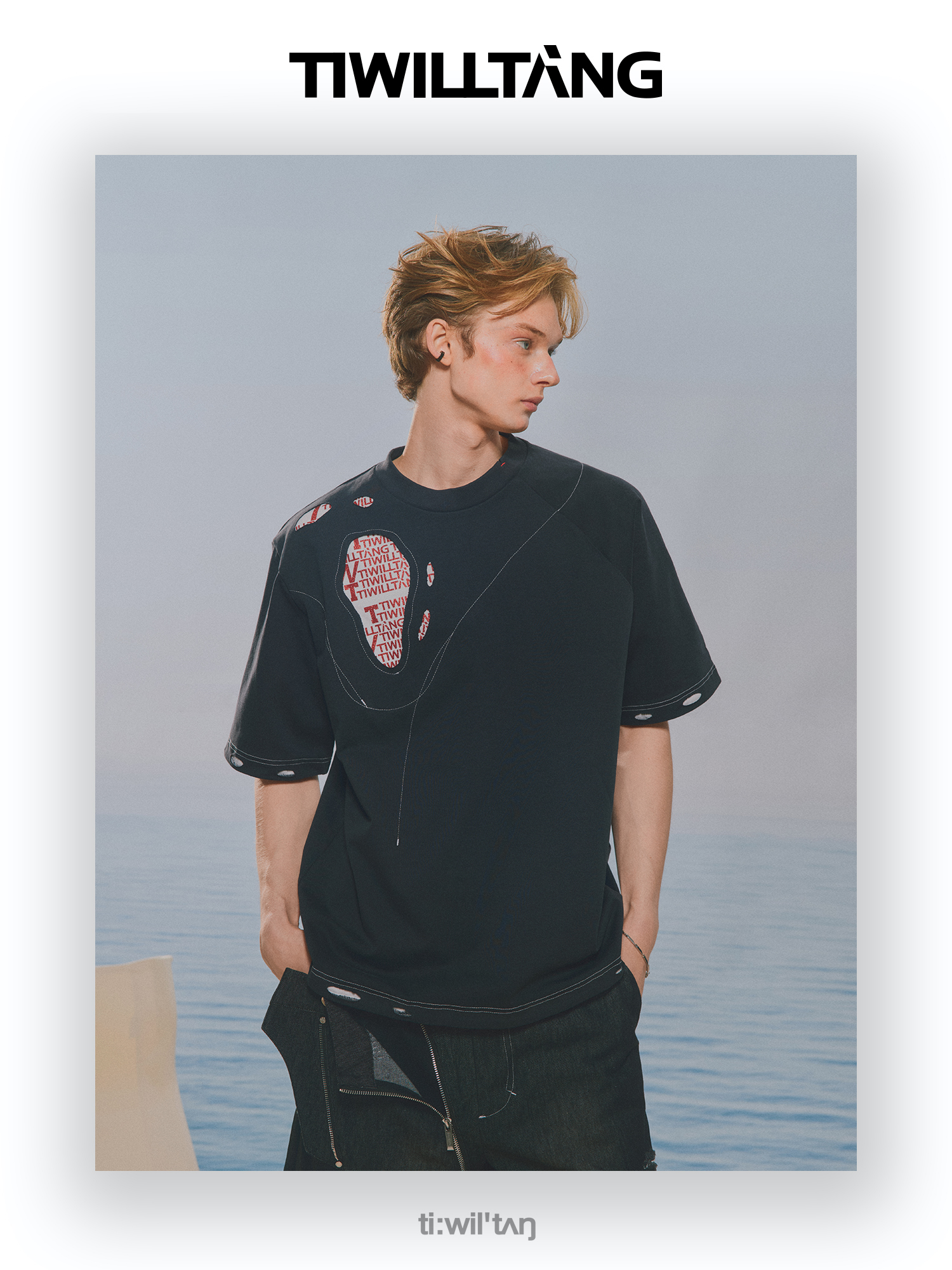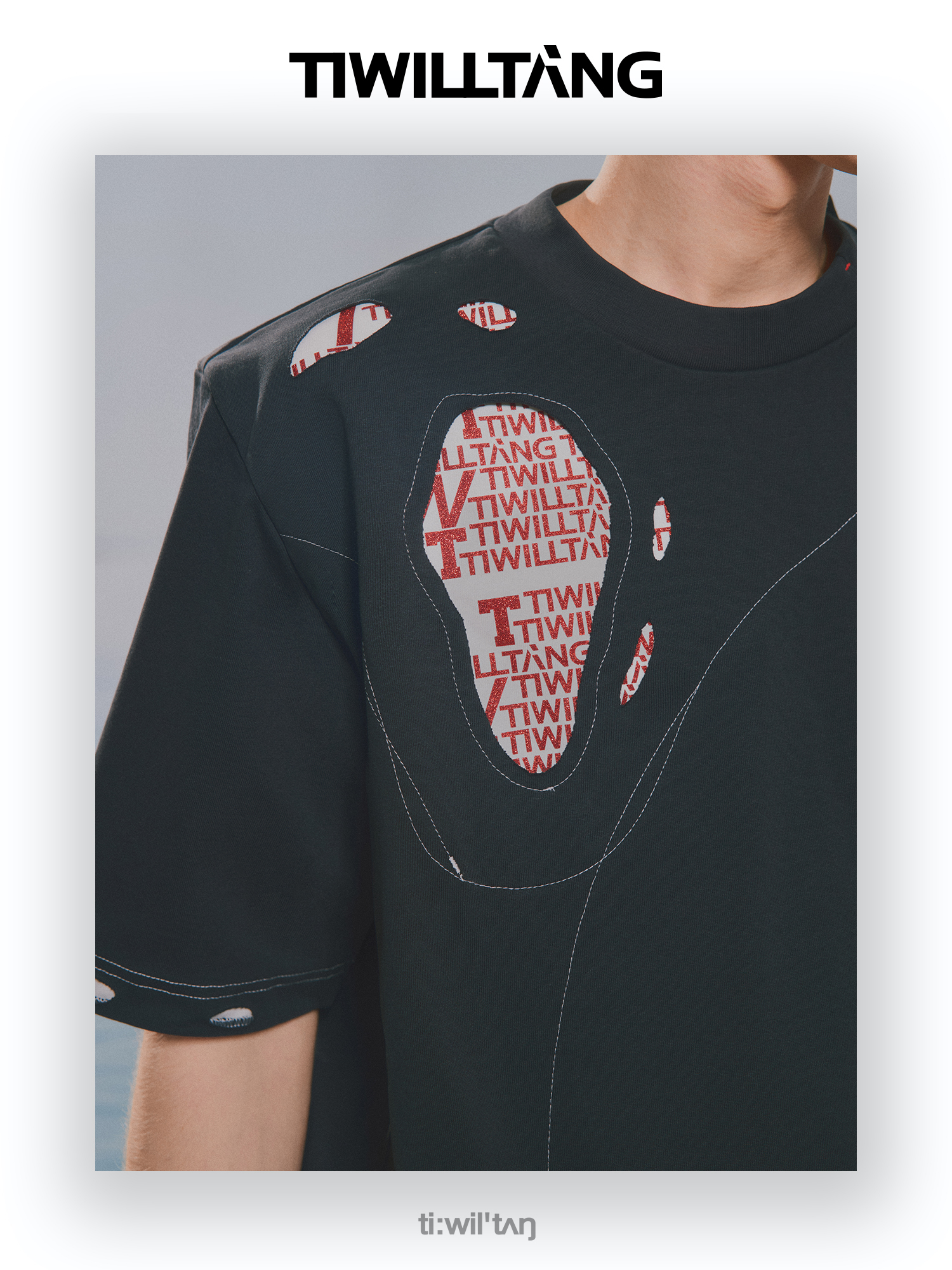 启世录TIWILLTANG“碎荧灼珲”破洞拼接短袖夏季纯棉圆领T恤上衣