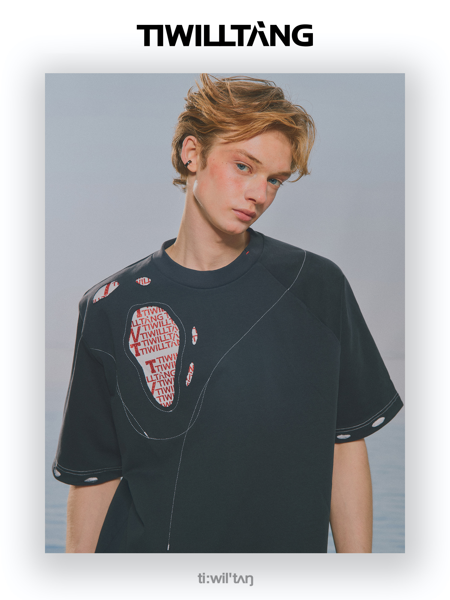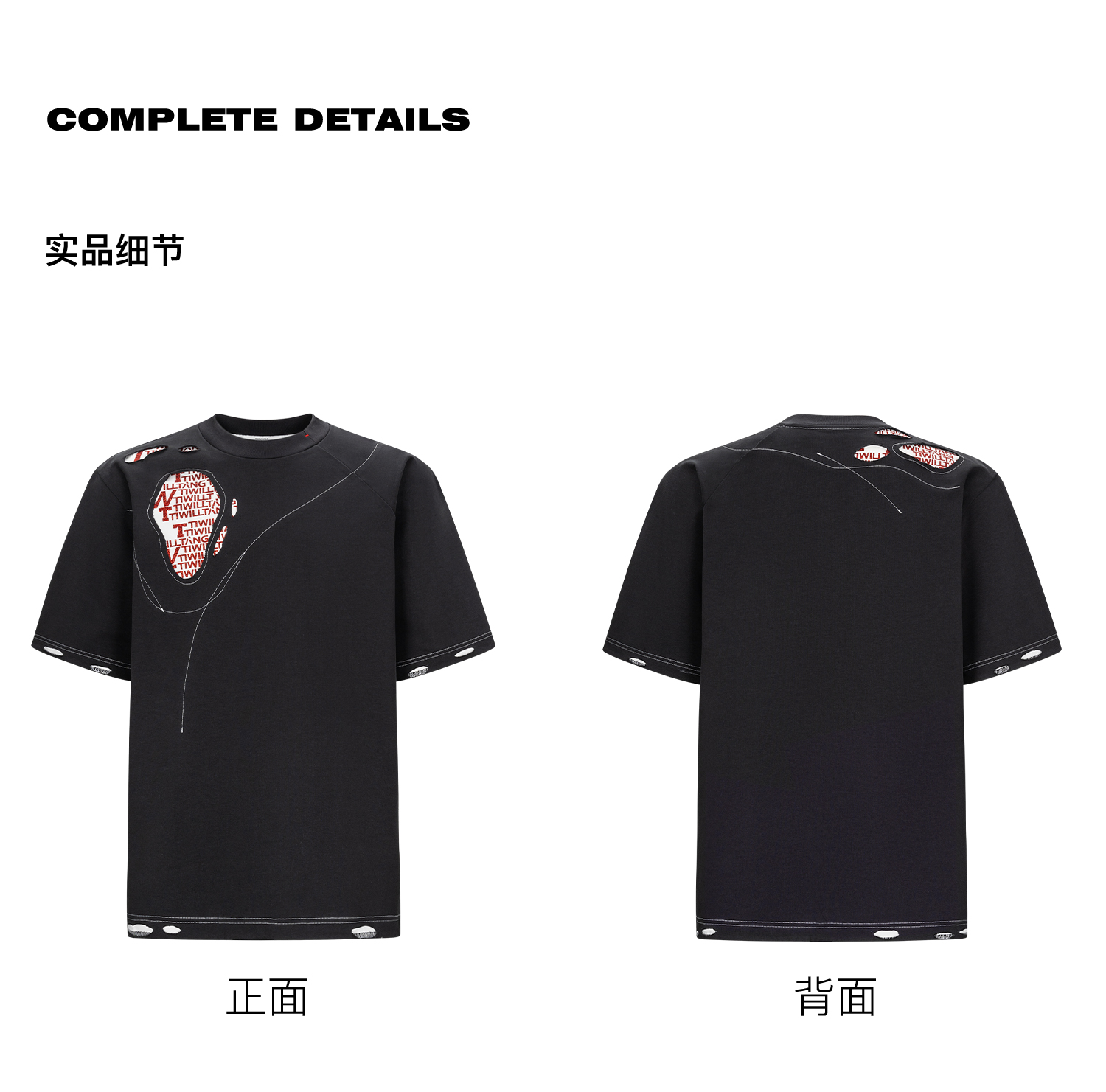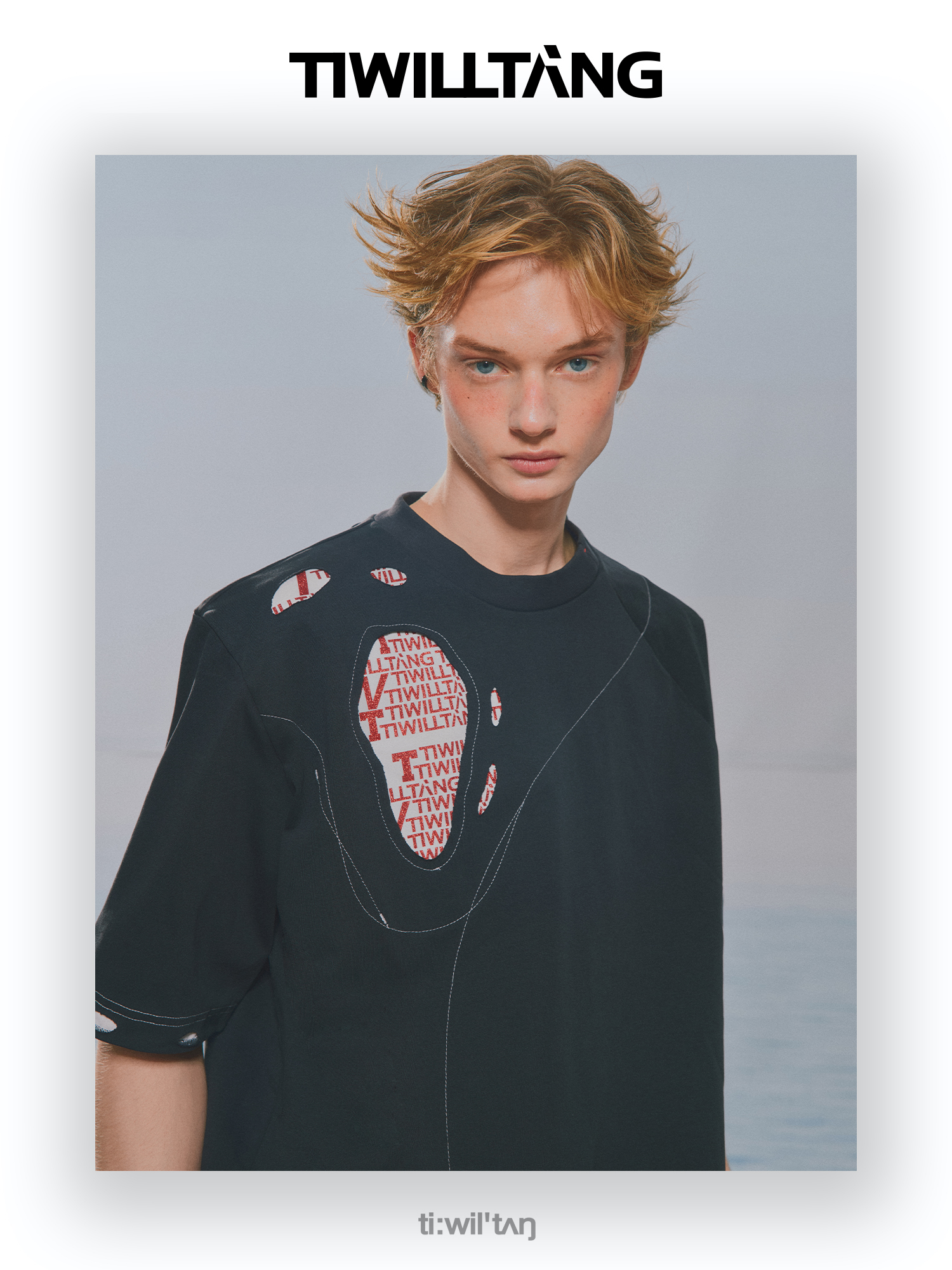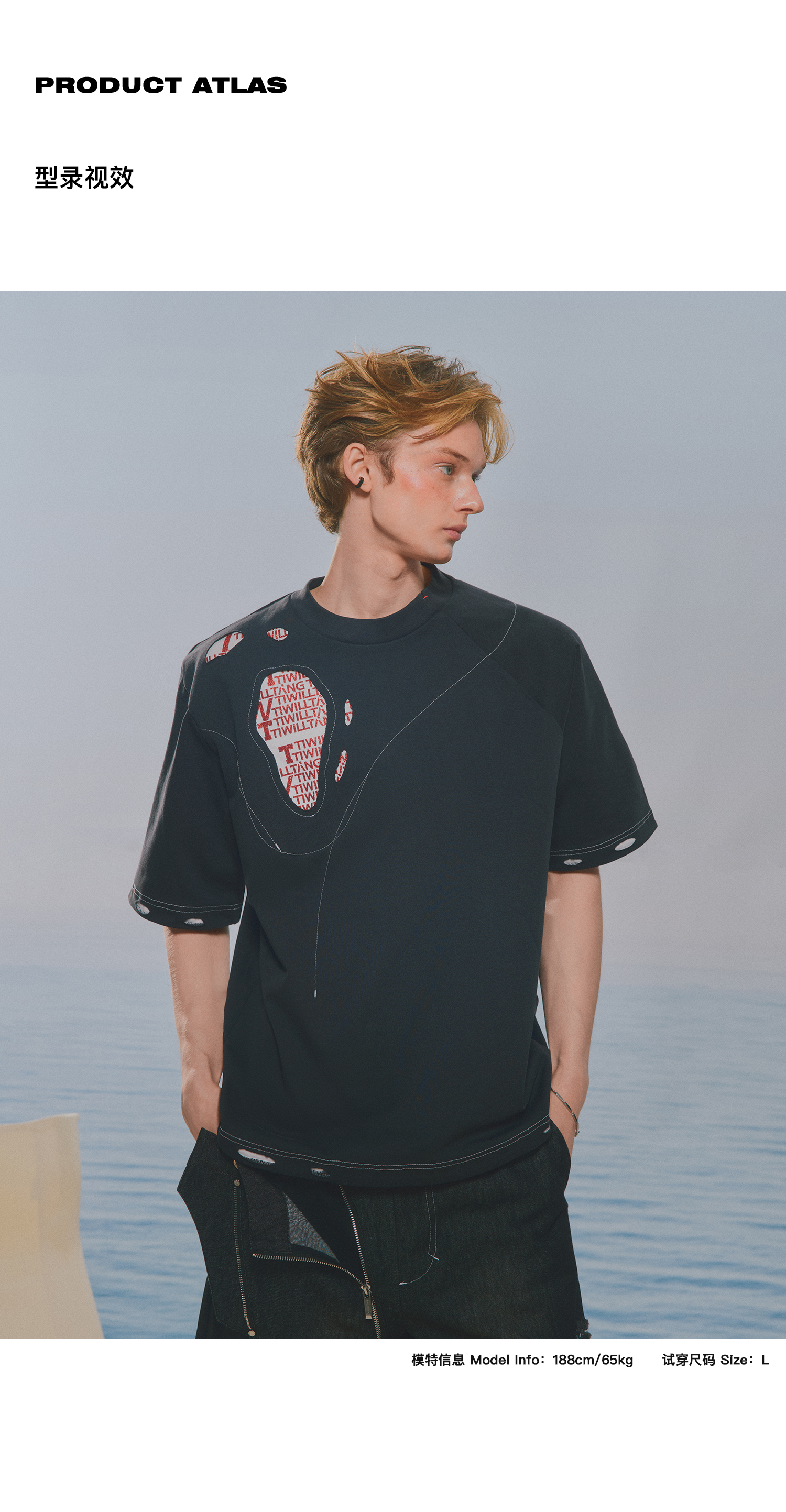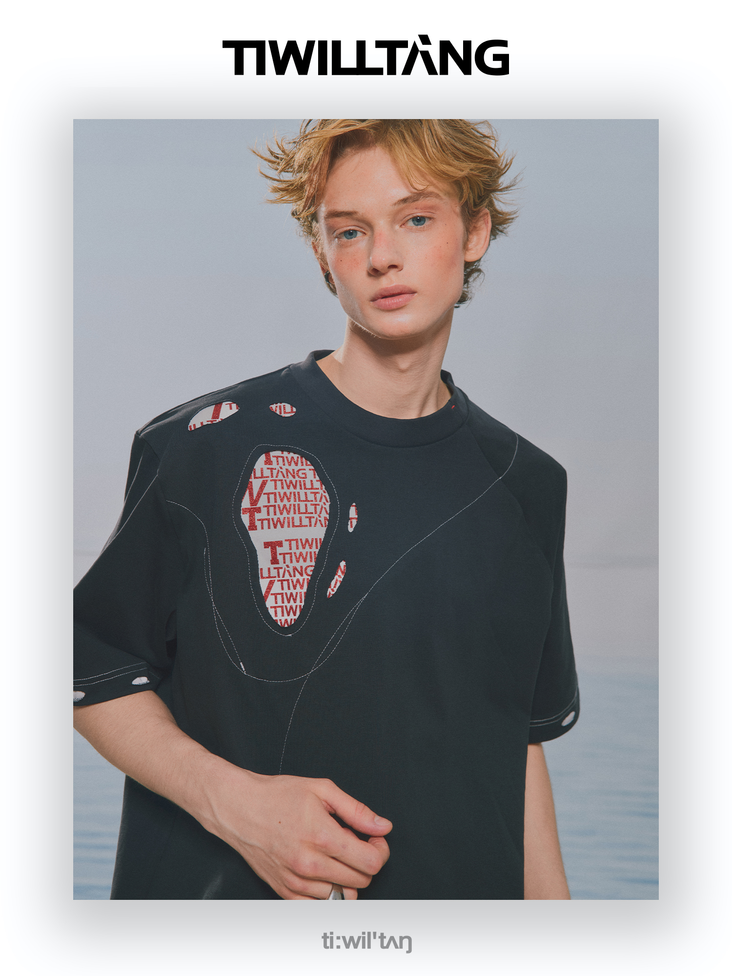 启世录TIWILLTANG“碎荧灼珲”破洞拼接短袖夏季纯棉圆领T恤上衣