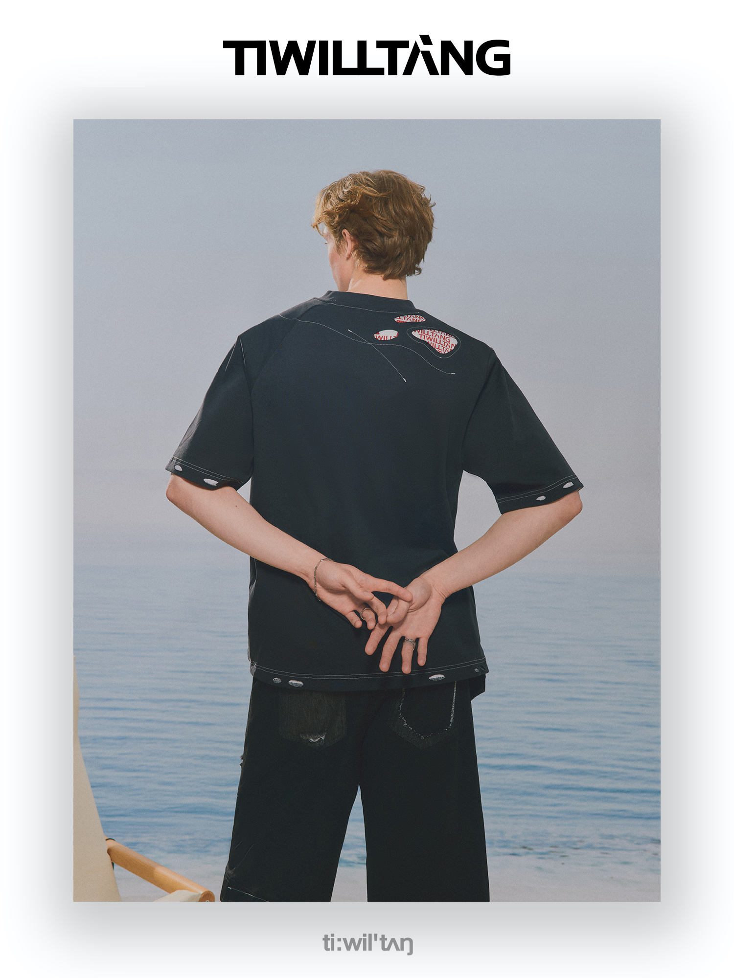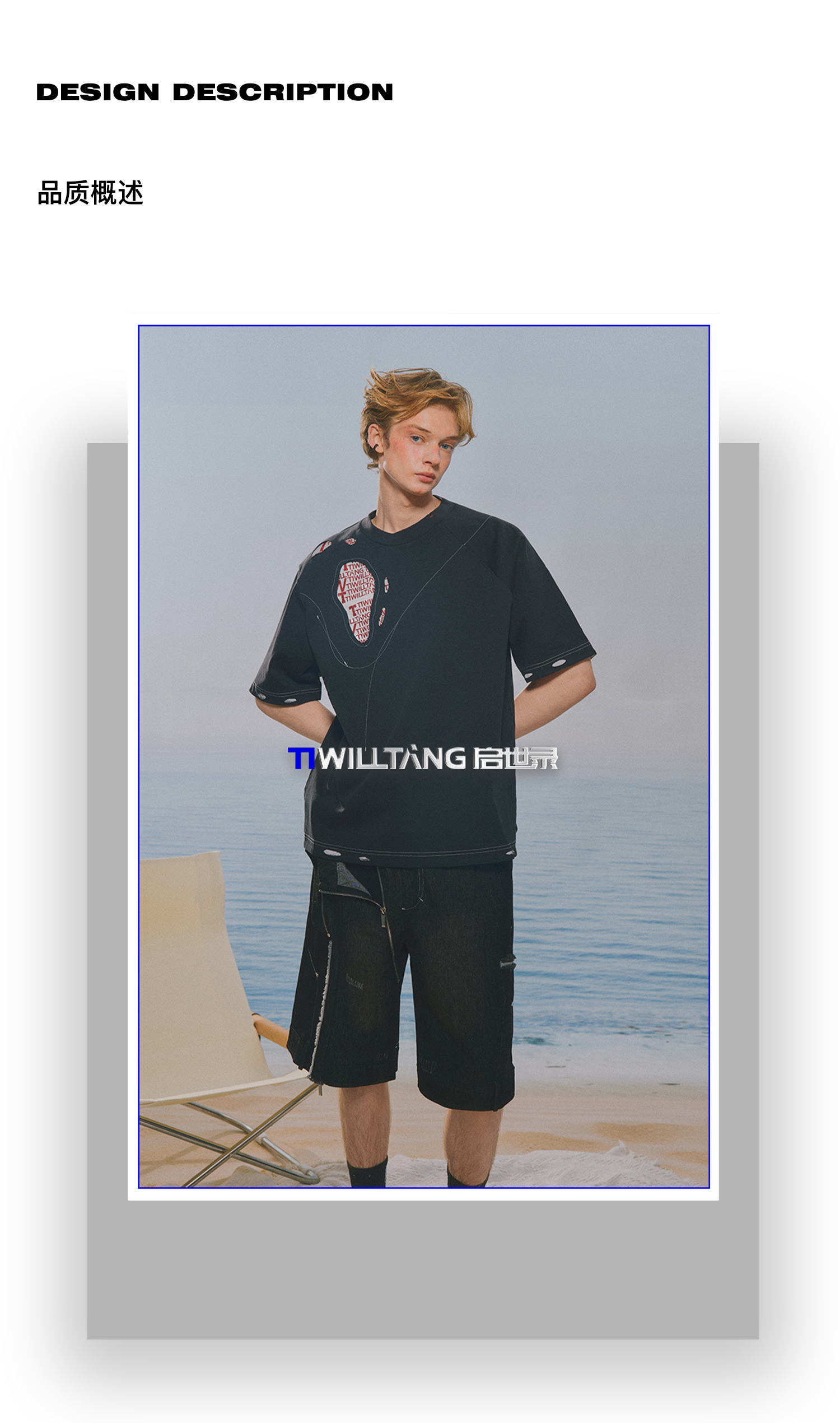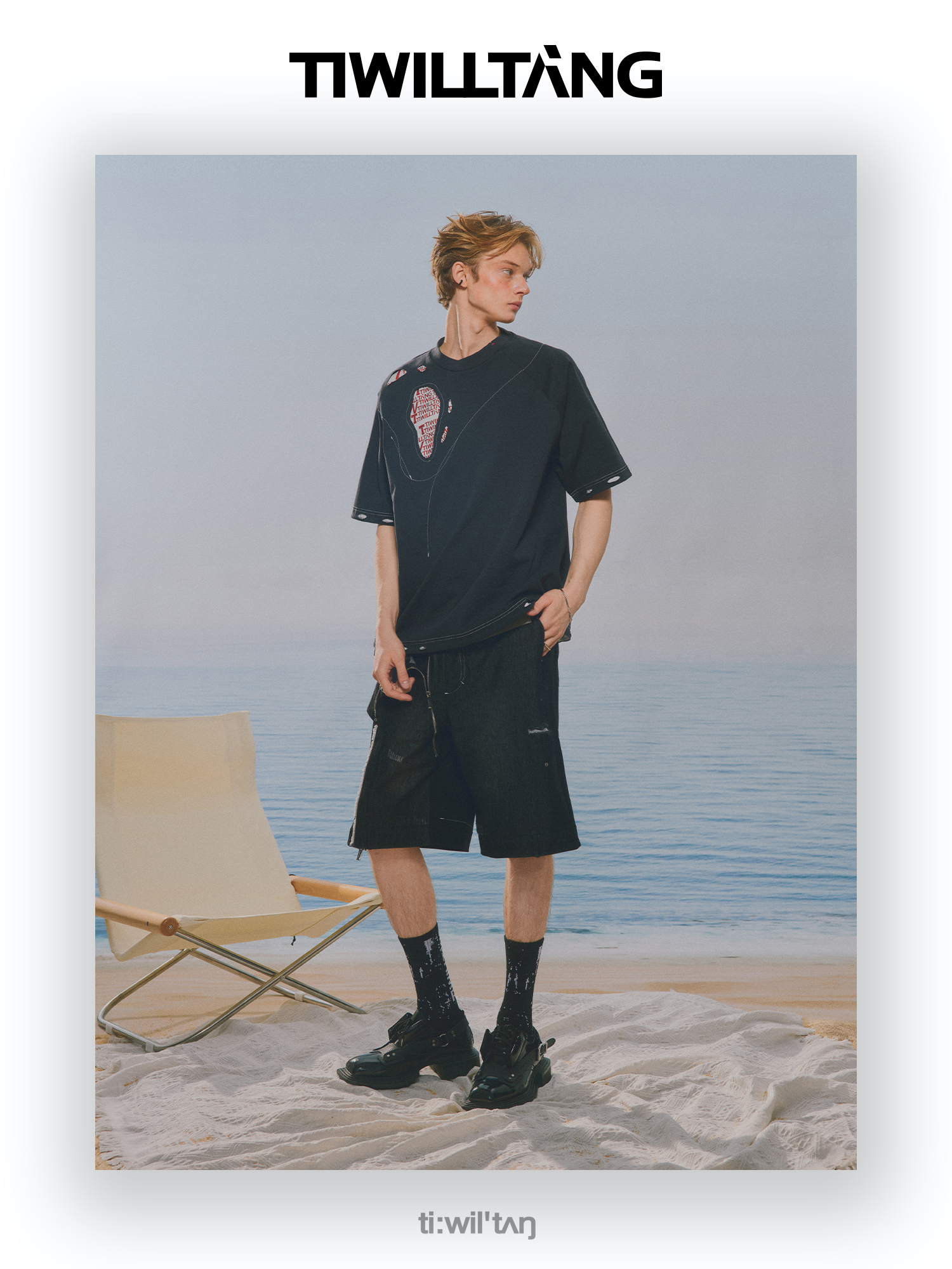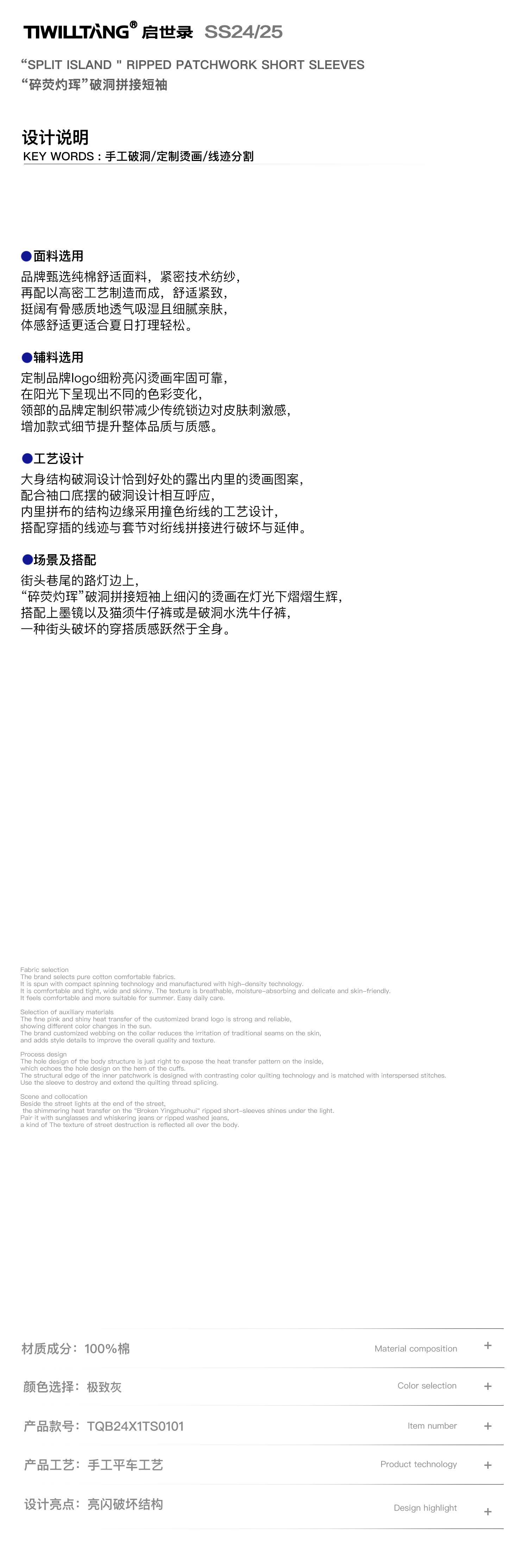 启世录TIWILLTANG“碎荧灼珲”破洞拼接短袖夏季纯棉圆领T恤上衣