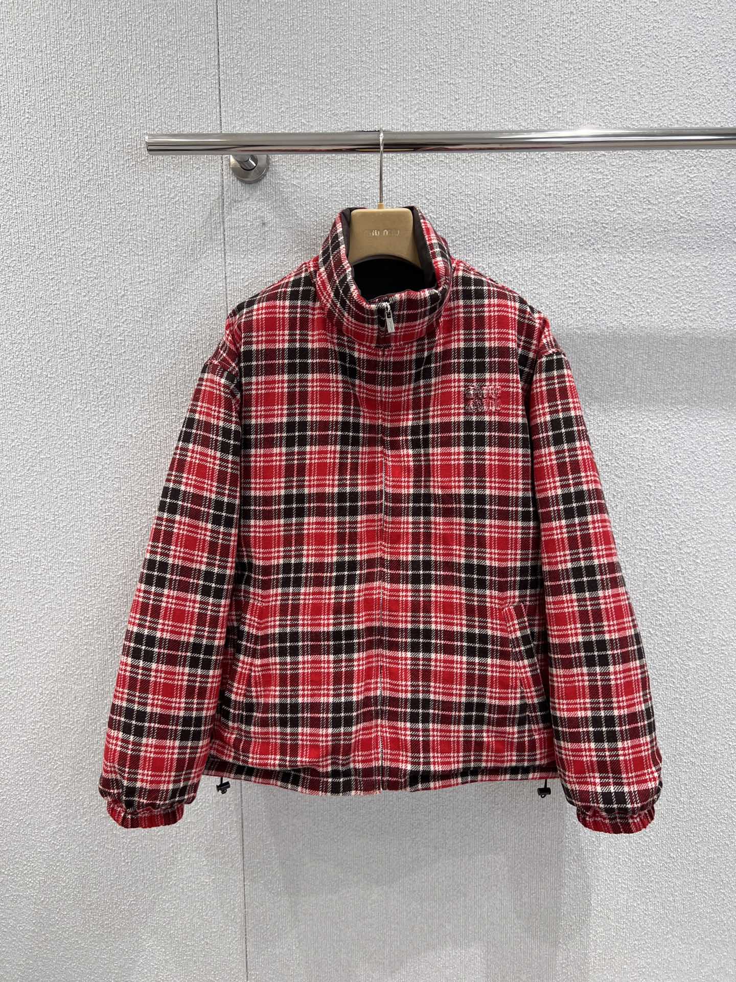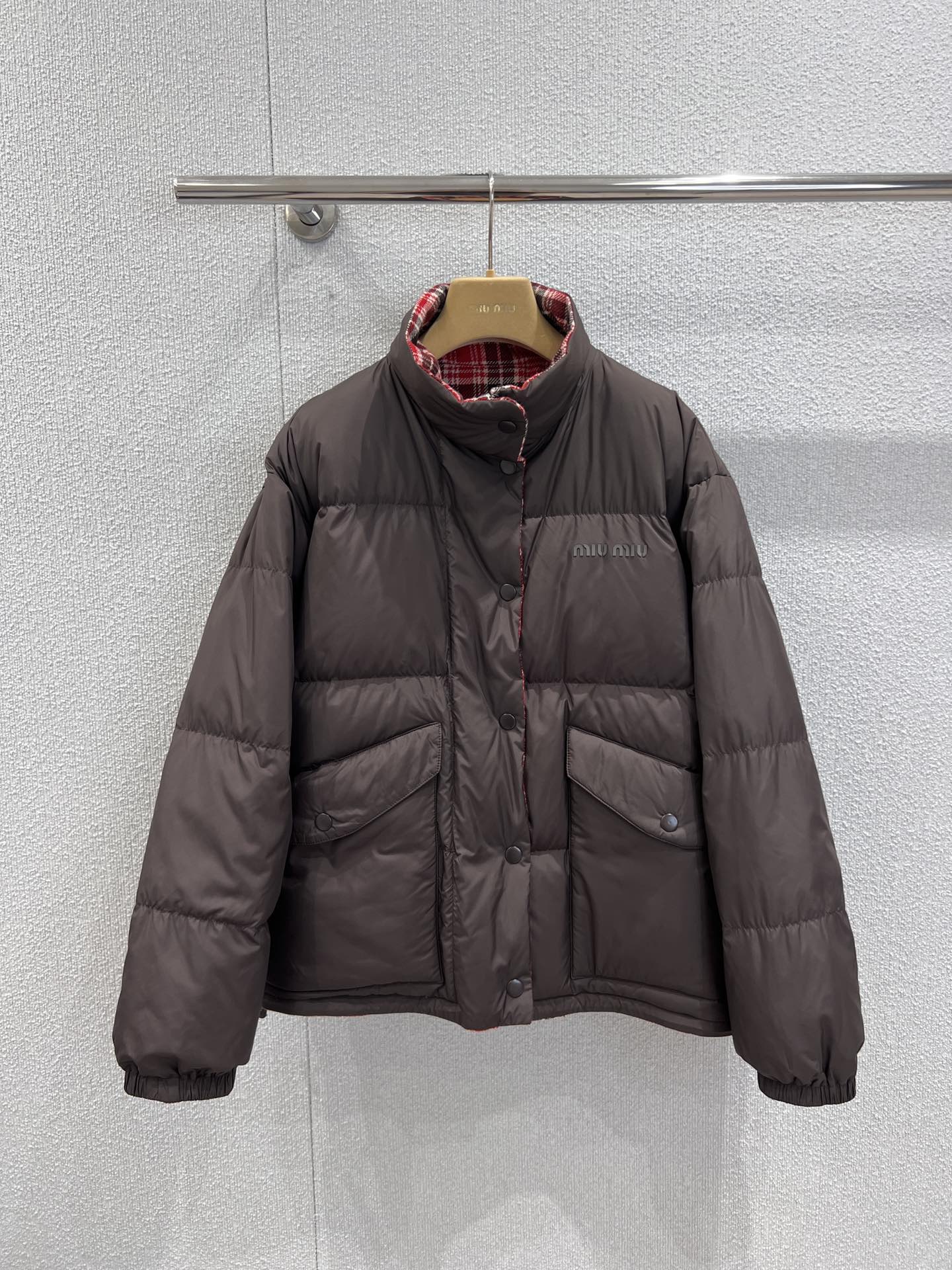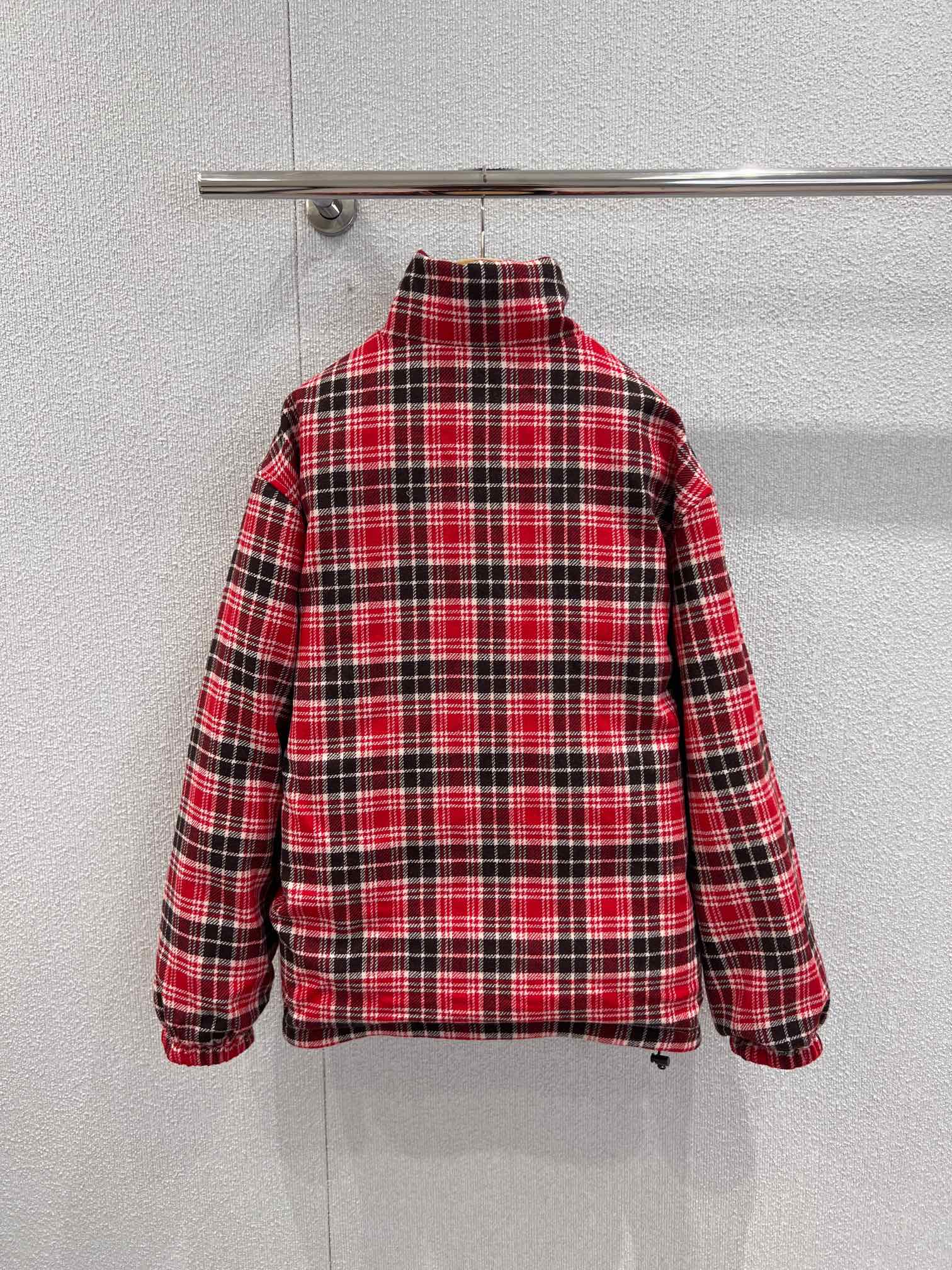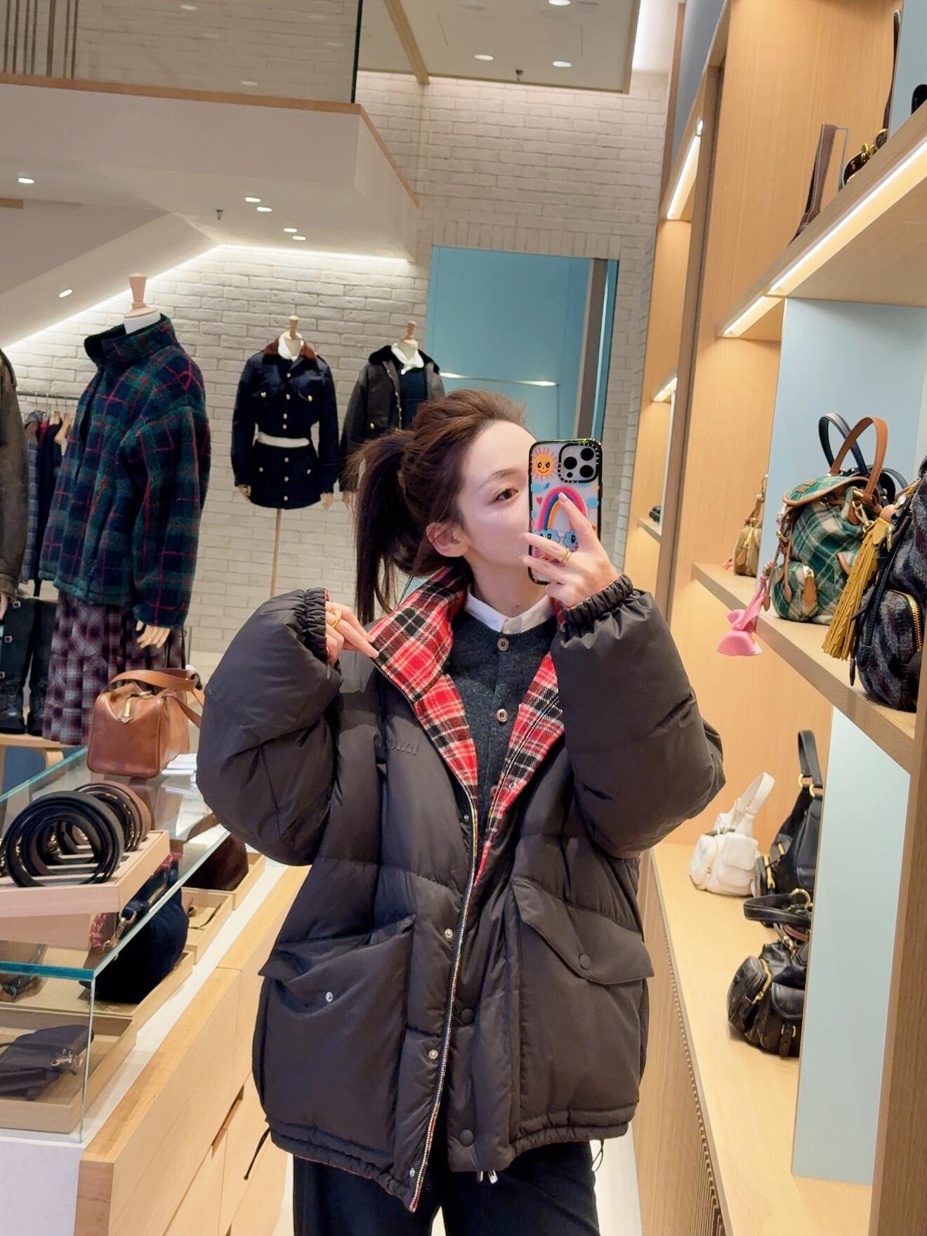 Miumi* 25FW秋冬新款 双面穿立领羽绒服外套丨⚠独家yb开发!顶级高版出品!以os宽松版型诠释随性慵懒的少女格调。一面是红黑羊毛格纹的复古英伦风情,一面是深棕哑光的低调奢华,双面切换解锁多元穿搭场景。立领设计兼顾保暖与利落线条,蓬松填充轻量又锁温,将miu系甜酷美学与秋冬实穿性完美融合,是衣橱的点睛之选。现货发售S/M/L