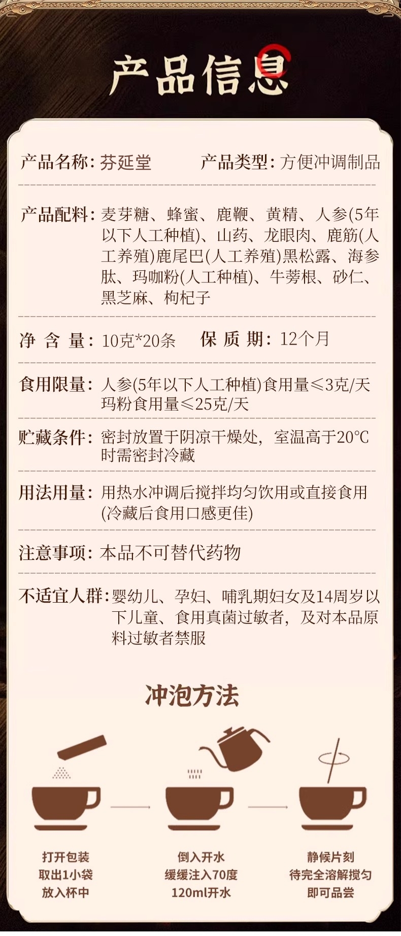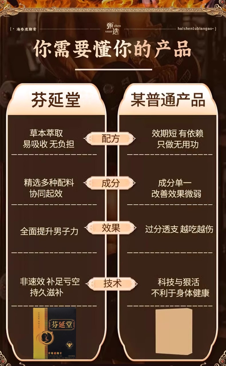 芬延堂作用与功效是强身健体,壮阳益肾等。芬延堂是将黄精、鹿鞭、鹿筋、龙眼肉等优质的原材料按科学配比匠心制作而成,不仅能够达到补益气血的作用与功效帮助改善气血不足所引起的乏力、脸色苍白相关的症状,还具有增强体质补充精力,强肾壮阳的作用,可以快速的补充体力,保持精力充沛,活力满满,也可以提升性能力,让男性拥有更强的战斗力。